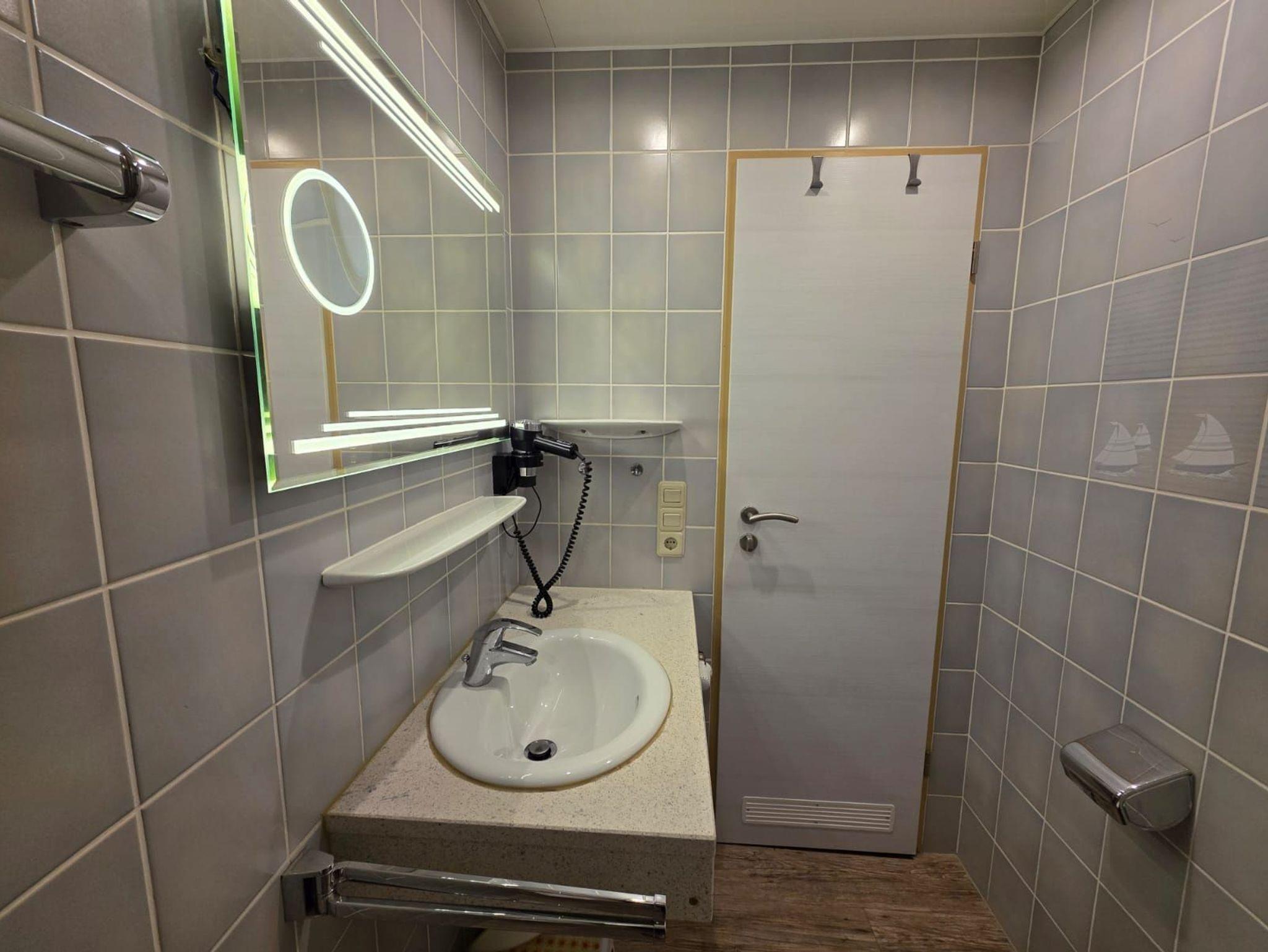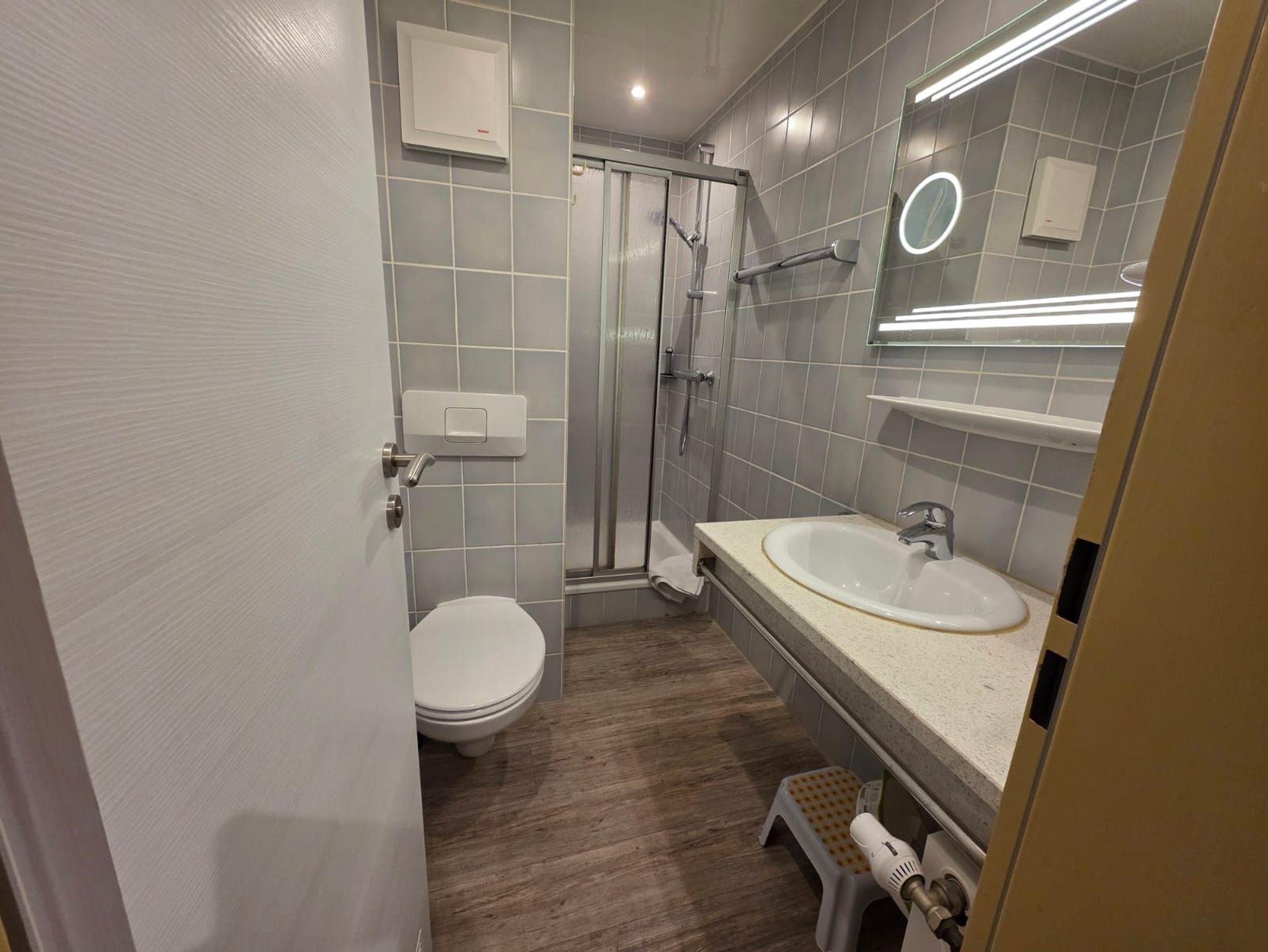 Badezimmer mit Dusche, Waschtisch und WC