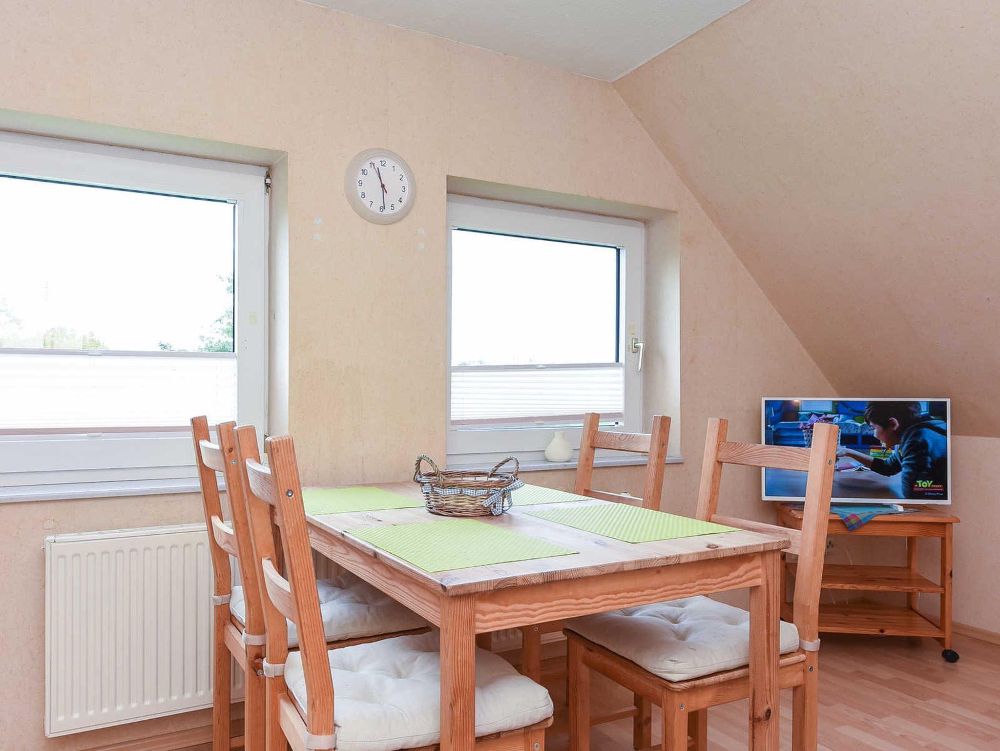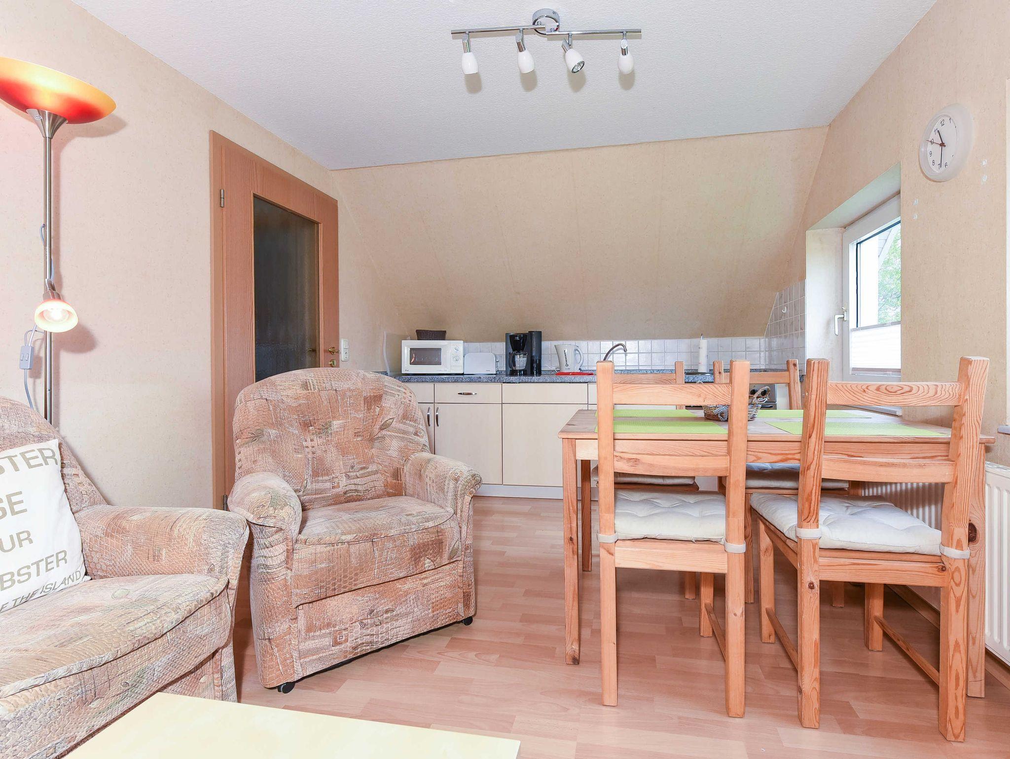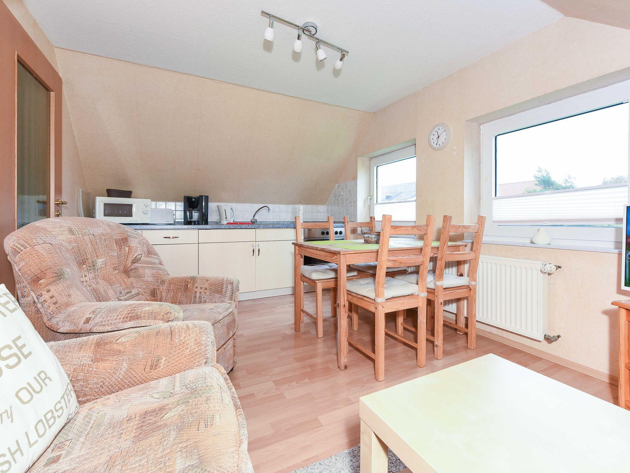 Größe ca. 45 Quadratmeter, Wohnküche mit Essgruppe und Wohnzimmer-Garnitur, Schlafzimmer, zweites separates Schlafzimmer/Kinderzimmer, Badezimmer mit Dusche, Waschtisch und WC, Obergeschoss, optimal für 2 bis 4 Personen und zusätzlich ein Kleinkind.