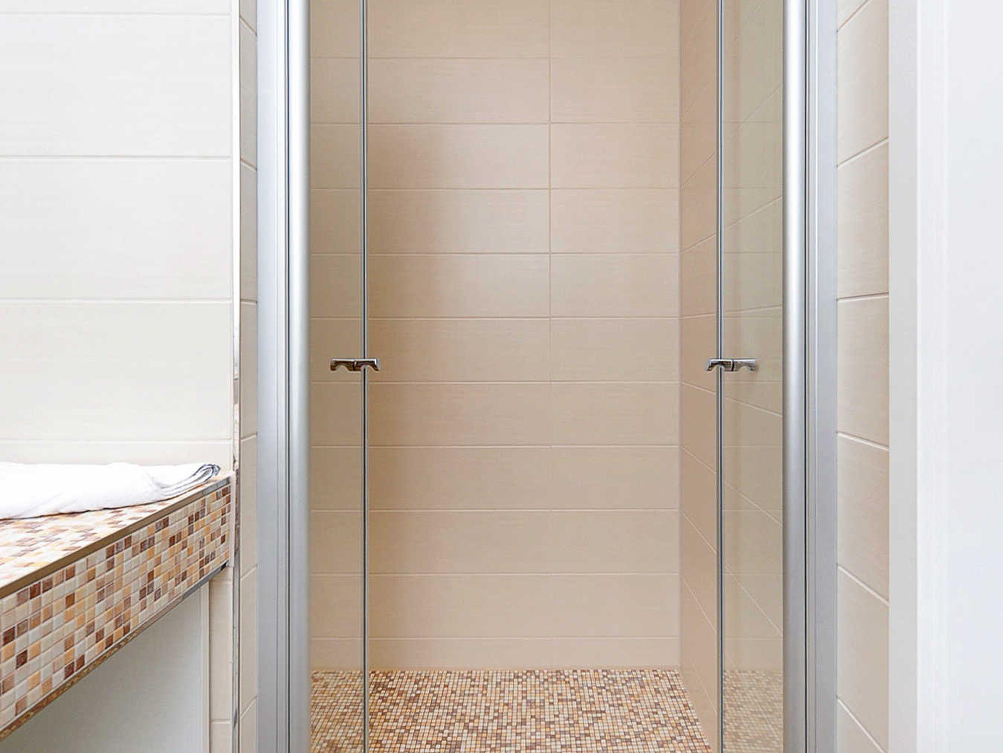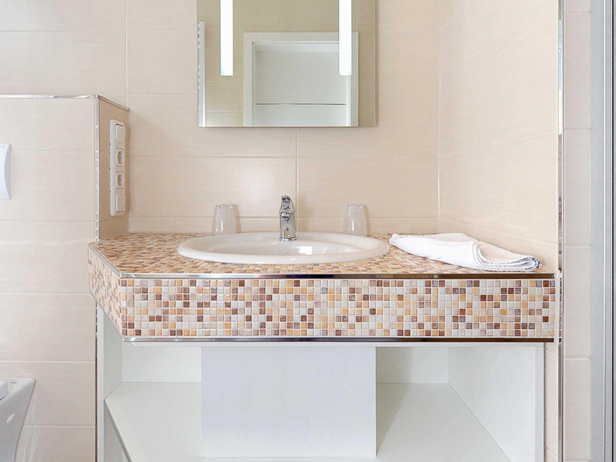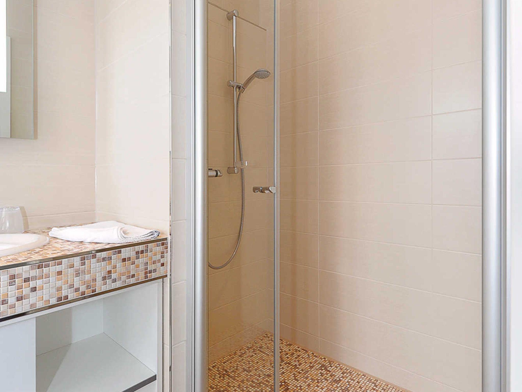 Badezimmer mit Dusche, Waschtisch und WC