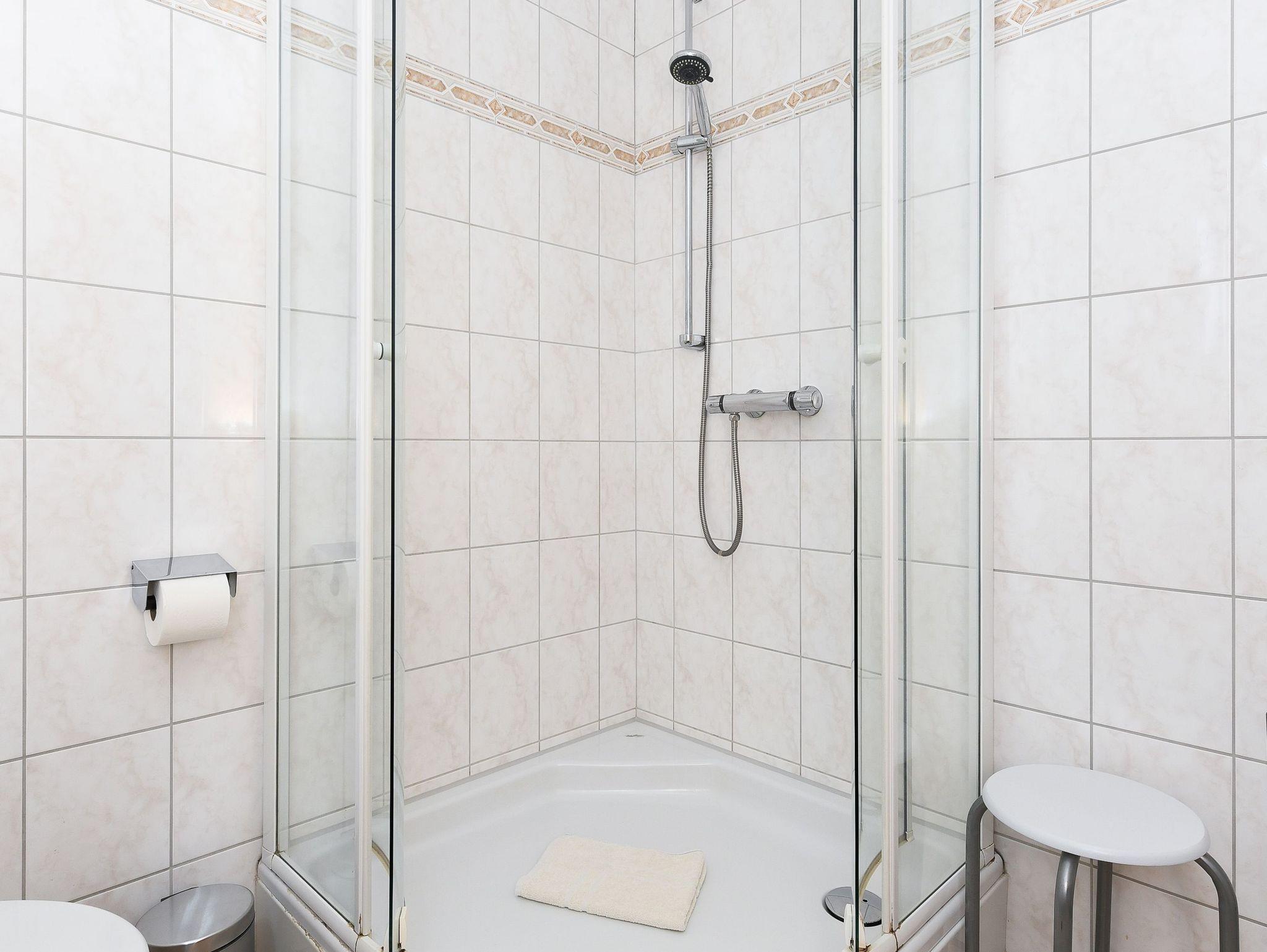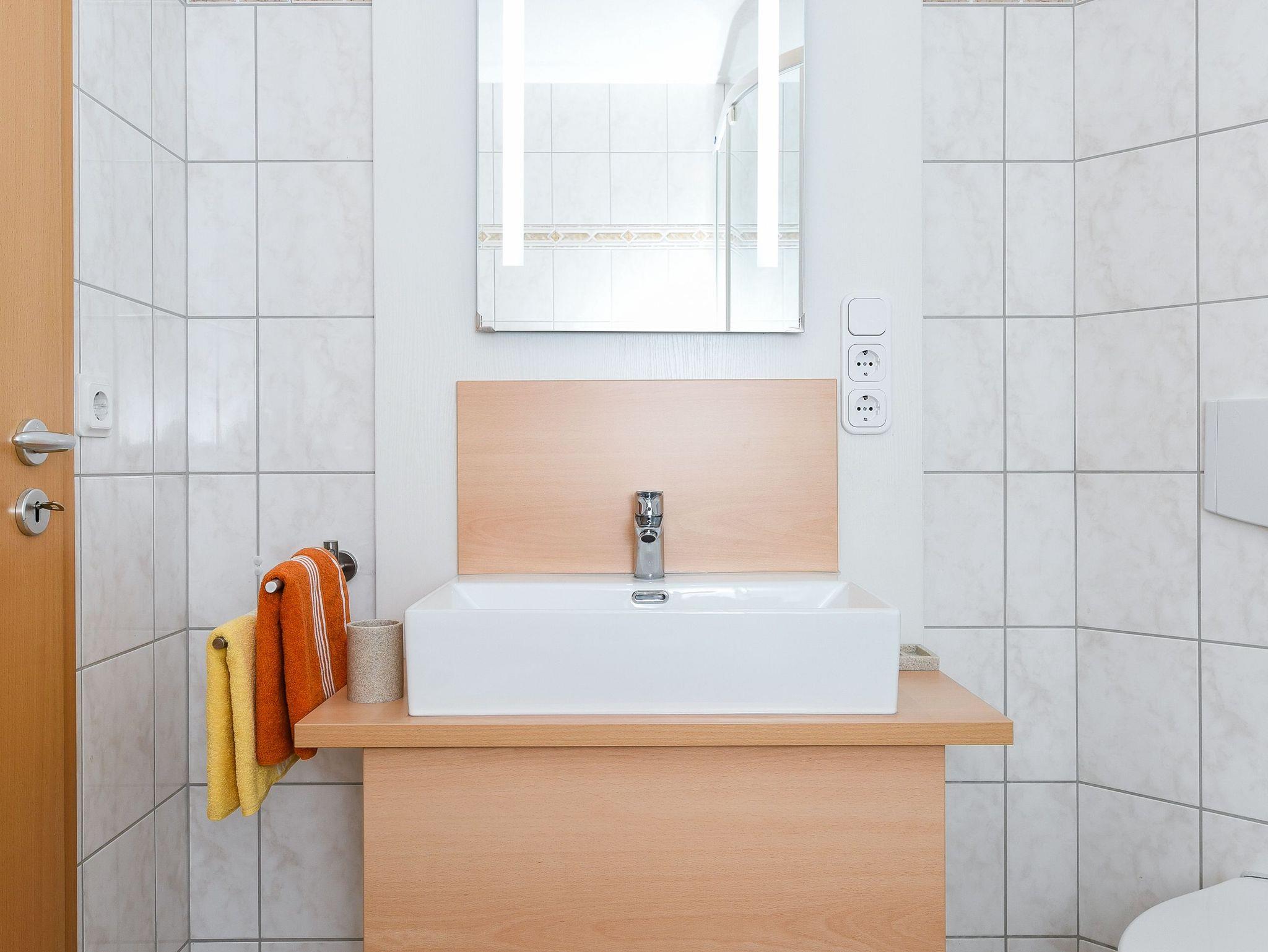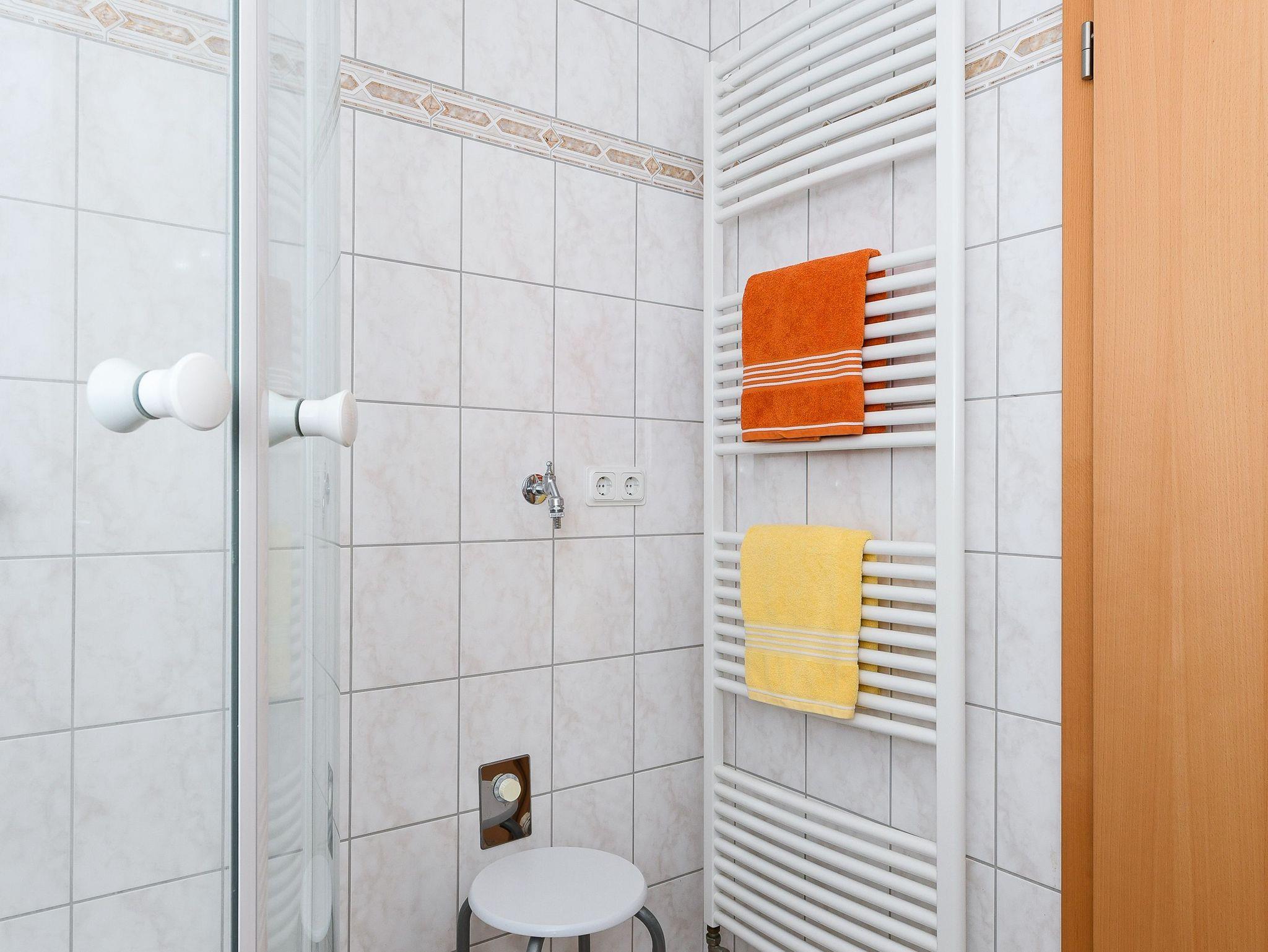 Badezimmer mit Dusche, Waschtisch und WC