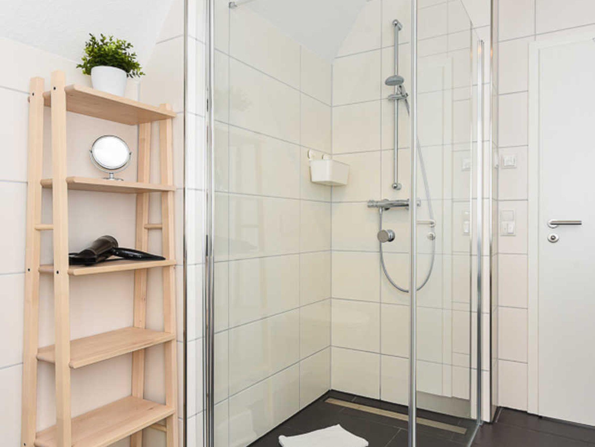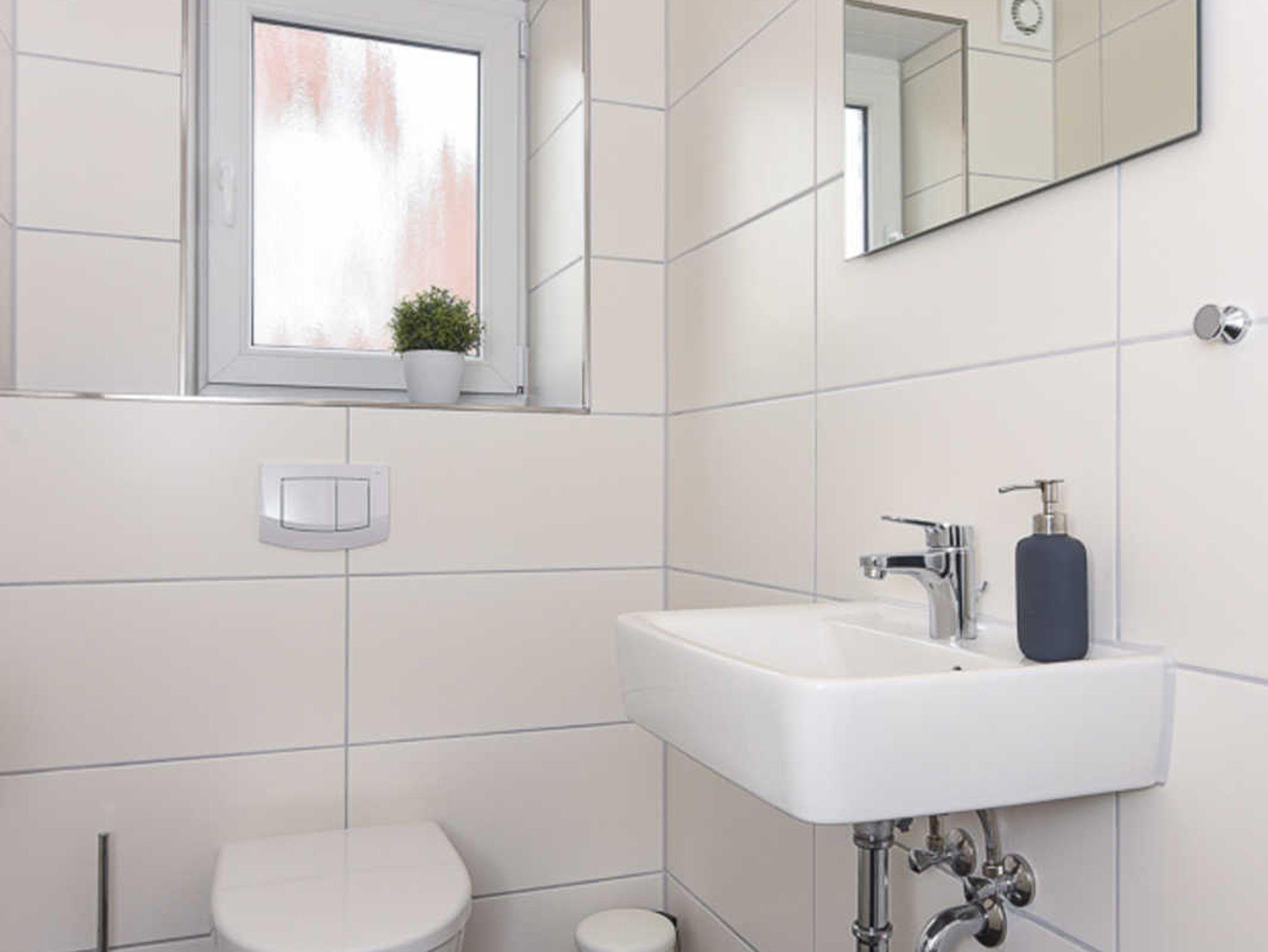 Badezimmer mit Dusche, Waschtisch und WC