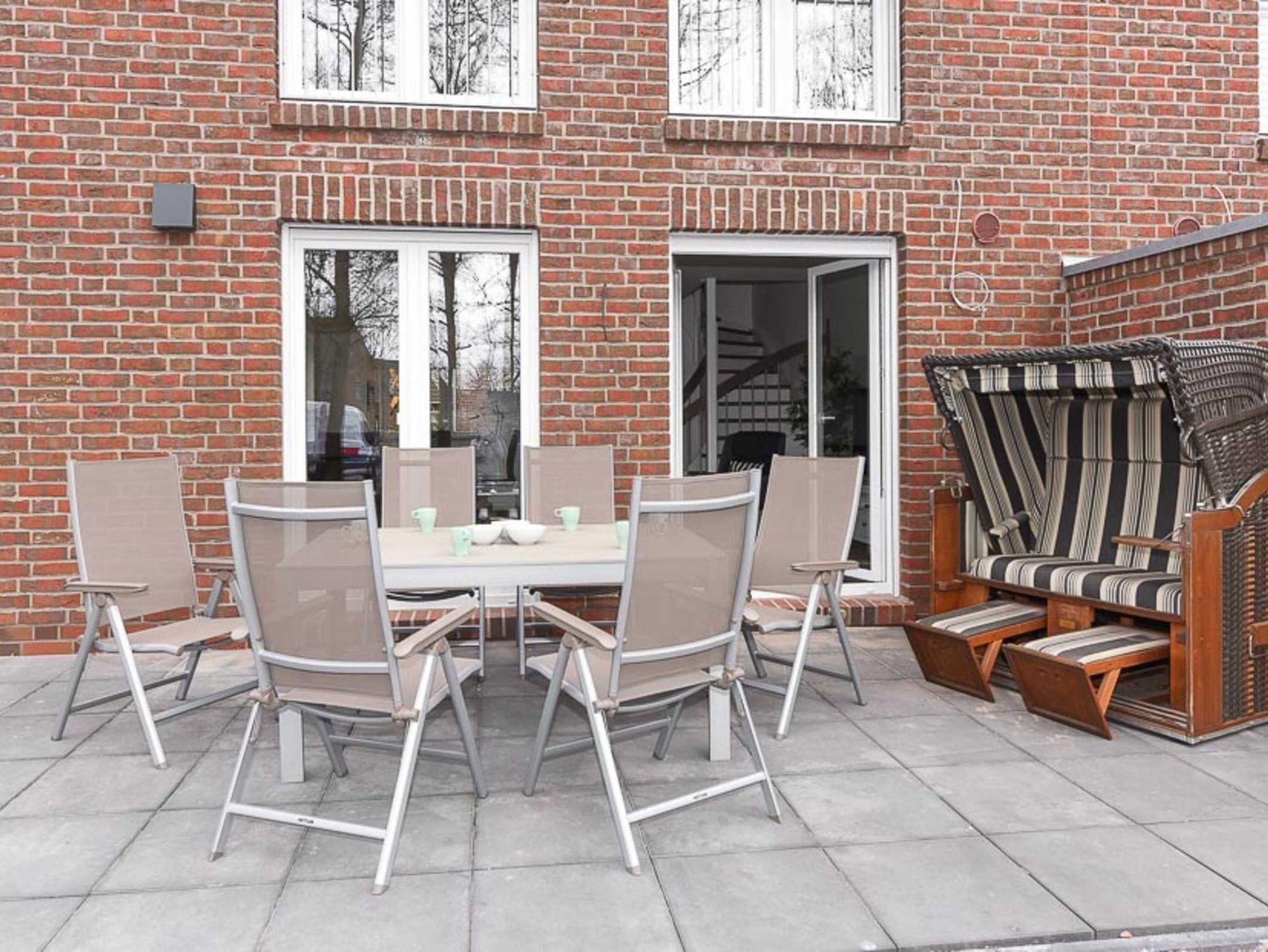Auf der Terrasse befindet sich ein Strandkorb.