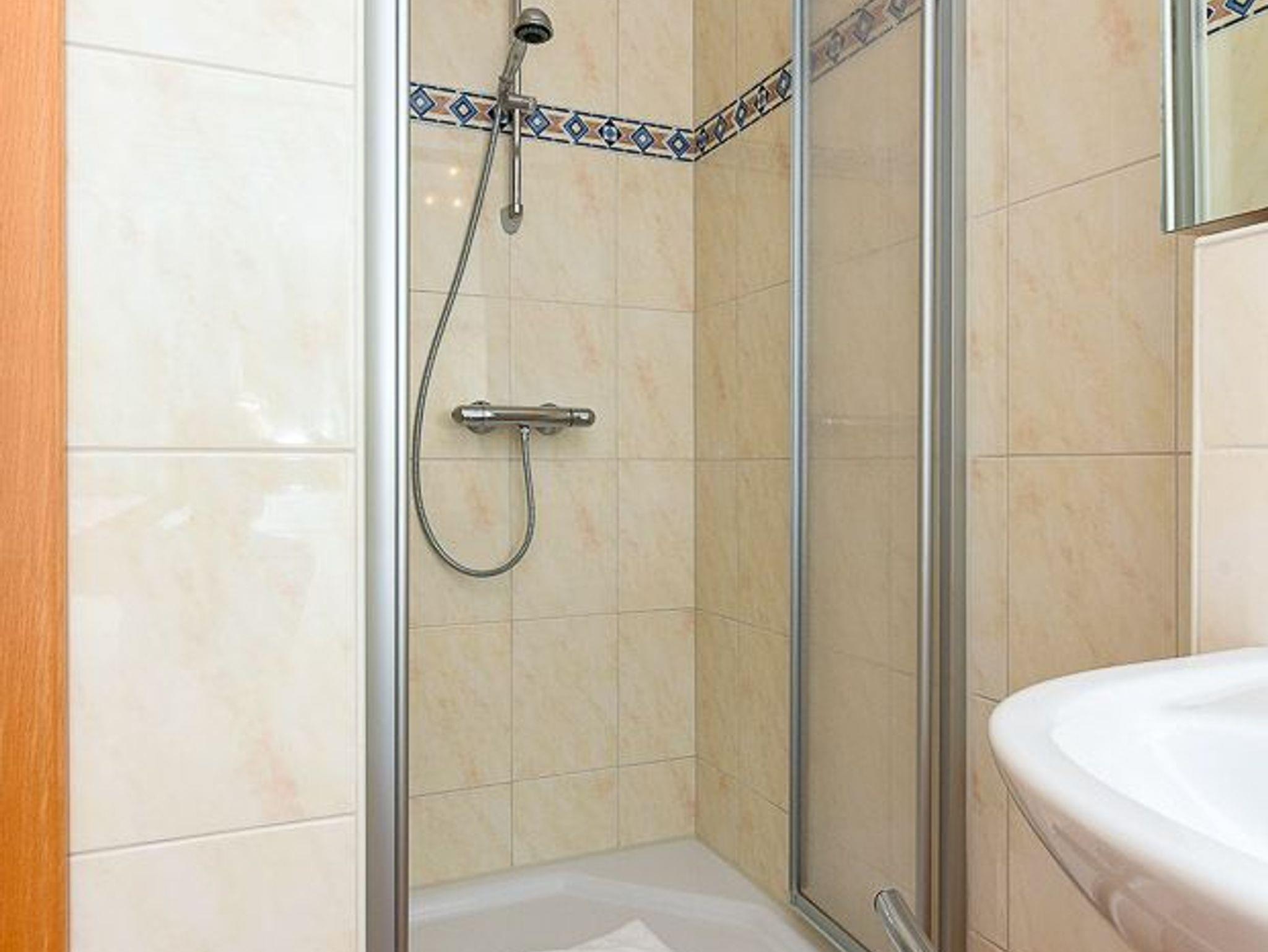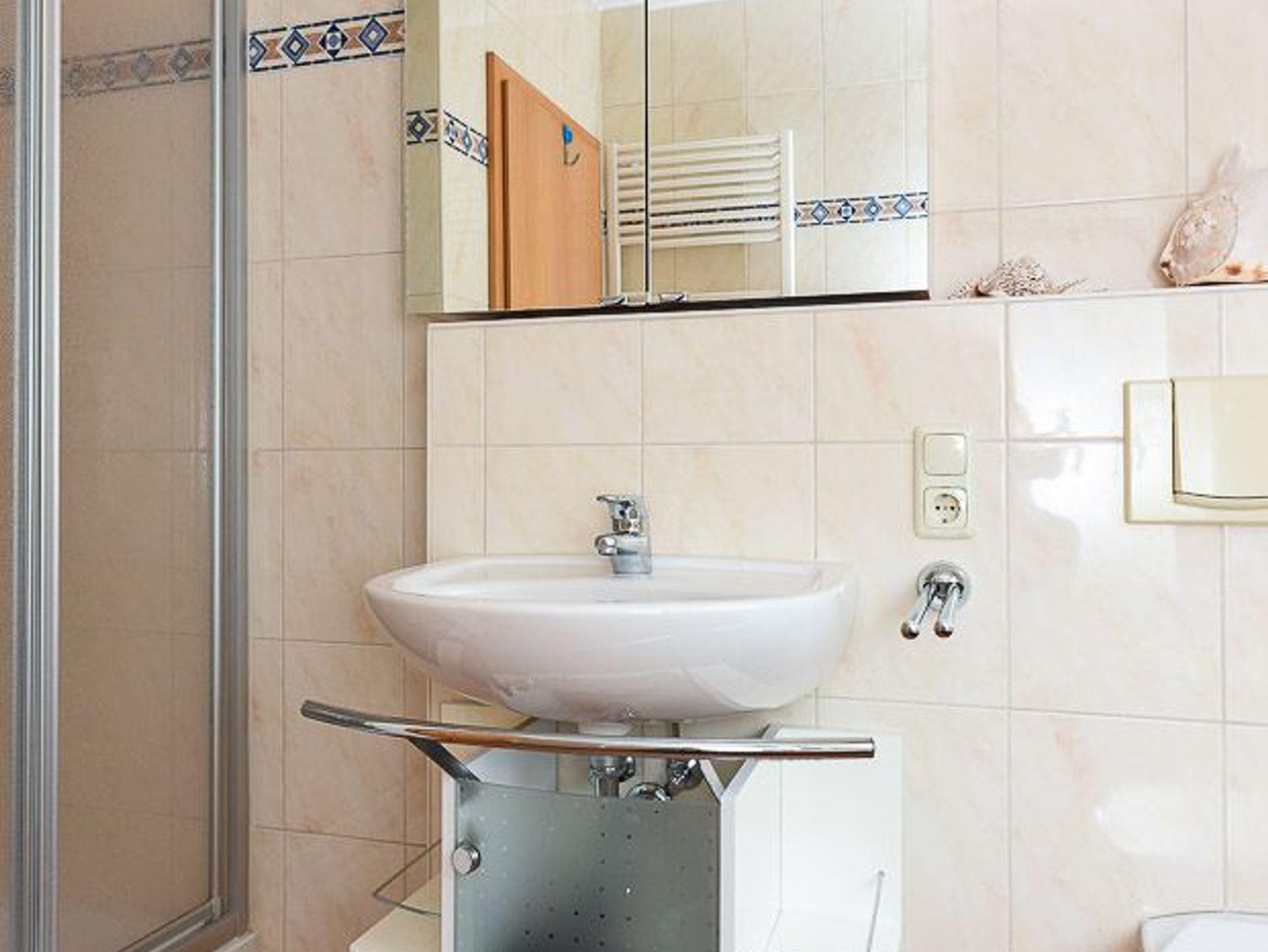 Badezimmer mit Dusche, Waschtisch und WC