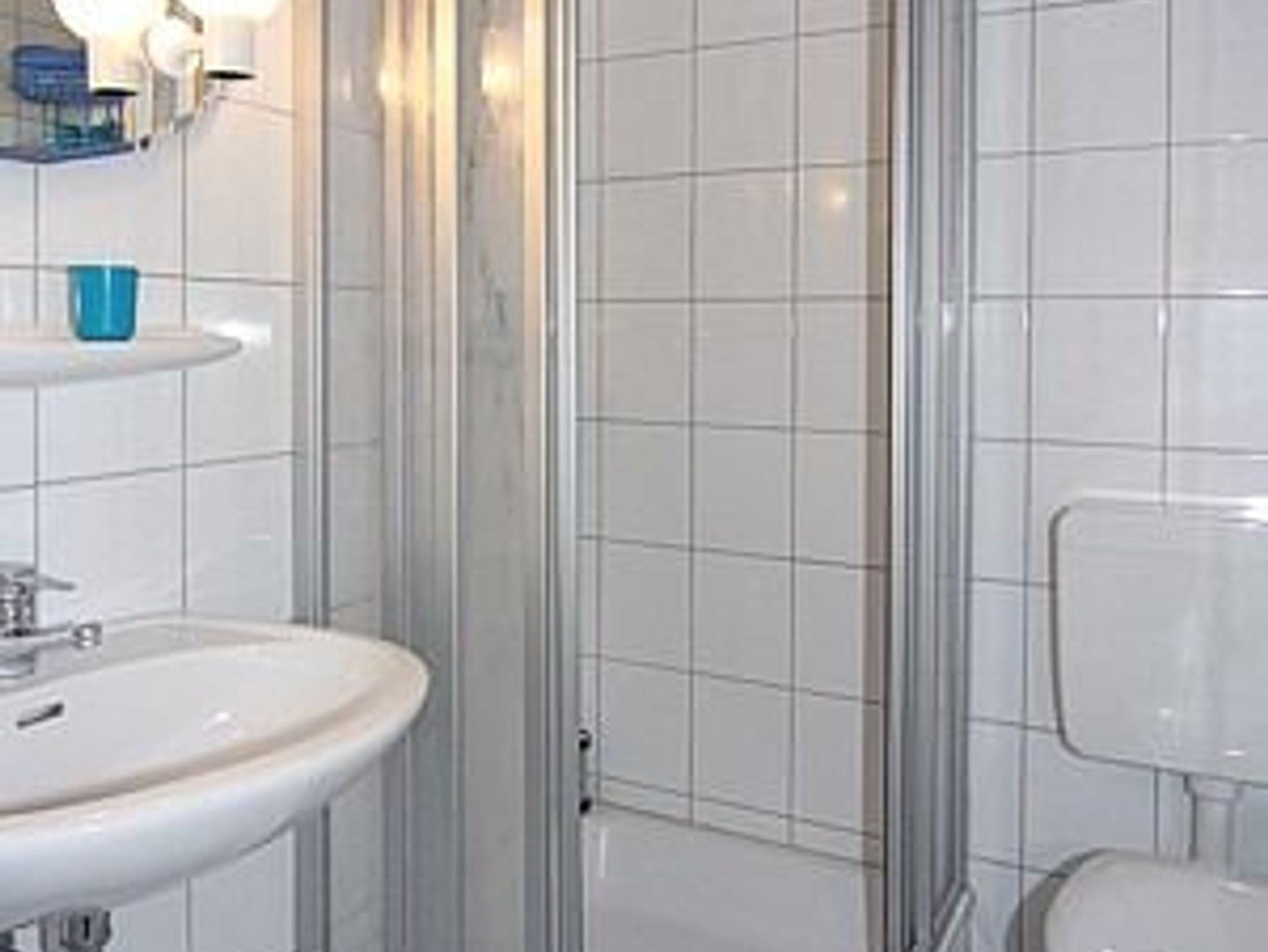 Badezimmer mit Dusche, Waschtisch und WC