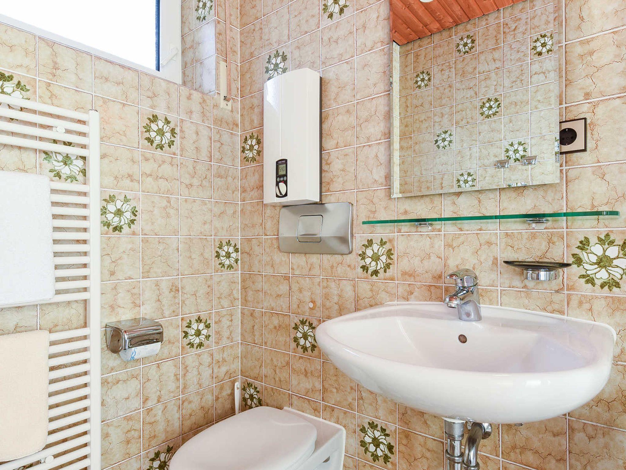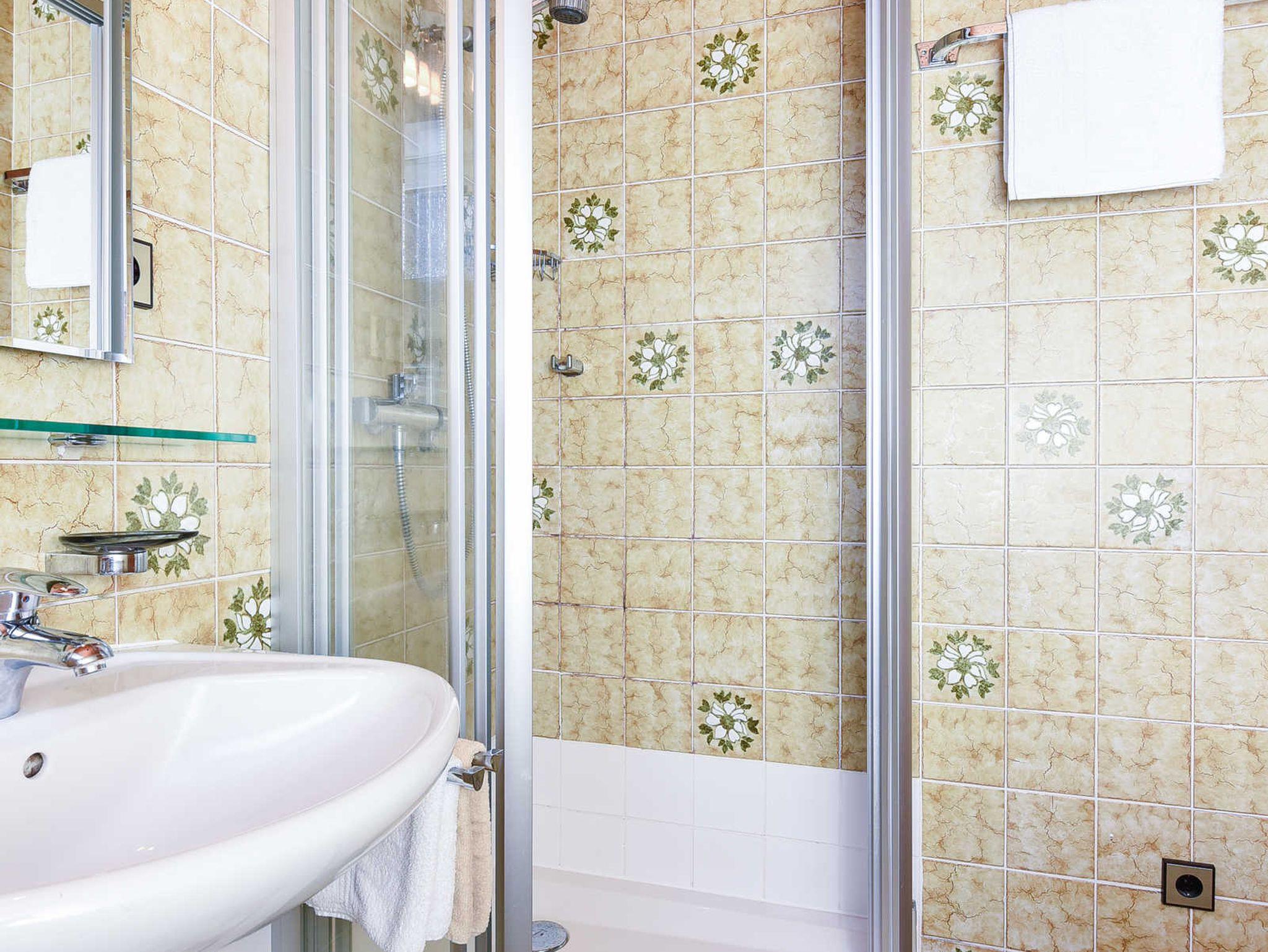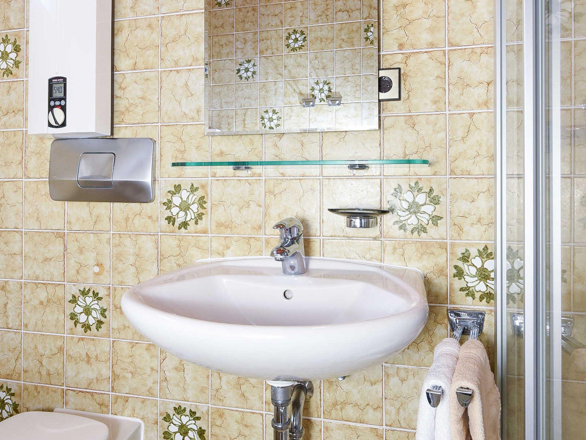 Badezimmer mit Dusche, Waschtisch und WC