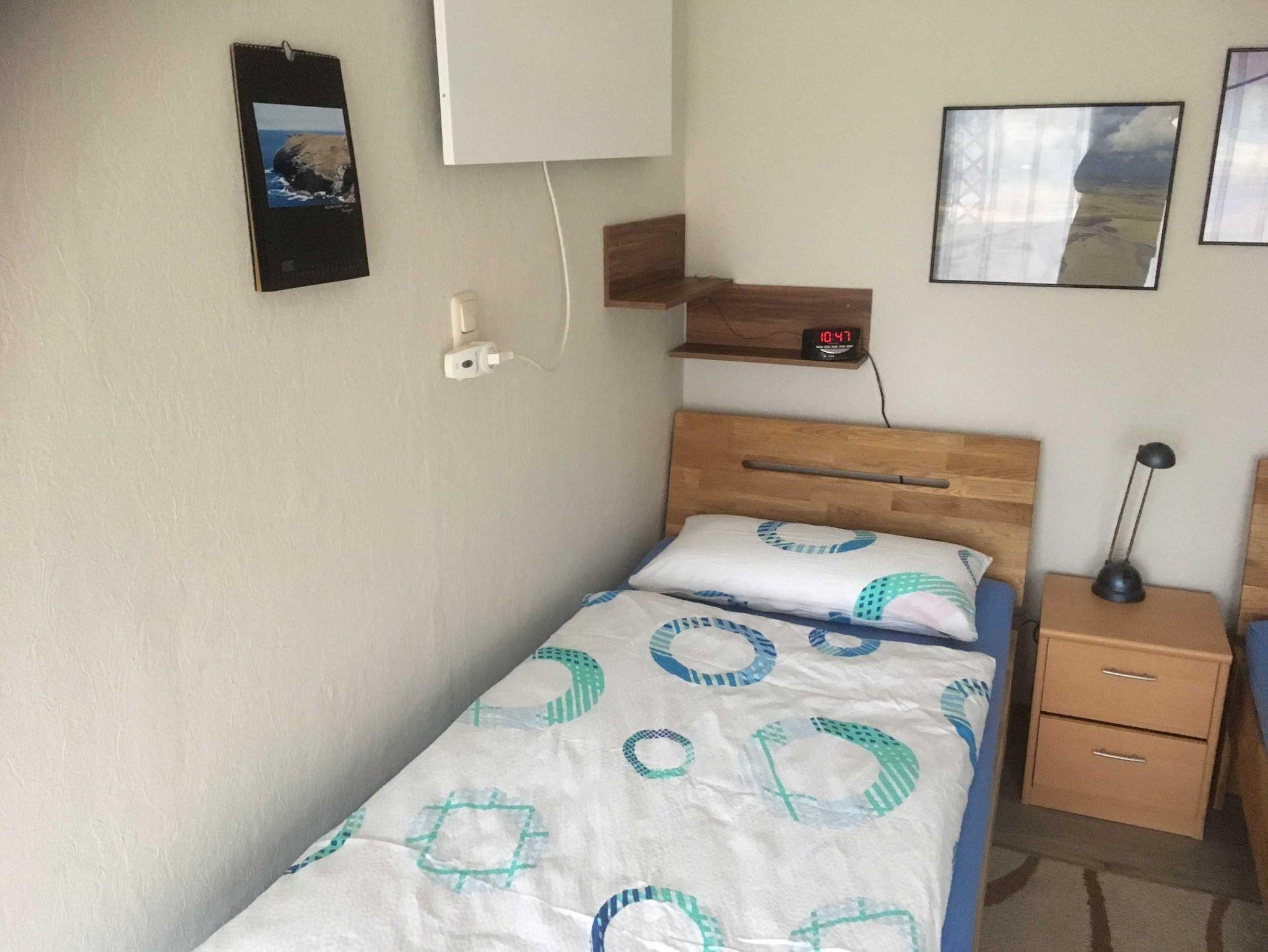 Nach dem Eingangsbereich erreichen sie das Bad mit WC/Dusche, dann finden sie die kleine Küchenecke mit Kaffeemaschine, Toaster, Wasserkocher, Tischbackofen, Eierkocher, Töpfe und Geschirr sind auch ausreichend da. Im anschließenden Wohnraum mit Essecke, gibt es einen Fernseher und CD- Player. Für wohlige Wärme in der kälteren Jahreszeit sorgt eine Infrarotheizung mit Temperaturregler. Im Schlafraum befinden sich zwei Einzelbetten (90x200cm) und ein Kleiderschrank. (Renovierung 2019, Wände, Fussboden, Zimmertüren, Möbel) Neue Matratzen 2022.