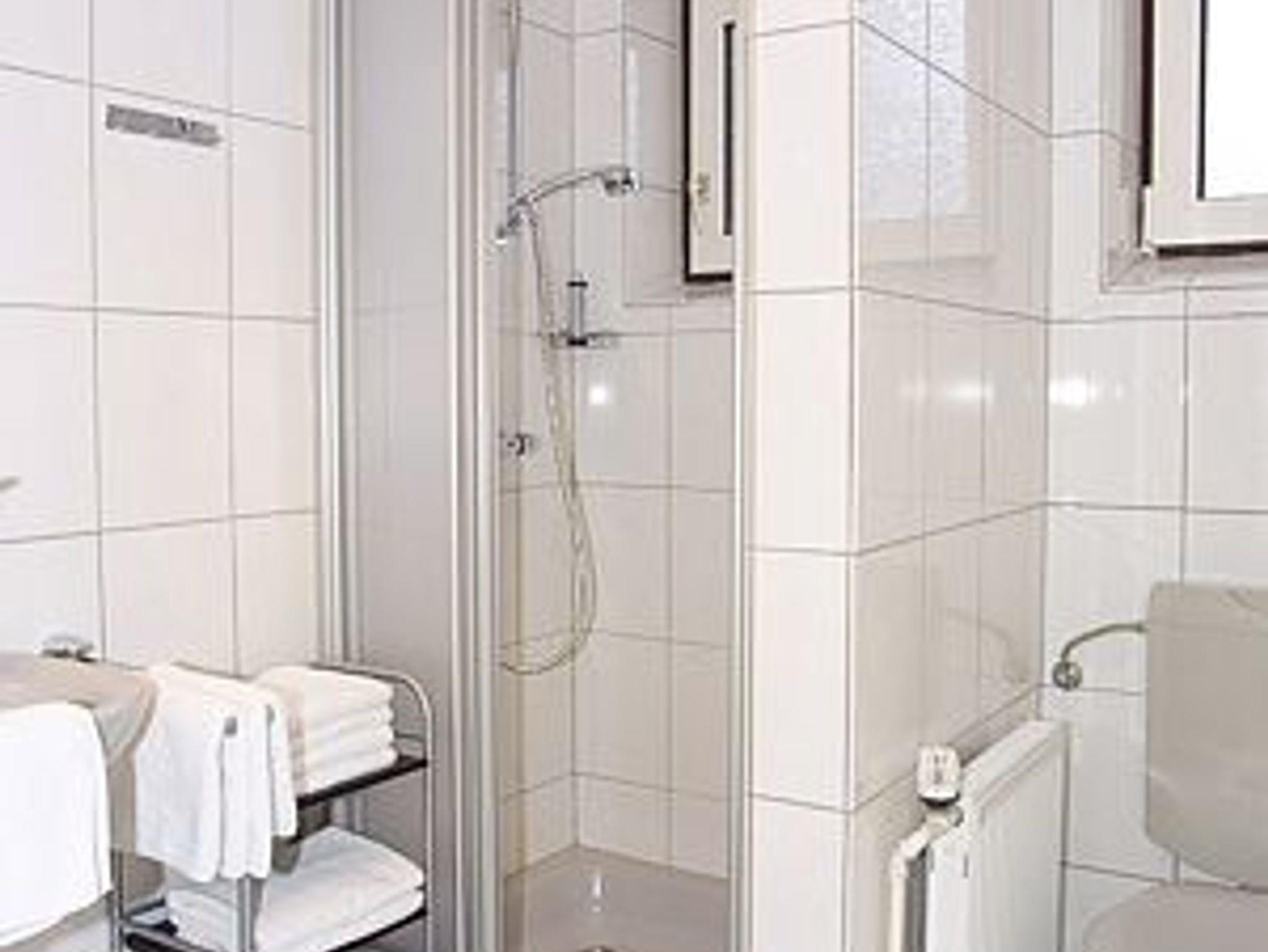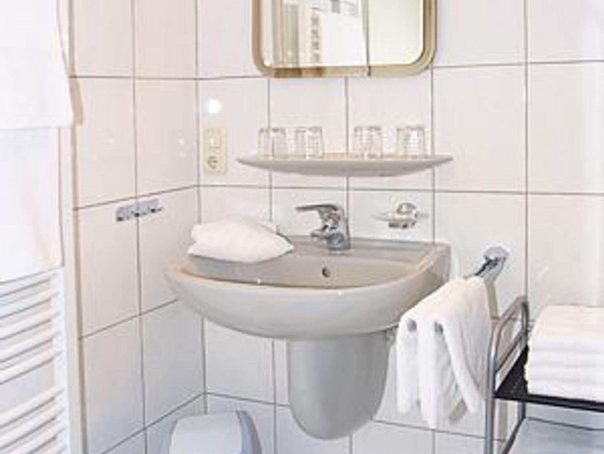 Badezimmer mit Dusche, Waschtisch und WC