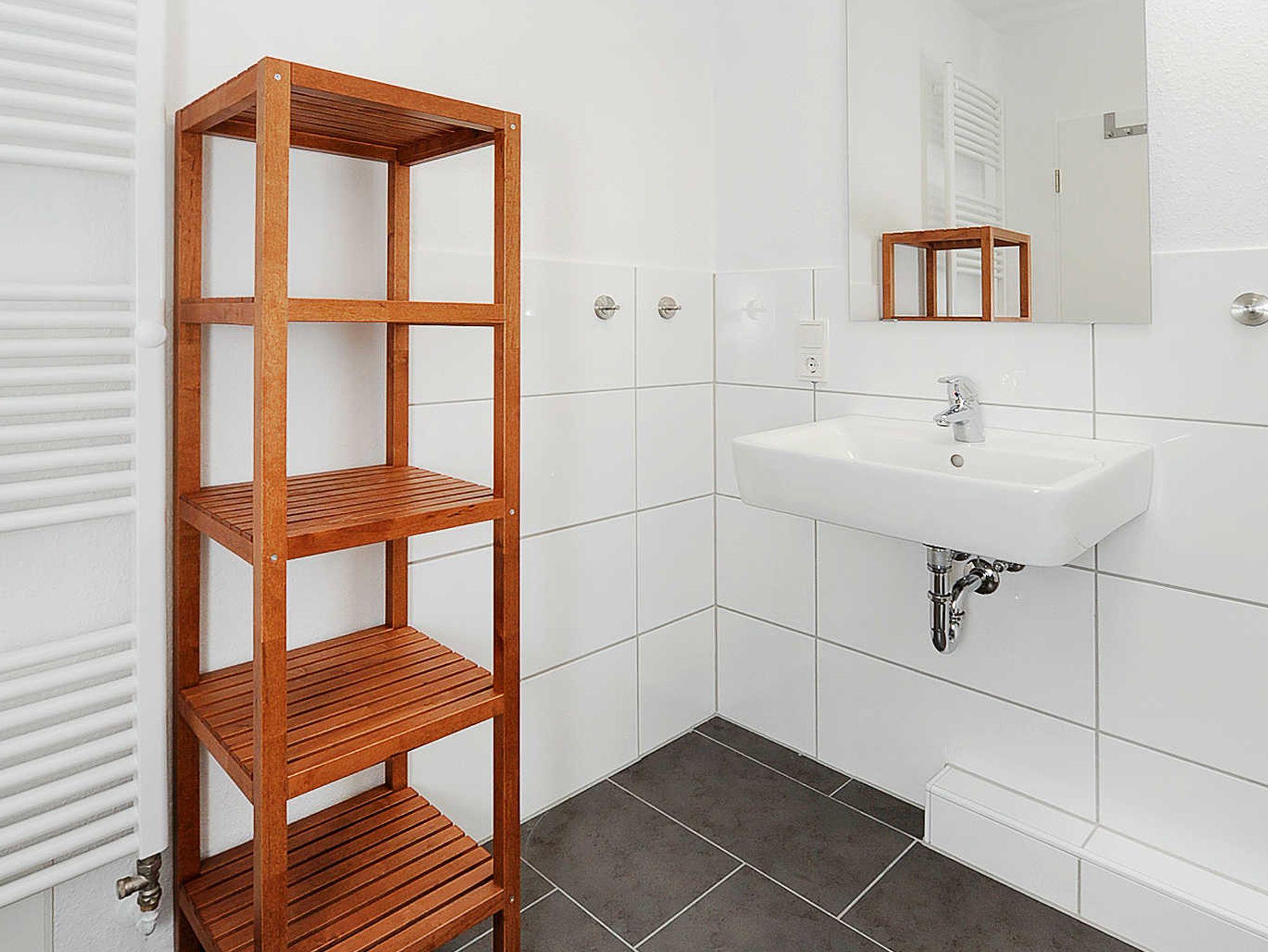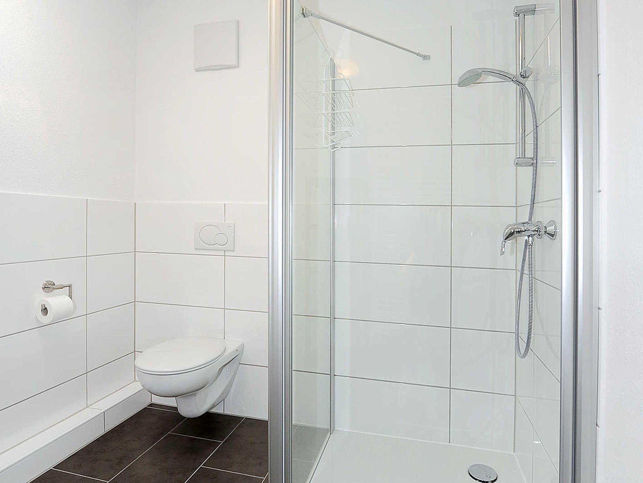 Badezimmer mit Dusche, Waschtisch und WC