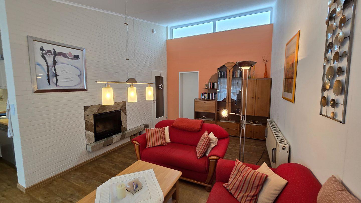 Der Wohnbereich ist freundlich gestaltet und lädt zu gemeinsamen Stunden nach einem Tag an der frischen Nordseeluft ein. Die Küche ermöglicht eine unkomplizierte Selbstversorgung während des Aufenthalts. Separate Schlafbereiche sorgen für erholsame Nächte und ausreichend Rückzugsmöglichkeiten.