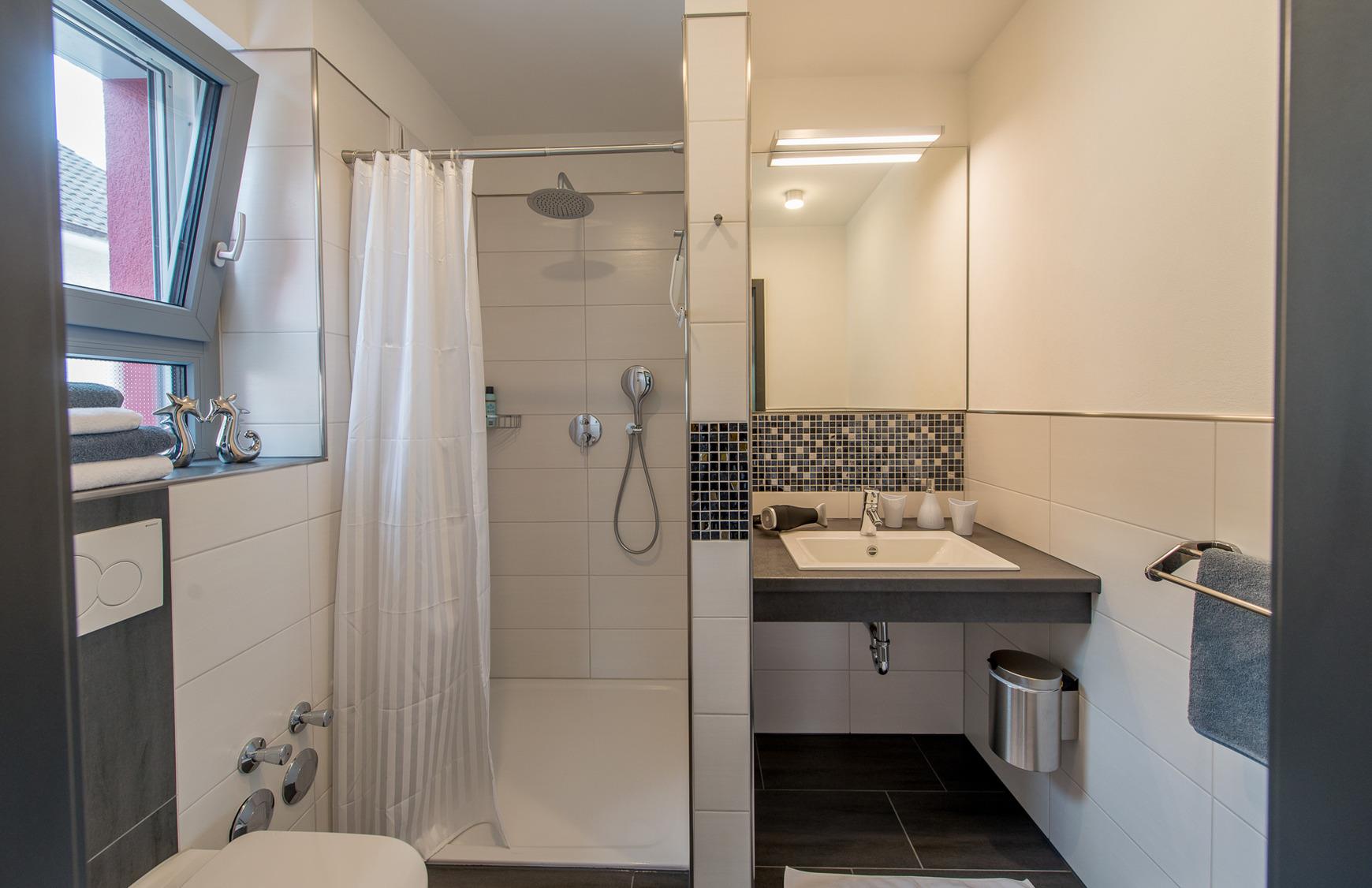 Komfort-Bad mit Dusche, Waschbecken und WC & Komfort-Ausstattung