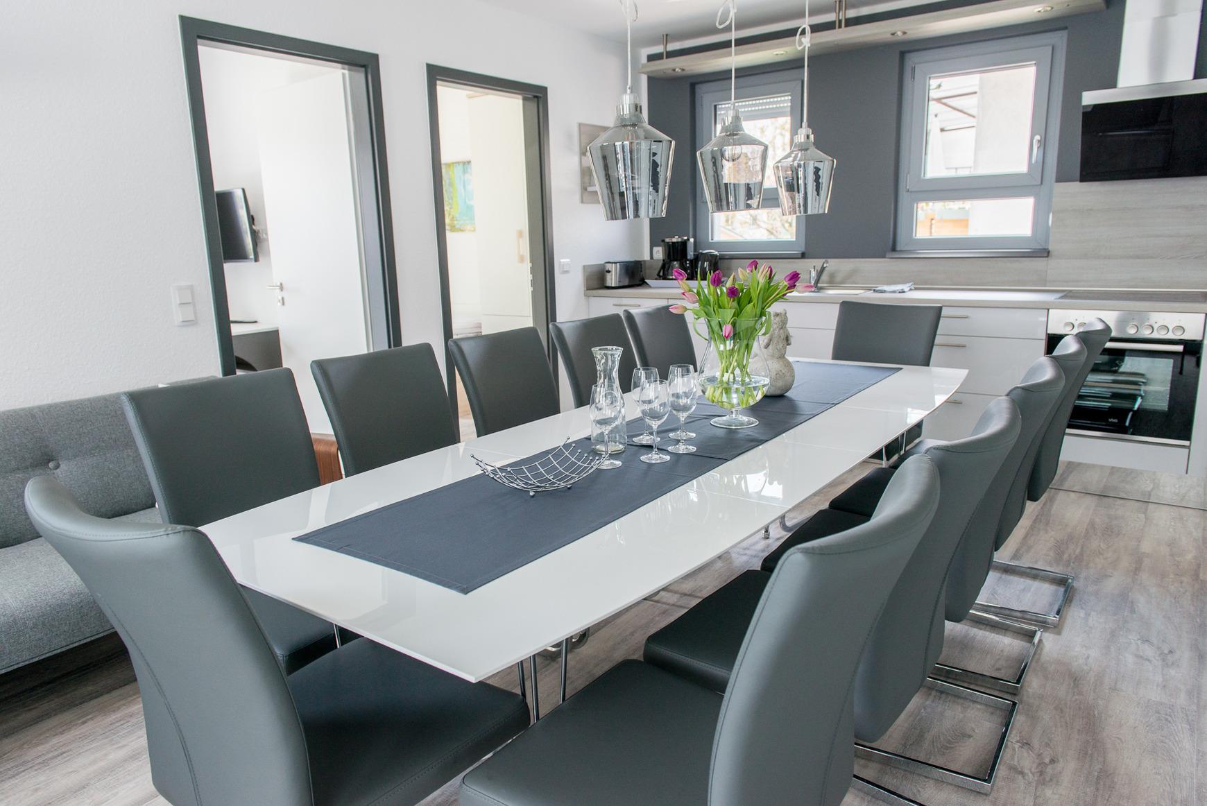 Wohnbereich: Wohnraum mit Esstisch (verlängerbar für Gruppen bis 12 Personen) und 1 x Sofa-Bett, 42-Zoll-Flatscreen-TV.