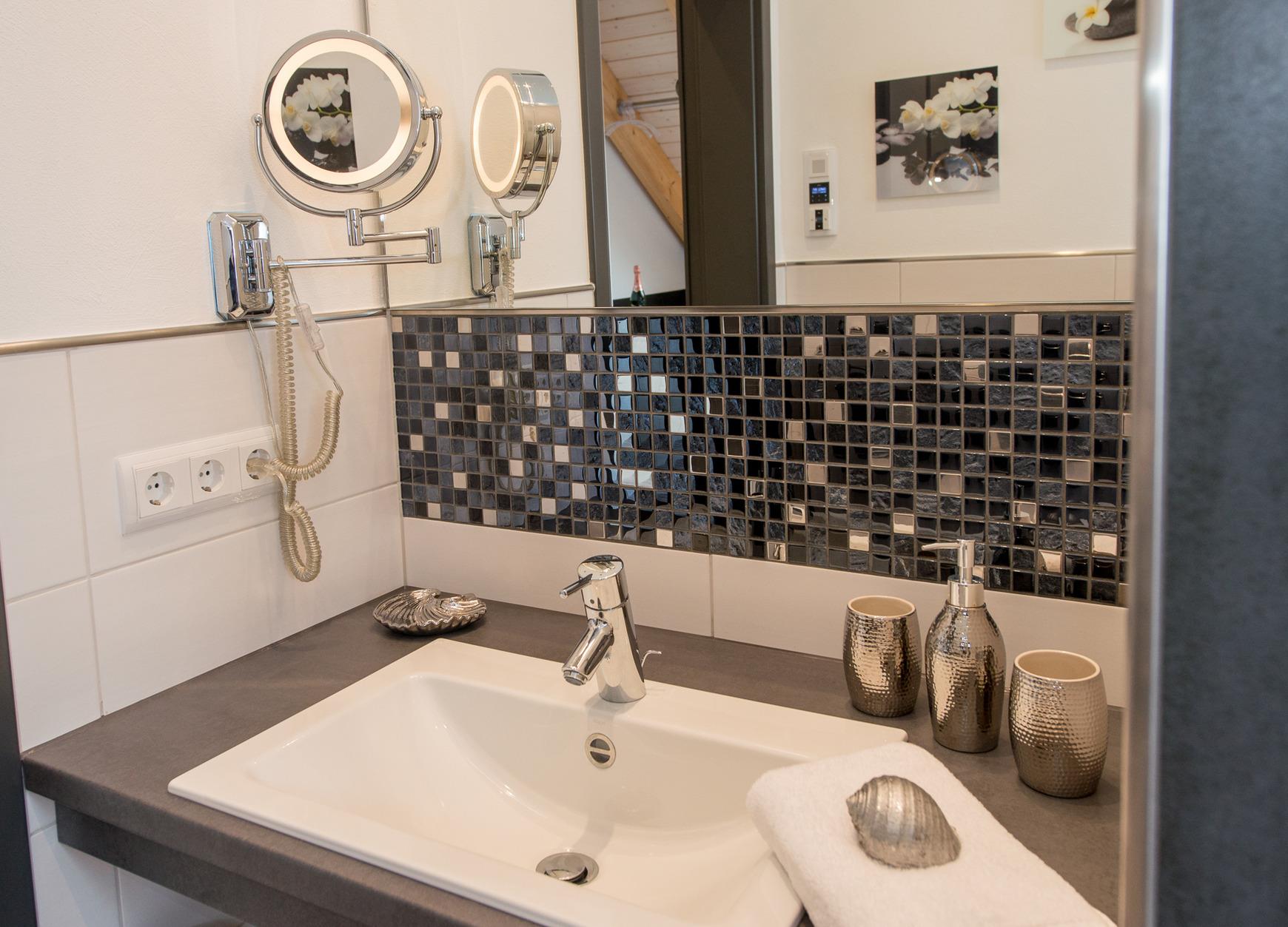 Bad-Extras: Duschradio, Kosmetikspiegel, Pflegeprodukte (Handseife+Dusch-Shampoo), Handtuchwechsel auf Wunsch