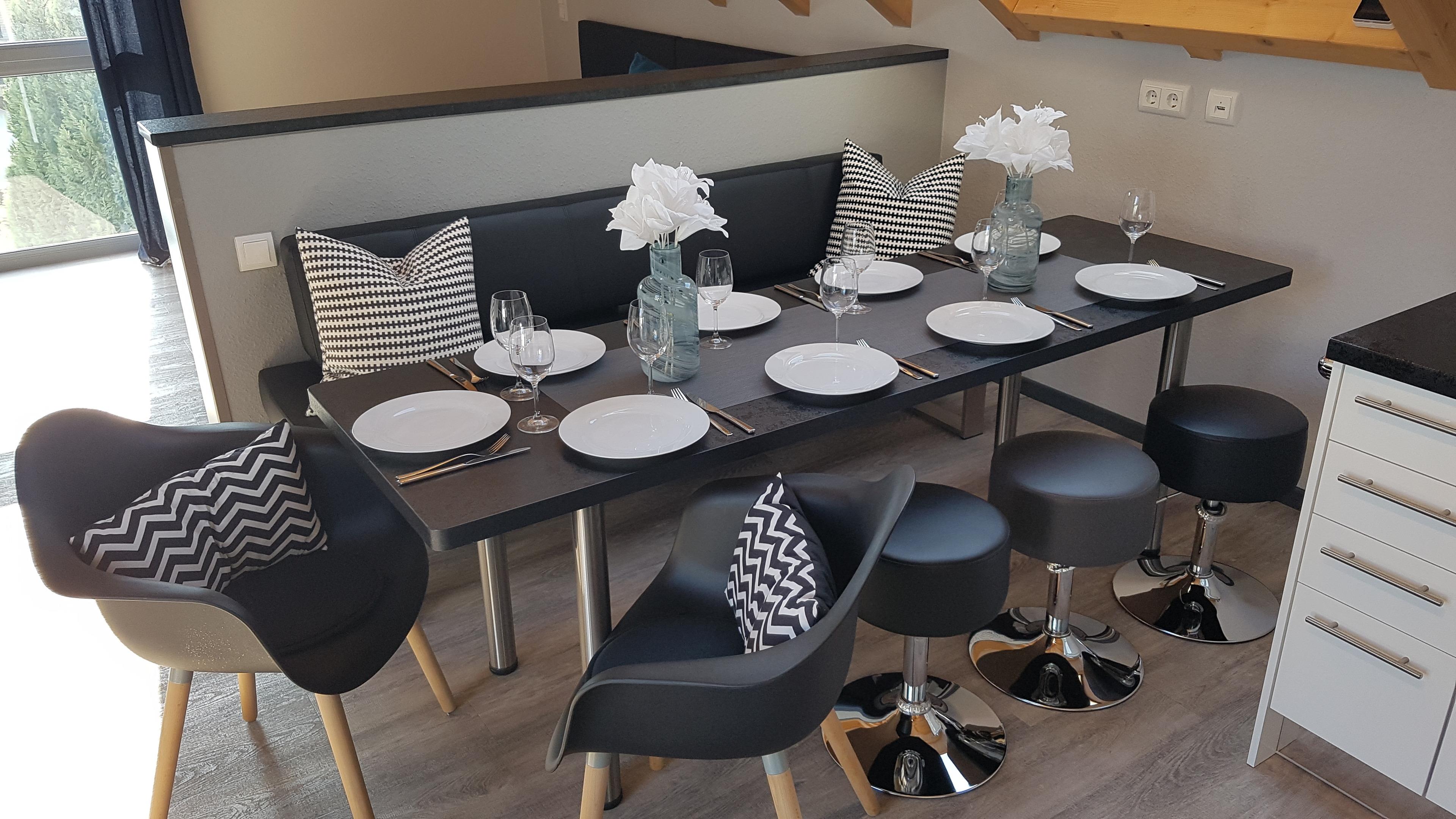 Wohnbereich: offener Wohnraum mit Küche, Esstisch für 6-8 Personen, 38-Zoll-Flatscreen-TV