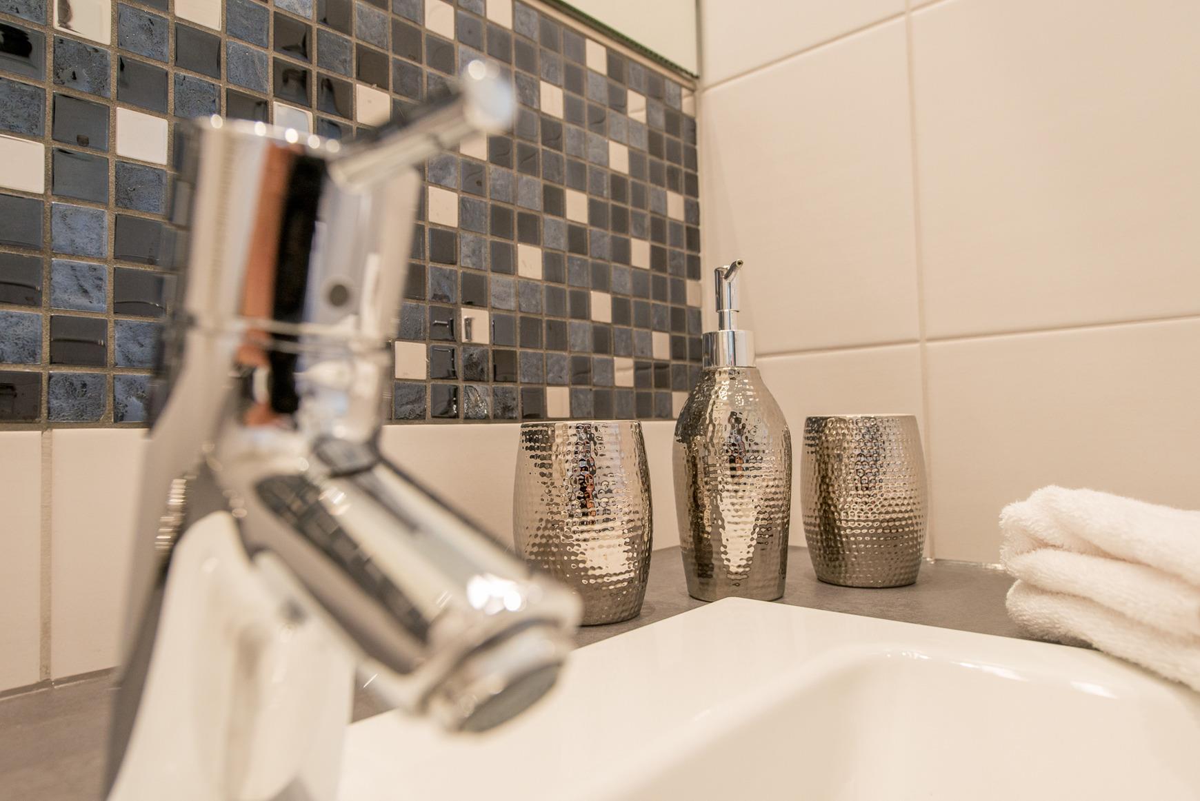 3 x Bäder mit bodentiefer Regendusche, Haartrockner, stimmungsvollem Lichtkonzept, Handtücher, Toilettenpapier.