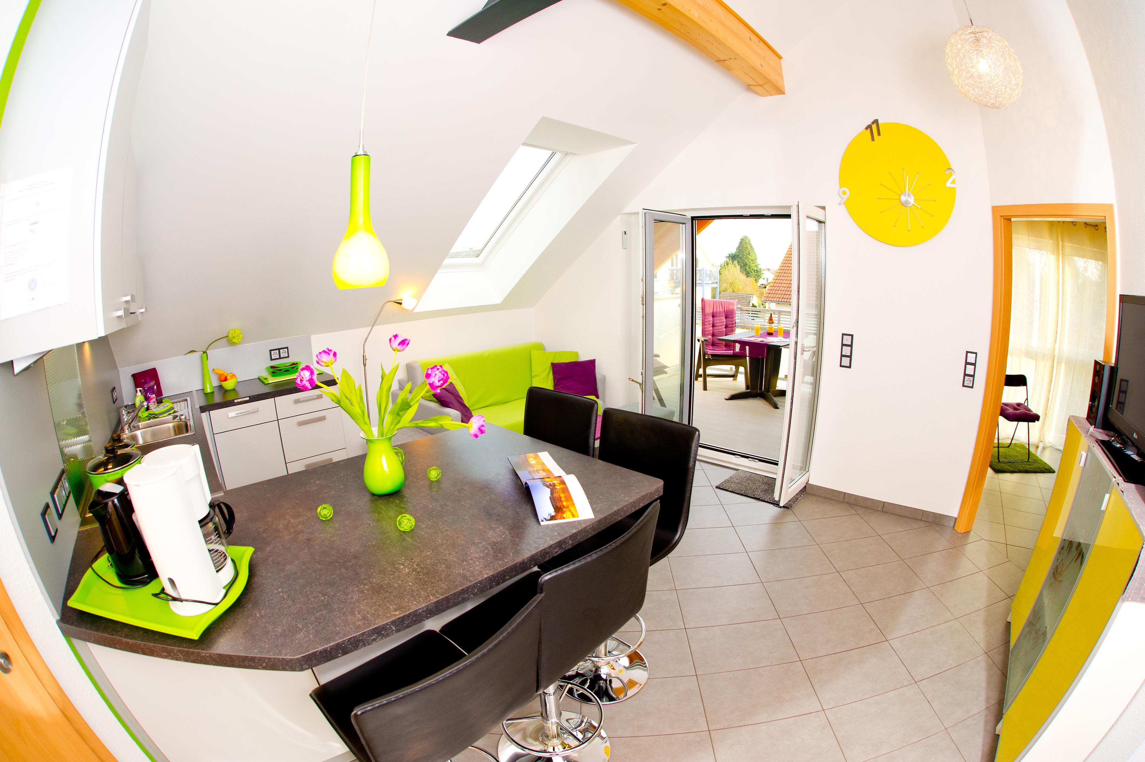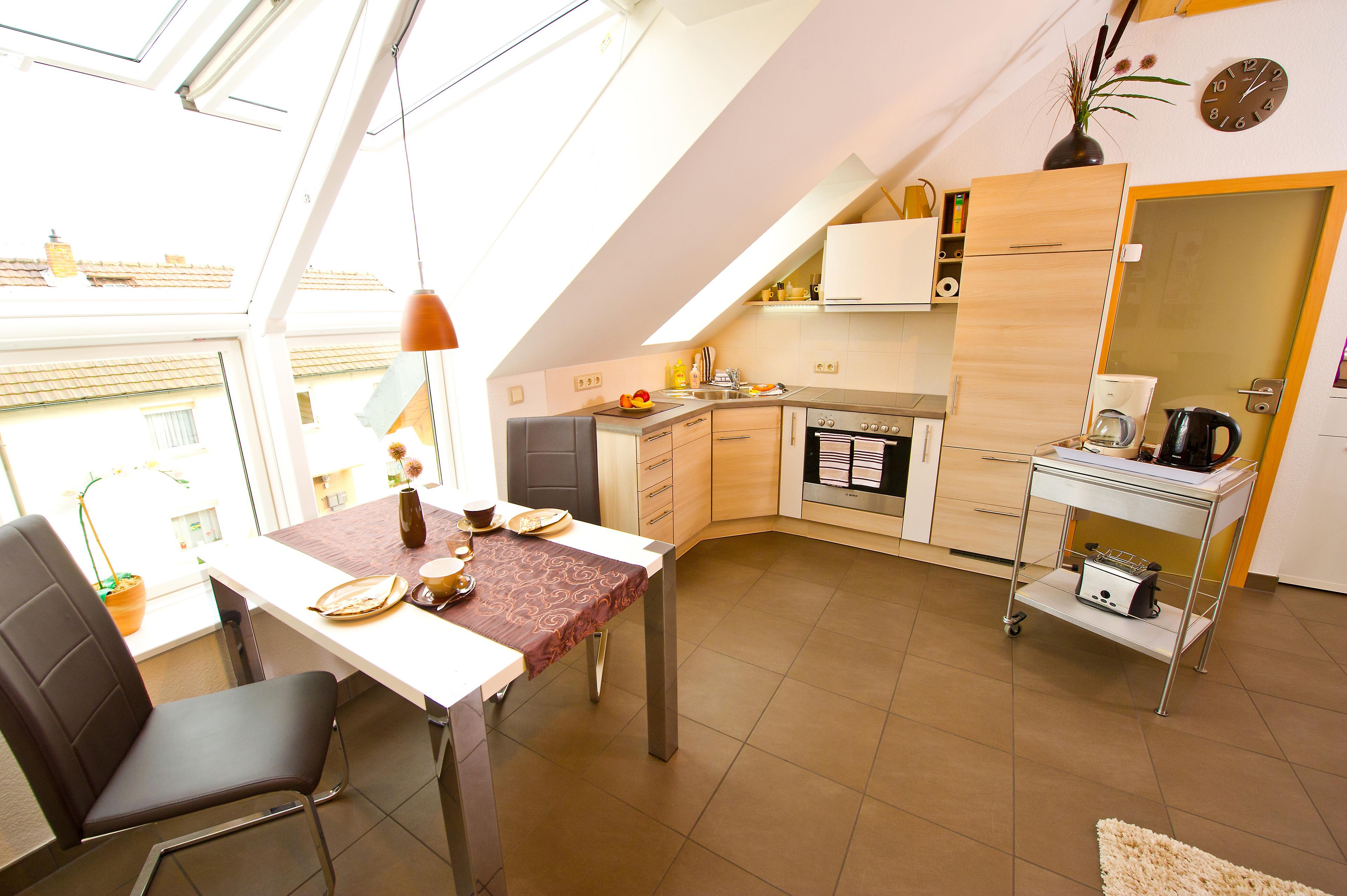 Kühlschrank mit Gefrierschrank, Geschirrspülmaschine, 4-Platten-Zerankochfeld, Backofen, Kaffeemaschine, Wasserkocher, Toaster, Mikrowelle auf Wunsch