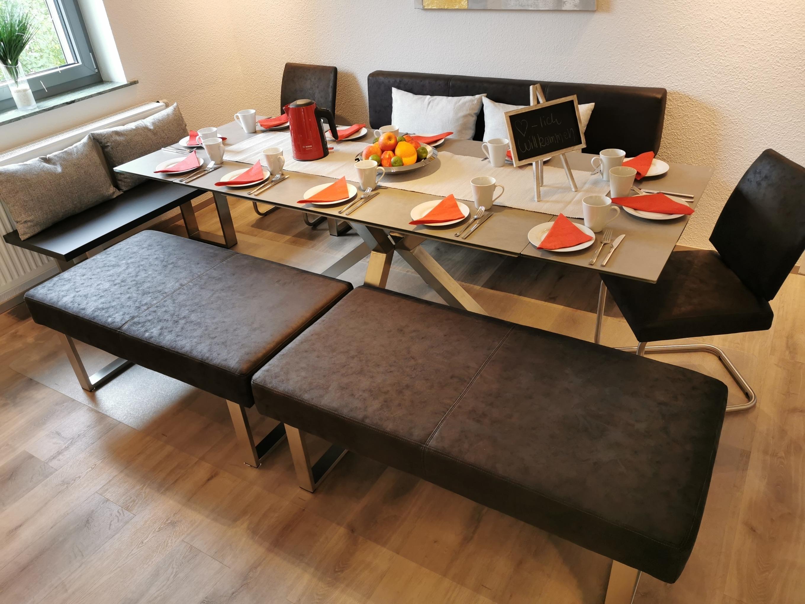 1 Gruppenraum mit großem Tisch für alle Personen, Küchenausstattung in Gruppengröße, Bettwäsche, Handtücher, Geschirrtücher, Kinder-Hochstuhl und Reisebett (auf Wunsch),