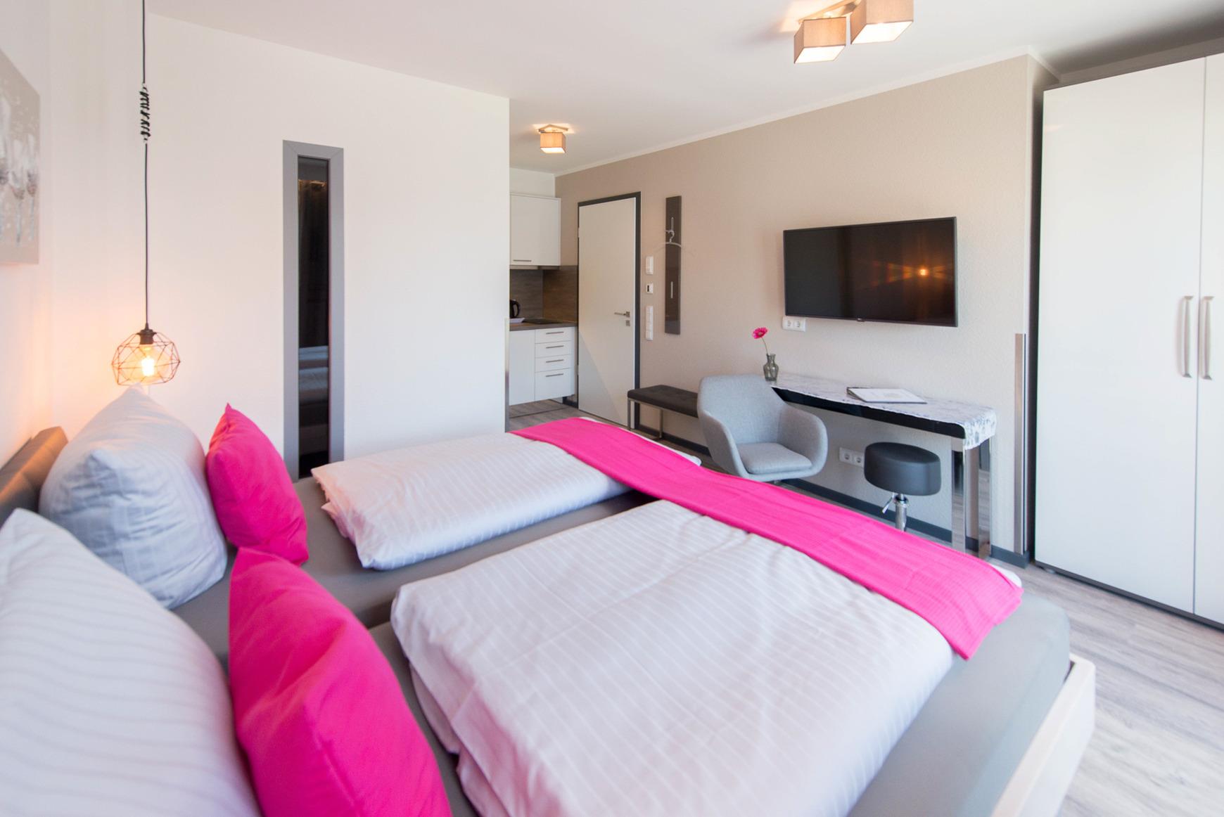 Buchen Sie ein modernes Doppelzimmer-Apartment mit Komfort-Ausstattung für 1(-2 ) Personen im neu gebauten Apartmenthaus in Bensheim. Die schicke Einrichtung wird Sie begeistern. Mit eigener Mini-Küche für Ihr individuelles Frühstück. Nespressoautomat und Tee-Station. Bäcker und Supermarkt um die Ecke. Free Wifi und Parken inklusive! Die Lage ist ruhig und zentral, nur 900 Meter zu Bahnhof und Altstadt. Das Inhaber geführte Haus überzeugt mit herzlicher Gastfreundschaft.