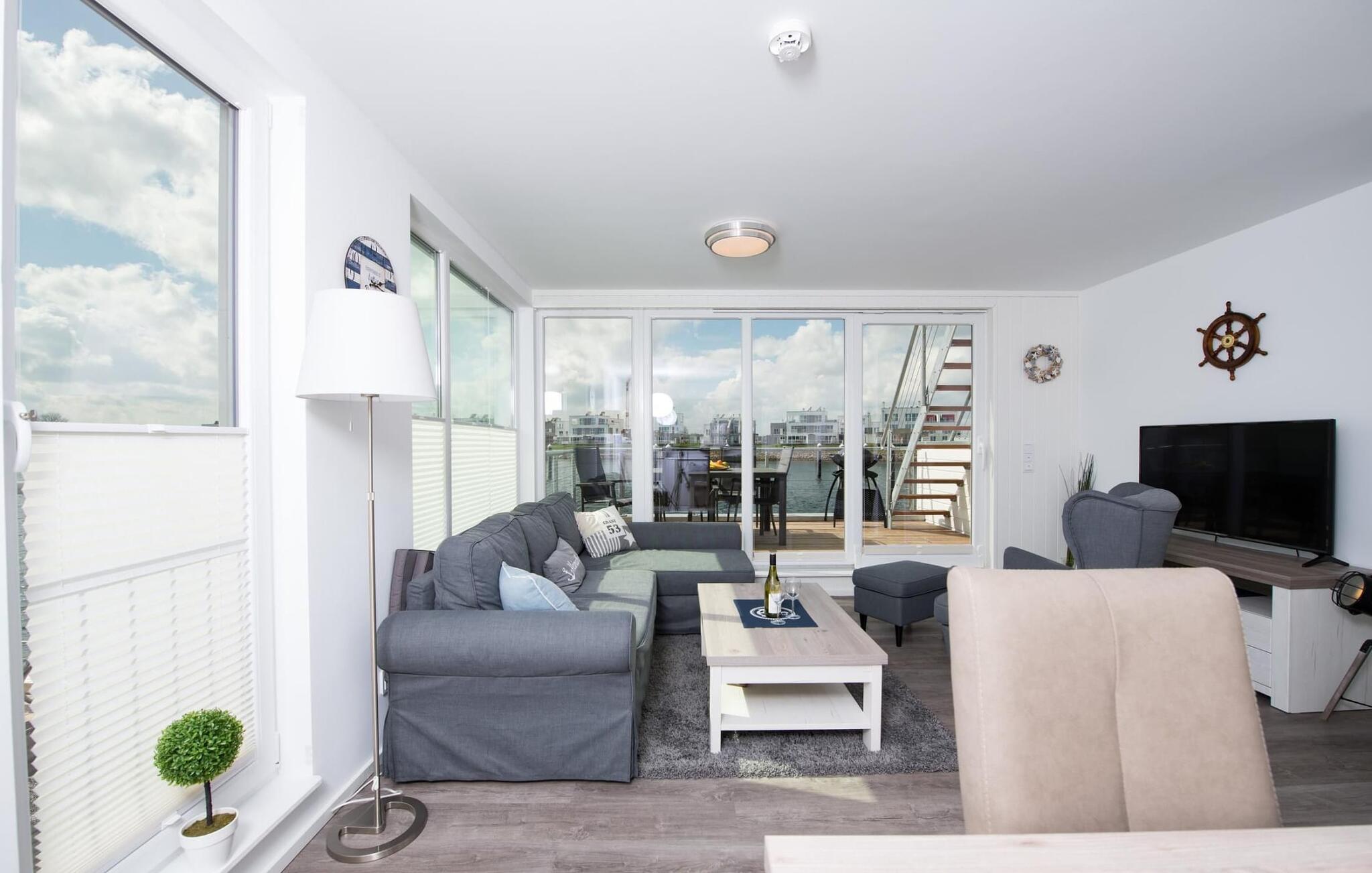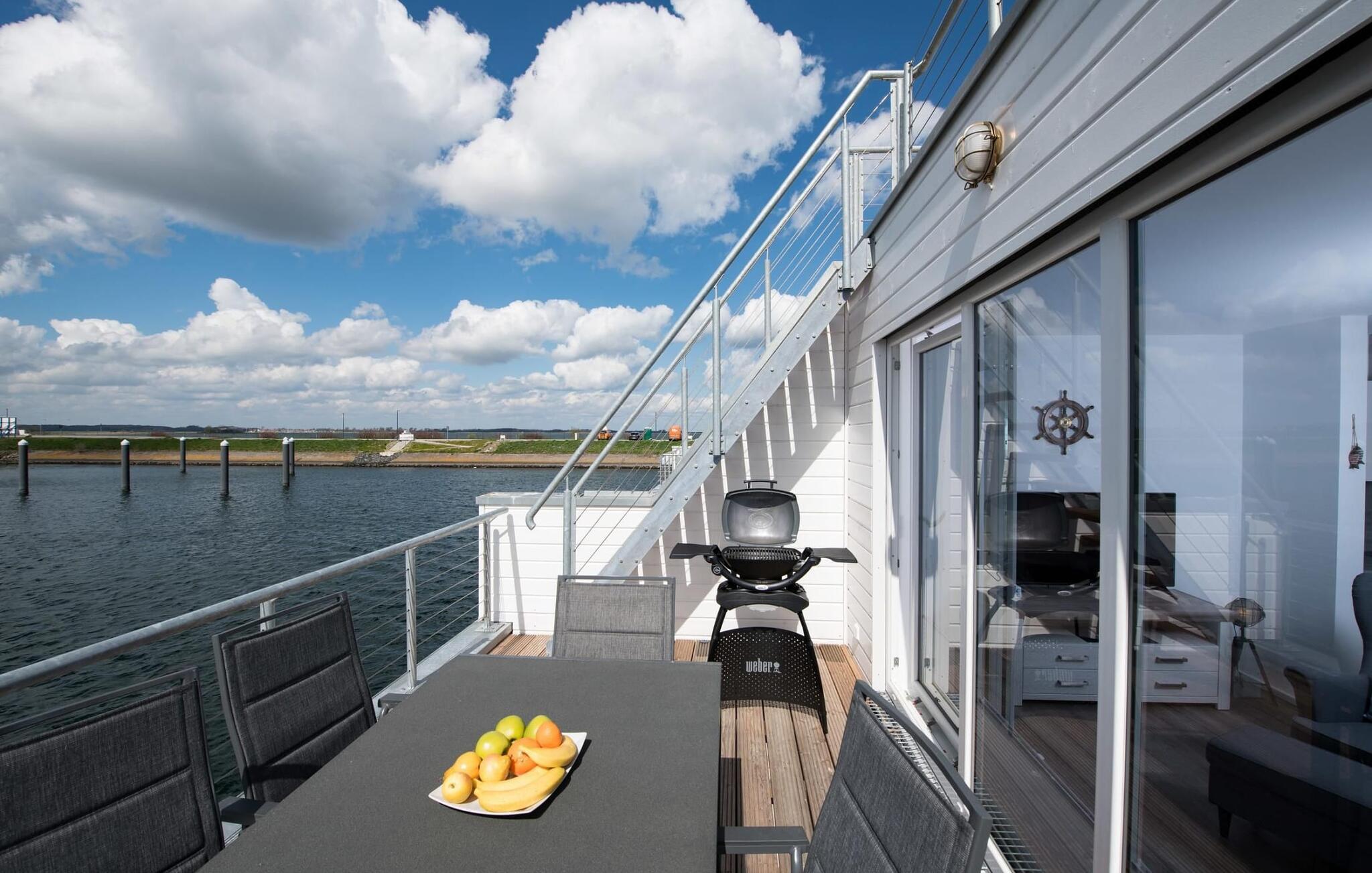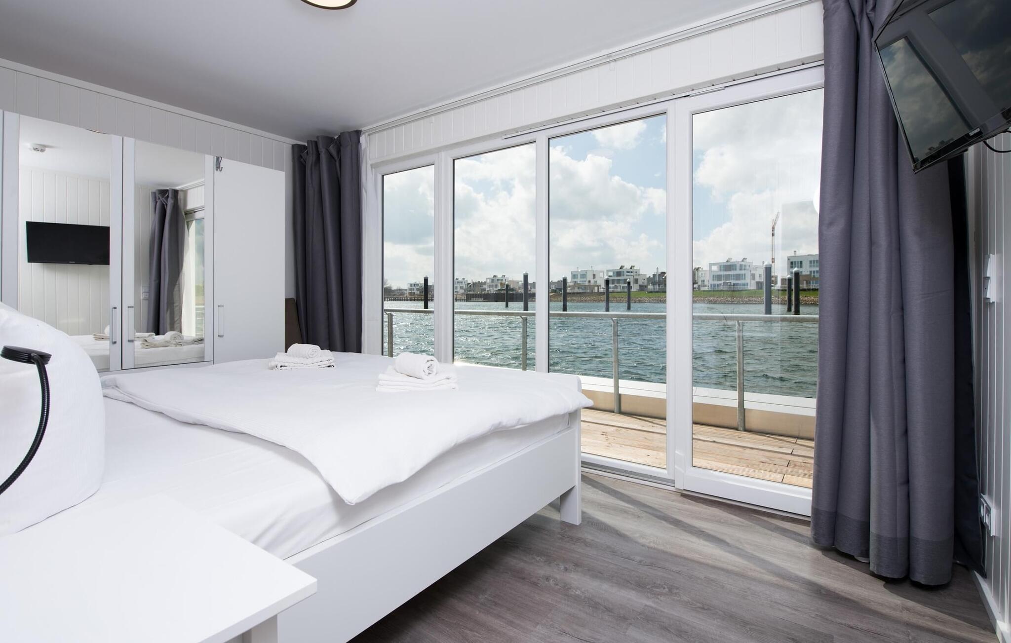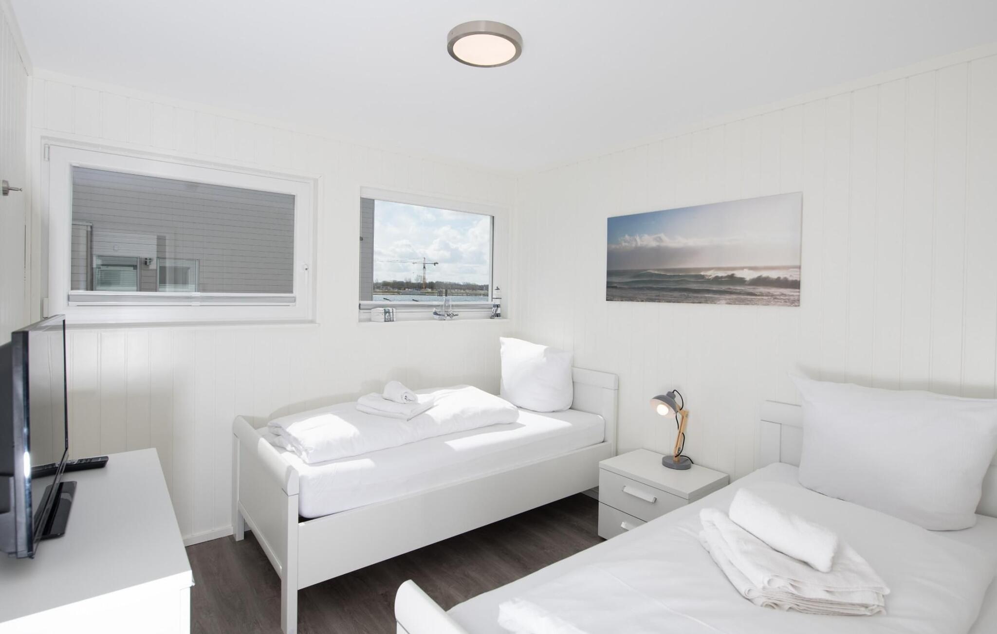 Det flydende hus Bente er hjemme i det fjerne nord og er solidt knyttet til anløbsbroen i ferieområdet Olpenitz ved østersøfjorden Slien og Østersøen. Denne helt specielle ferieoplevelse kombinerer eventyret fra en sejltur omgivet af vand med alle bekvemmelighederne ved et luksuriøst feriehus på land. Vand så langt øjet rækker. Det betagende landskab kan nydes gennem gulv-til-loft panoramavinduer, og tagterrassen byder på en spektakulær 360-graders udsigt over Slien, Østersøen og marinaen. Østersøen er kun en badestige væk, og sandstranden i Baltic Sea Resort kan nås til fods. I den mørke årstid giver gulvvarme og sauna hyggelig komfort, da wellness-programmet ombord er et must. Udover havnebiografen sørger Smart TV med hjemmeunderholdningsprogram for underholdning. Det flydende hus strækker sig over tre plan. På øverste etage er der opholds- og spisestue i åbent plan med udsigt til vandet hele vejen rundt, fuldt udstyret køkken-alrum og tilstødende terrasse. Herfra har I adgang til den spektakulære tagterrasse med udsigt over sejler- og sportsbådshavnen, Slien og dens udmunding i Østersøen. Udstyret med havemøbler af høj kvalitet og en Weber el-grill tilbyder terrasserne en ren feriefølelse og betagende solnedgange. Husets afslapningsområde er i stueetagen med to soveværelser, badeværelse og sauna. Det store soveværelse imponerer med et panoramavindue fra gulv til loft, hvorigennem I kan nyde den betagende vandbaggrund og en tilstødende omgivende terrasse. Begge soveværelser har fladskærms-tv med hjemmeunderholdningsprogrammer. Der er en ekstra soveplads på den komfortable sovesofa i husets opholdsstue. Når I tager en sauna eller børster tænder, kan I selvfølgelig også se havet og svanerne svømme forbi. Hvis I ønsker at rejse med båd, er dette det rigtige sted for jer. Der er en privat bådplads med landstrøm og vand lige ved siden af huset. Der er en privat parkeringsplads direkte ved anløbsbroen. Vores yndlingssted: at vågne op til en spektakulær vandkulisse. Bemærk venligst: OstseeResort Olpenitz er meget populært, og der bygges fortsat i parken. Ikke desto mindre kan I se frem til en 5-stjernet standard og et førsteklasses ophold. Byggeaktiviteterne kommer ikke til at forstyrre jer på ferien, og derfor gives der ikke yderligere afslag i prisen.