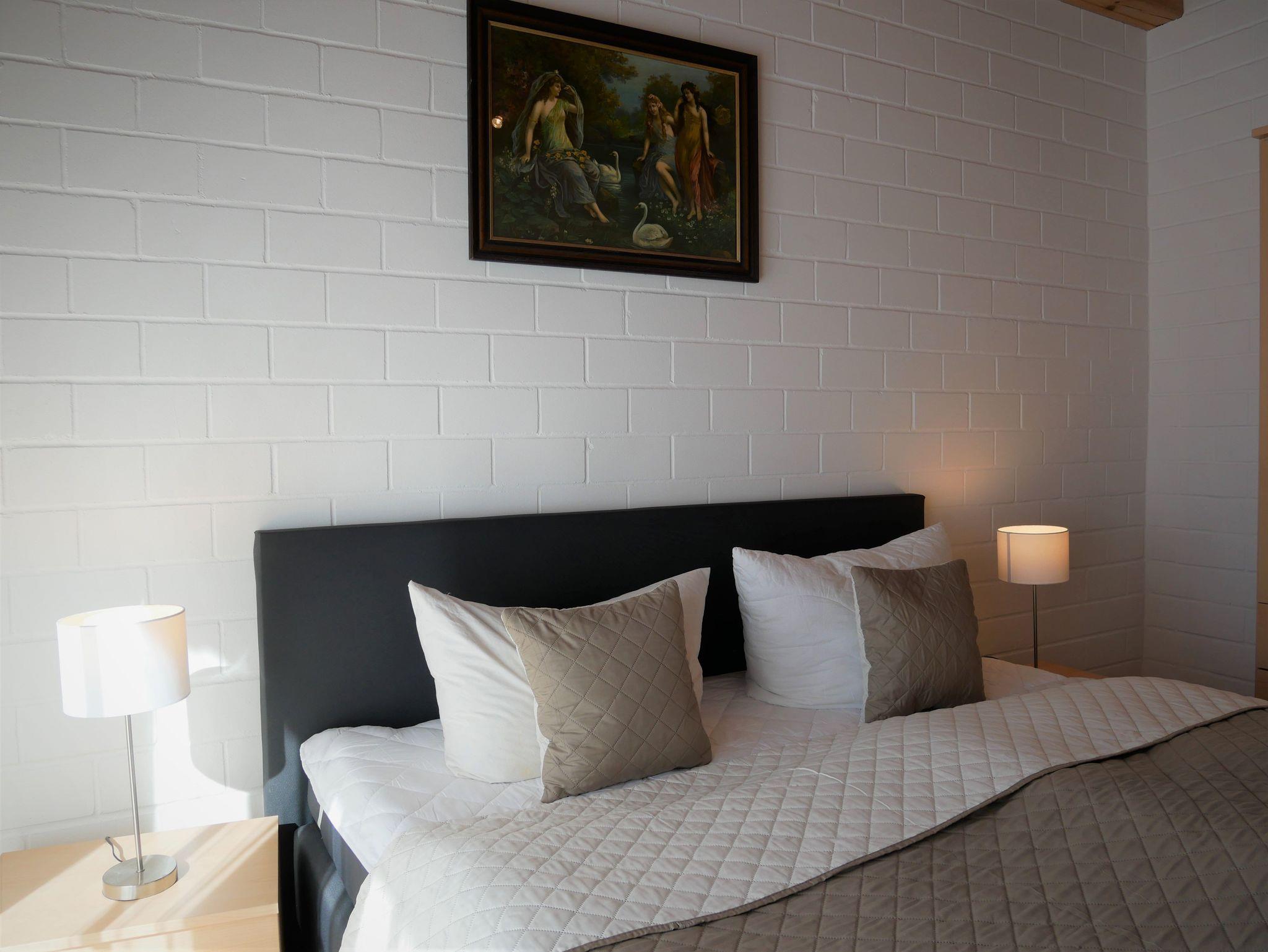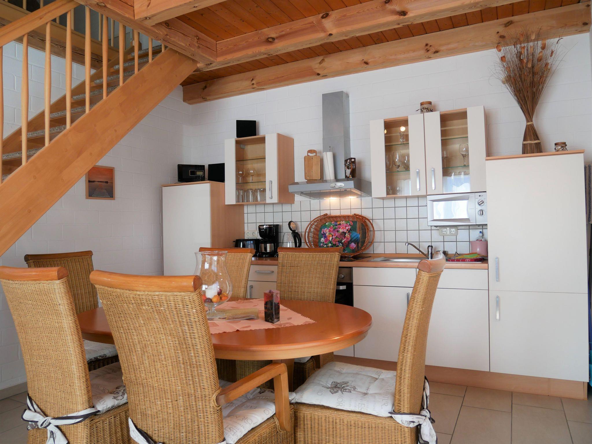 In das Obergeschoss gelangt man über eine offene Buchentreppe. Diese Etage ist offen gestaltet und in einen optisch abgetrennten Schlafbereich mit 2 Einzelbetten und einem großzügigen Wohnbereich mit Flat-TV und Schlafcouch (Aufbettungsmöglichkeit für die 5. Person) aufgeteilt.