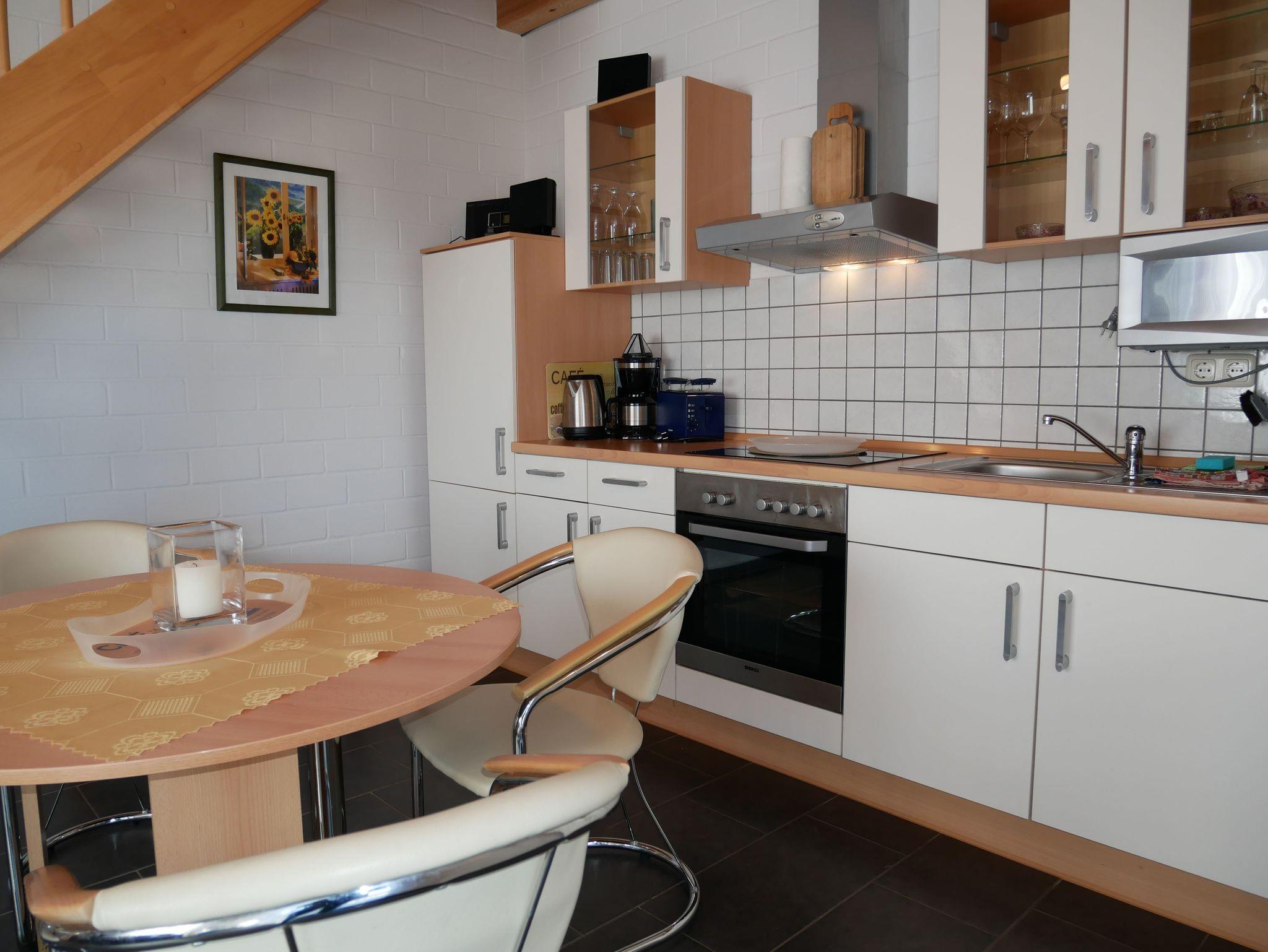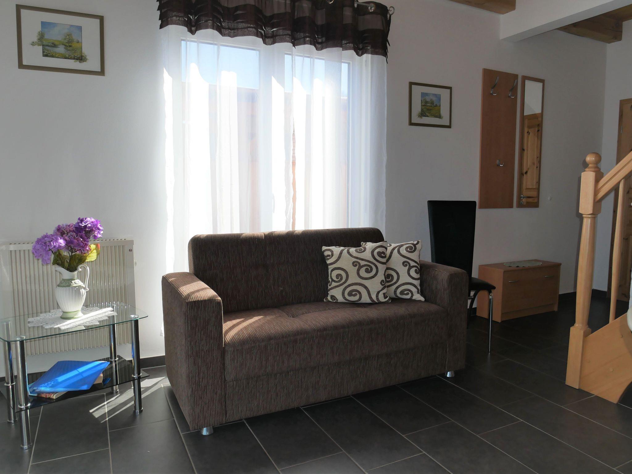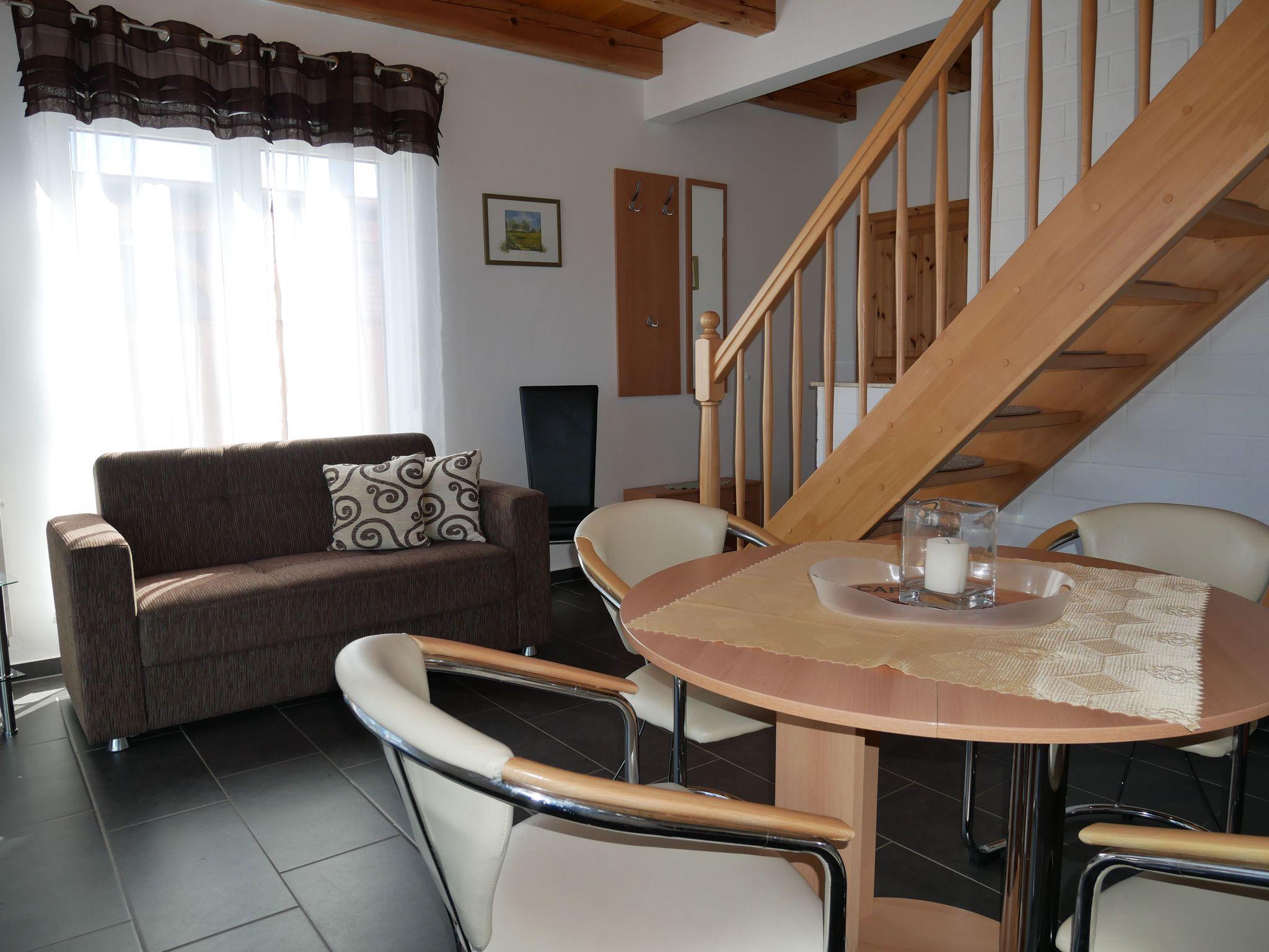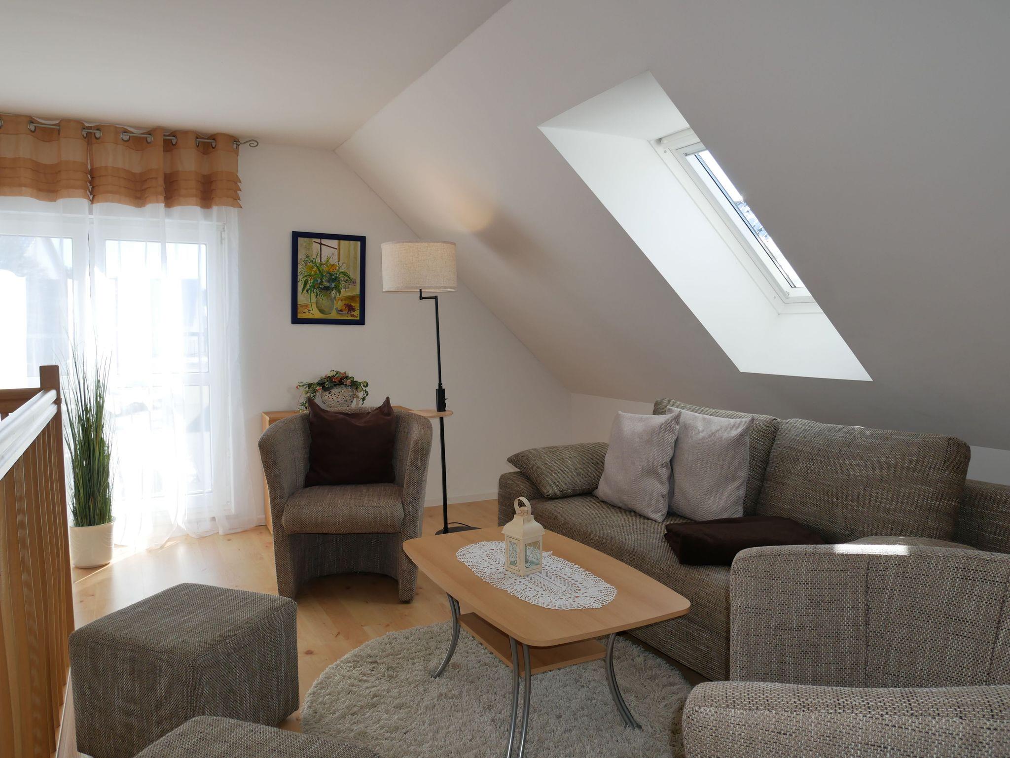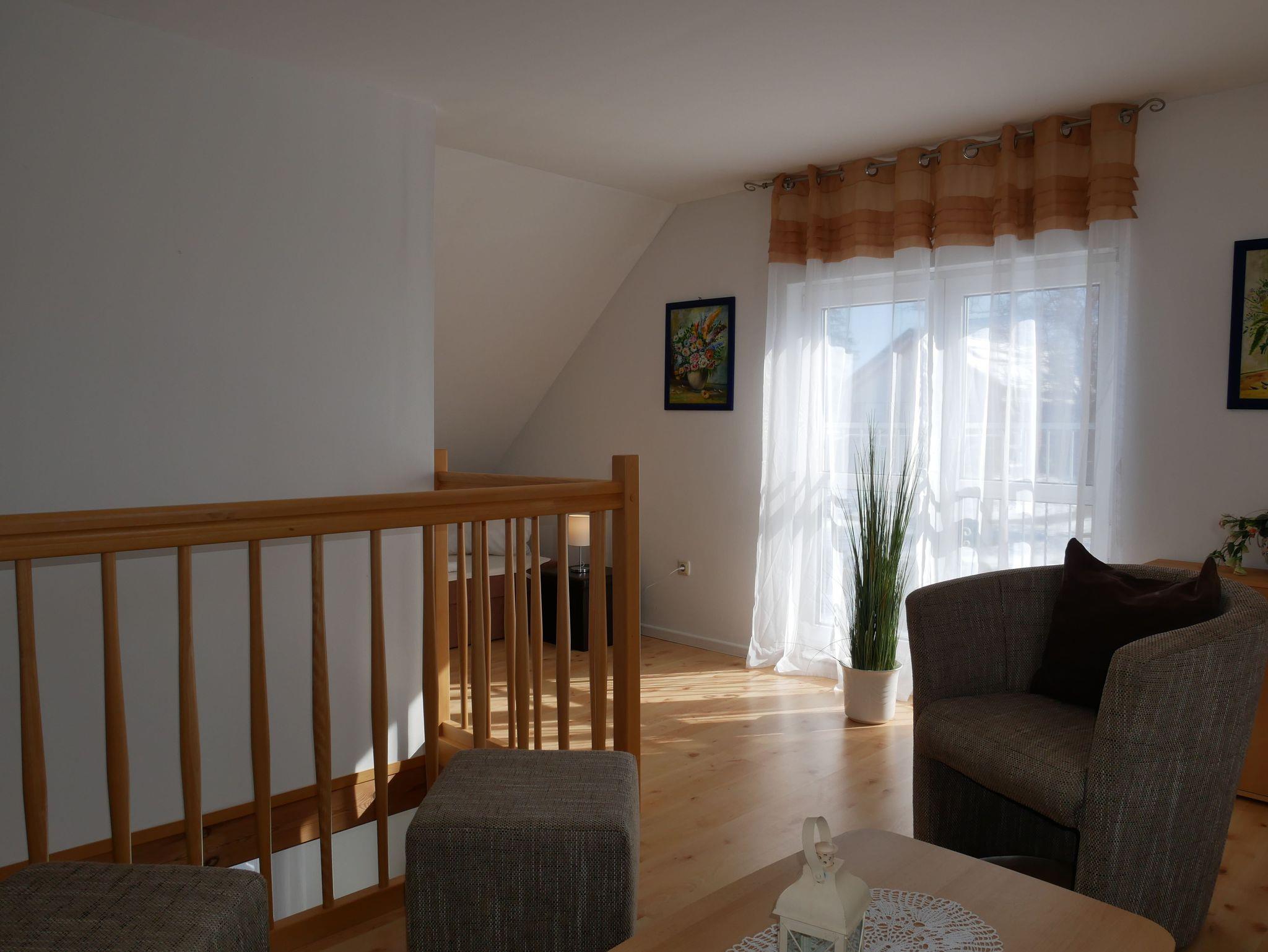 In das Obergeschoss gelangt man über eine offene Buchentreppe. Diese Etage ist offen gestaltet und in einen optisch abgetrennten Schlafbereich mit 2 Einzelbetten und einem großzügigen Wohnbereich mit Flat-TV und Schlafcouch (Aufbettungsmöglichkeit für die 5. Person) aufgeteilt.