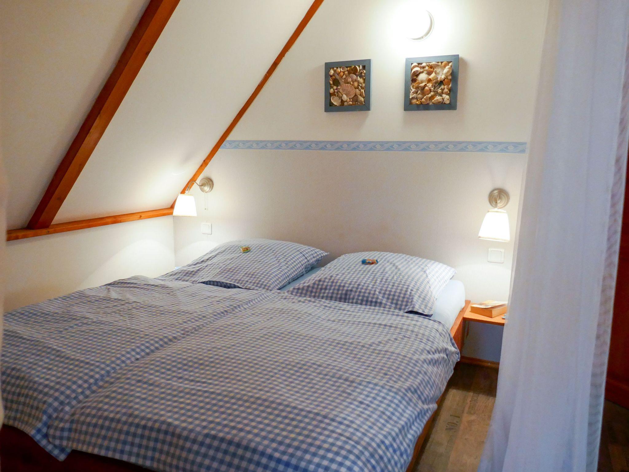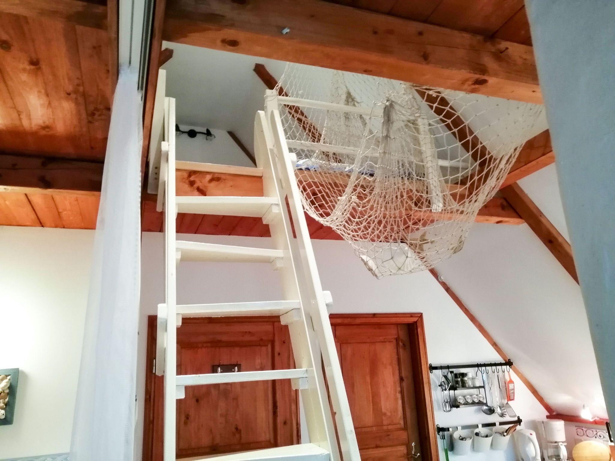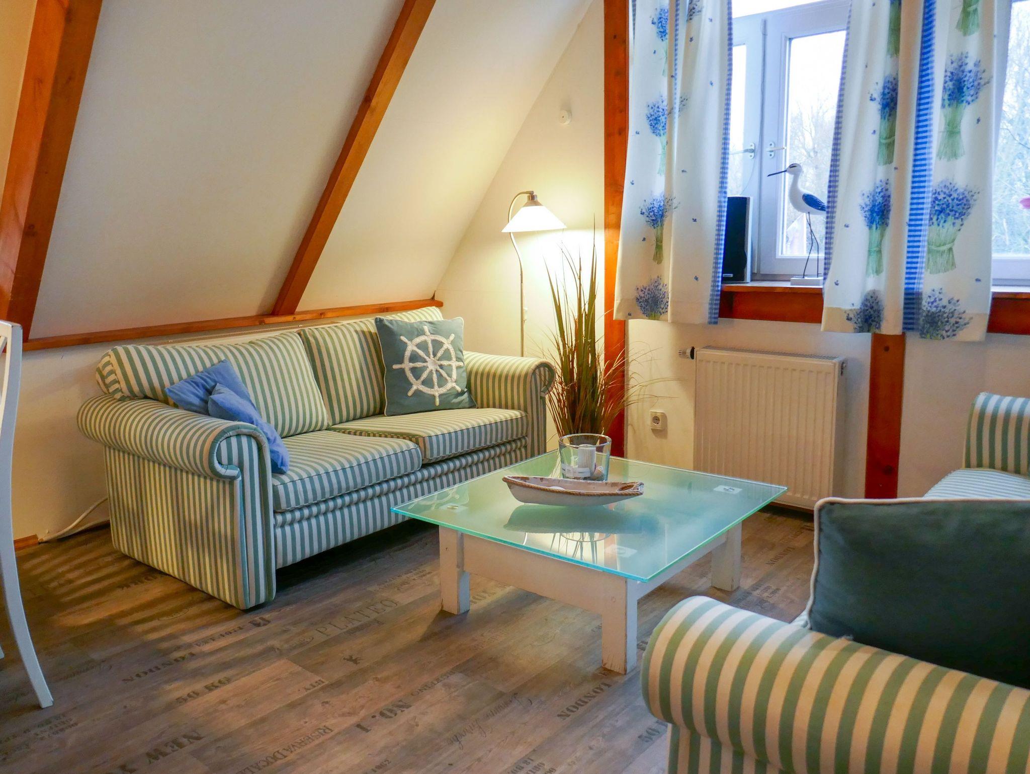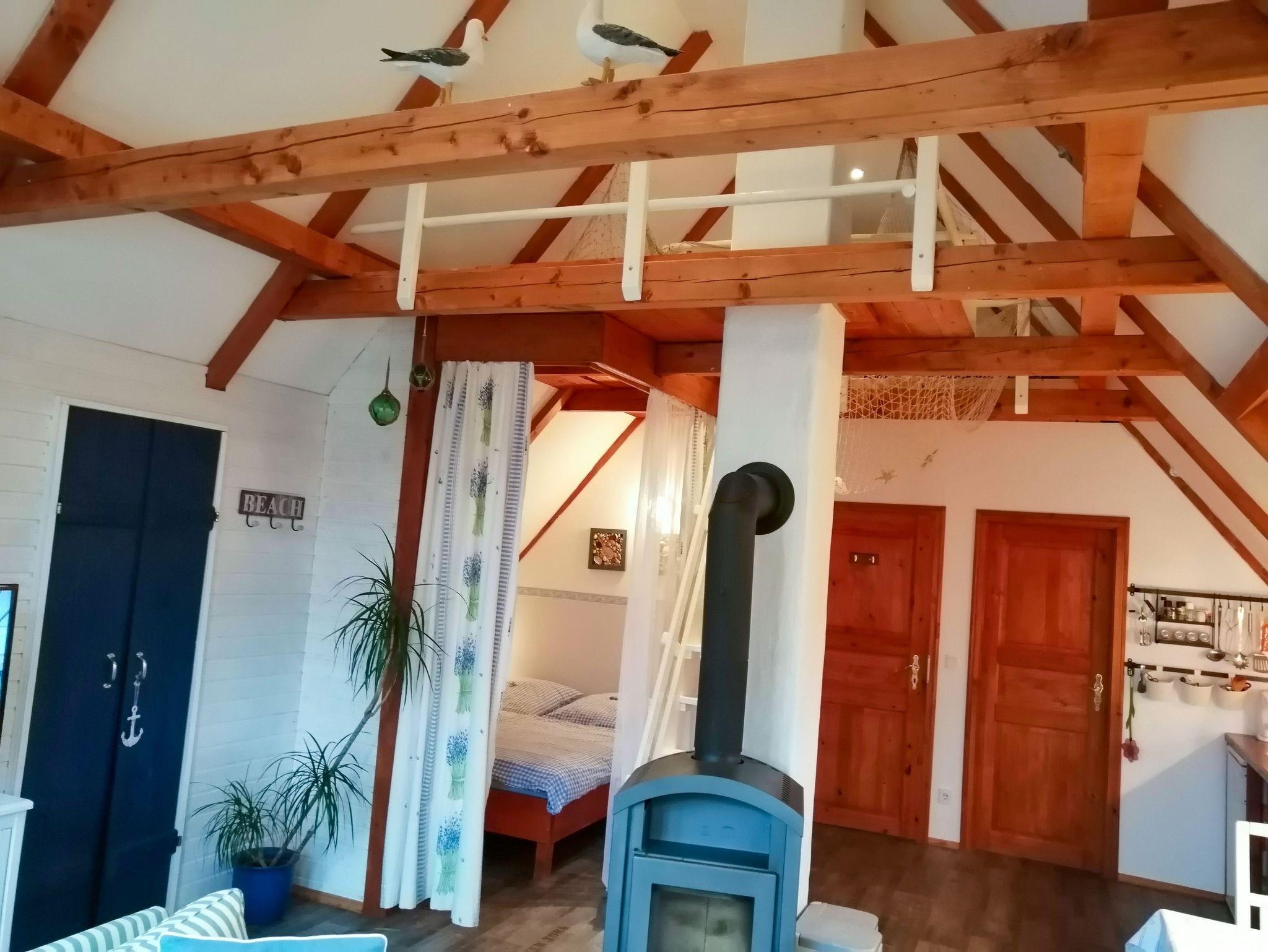 Die Ferienwohnung Albatros befindet sich im Obergeschoss des Reetdachhauses und ist ideal für 4 Personen geeignet. Sie ist als offenes Studio konzipiert und besticht mit einem großen Wohnraum mit Kamin und offenem Dachstuhl. Der maritime und luftige Flair lädt sie direkt ein ihre Seele baumeln zu lassen. Ihnen steht ein Wohnzimmer mit offener Küchenzeile und Esstisch zur Verfügung. Vom Wohnbereich abgetrennt durch Vorhang und Klapptüren finden sich die beiden Schlafkojen, einmal mit einem Doppelbett (180x200) und eine kleinere Schlafkoje (90x200). Über eine Raumspartreppe erreichen sie einen weiteren Rückzugsort mit einem Schlafboden (90x200). Das Tageslicht-Bad ist mit einer Dusche und WC ausgestattet.