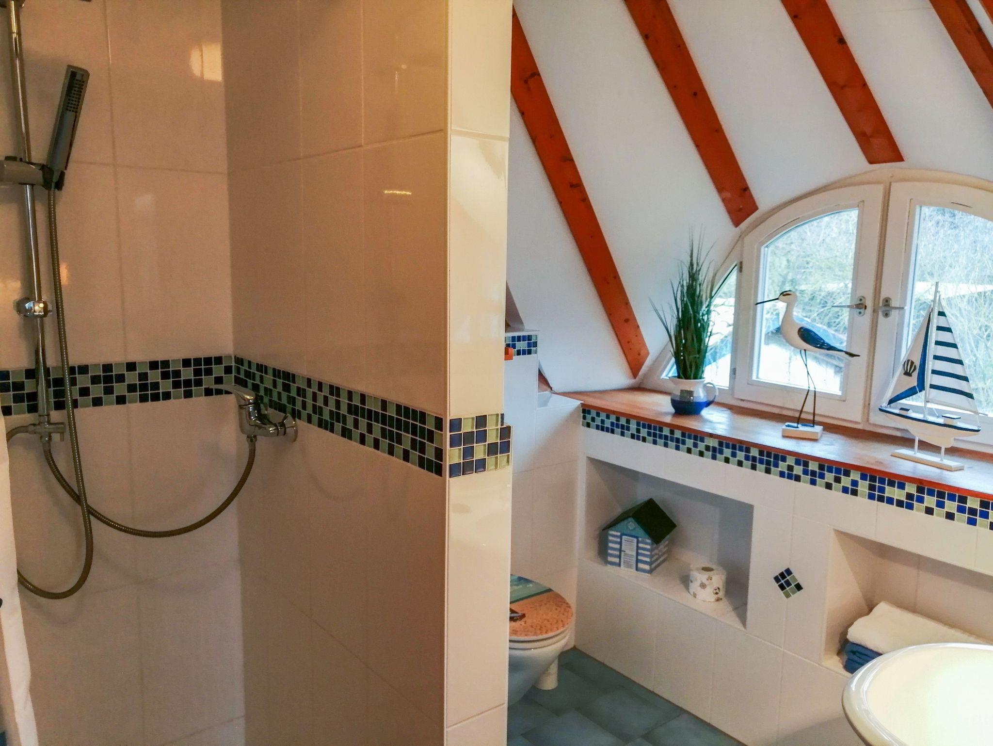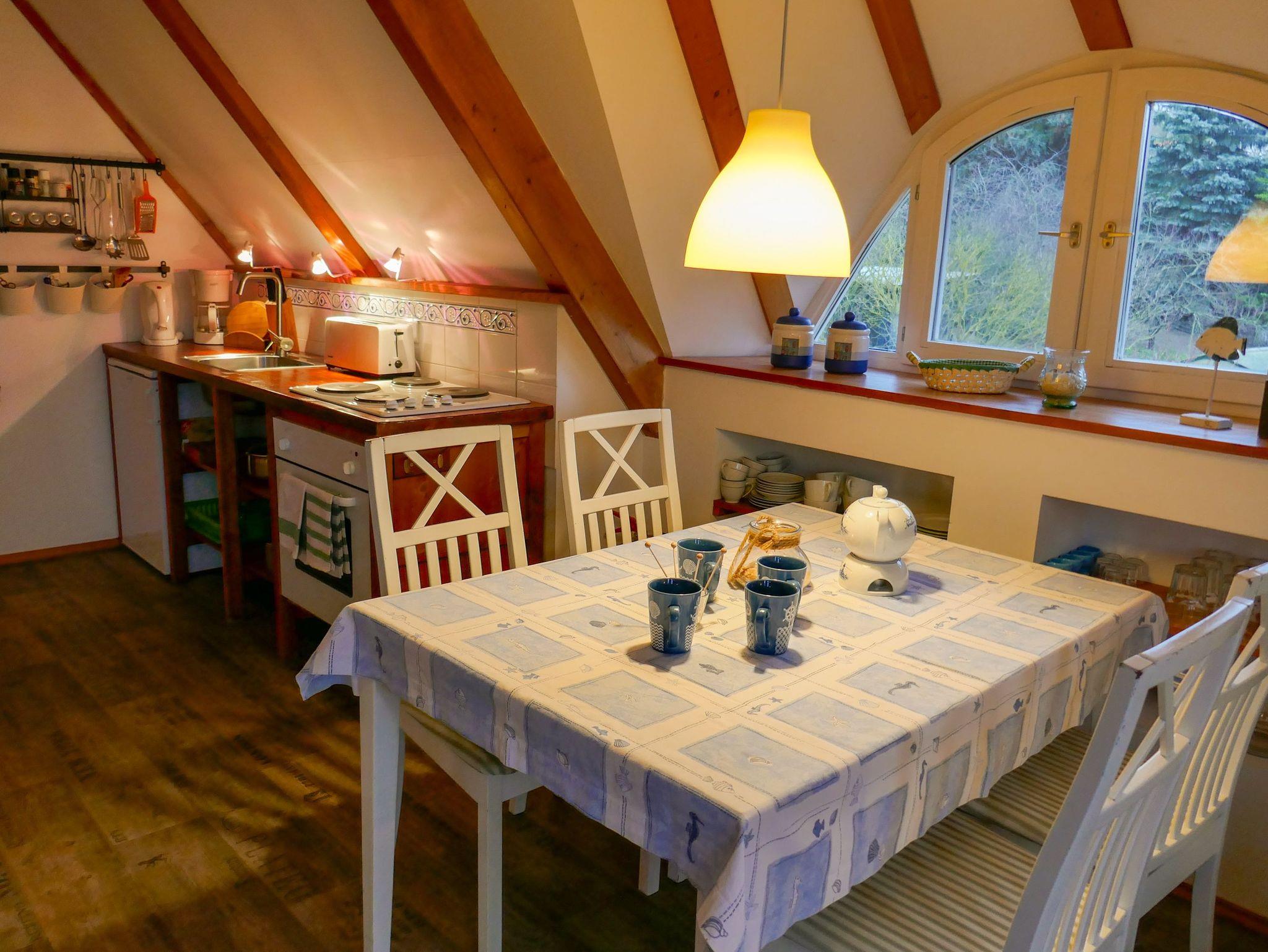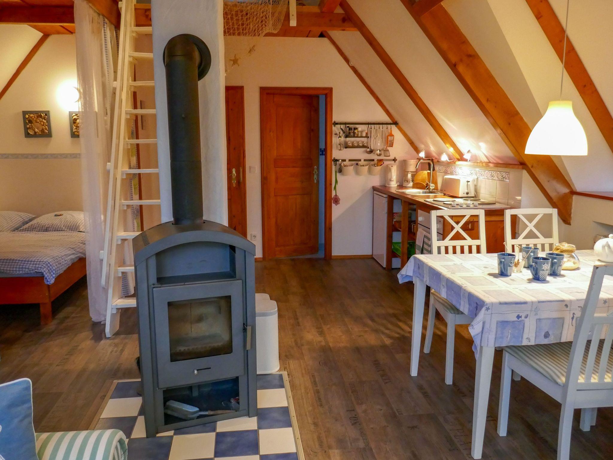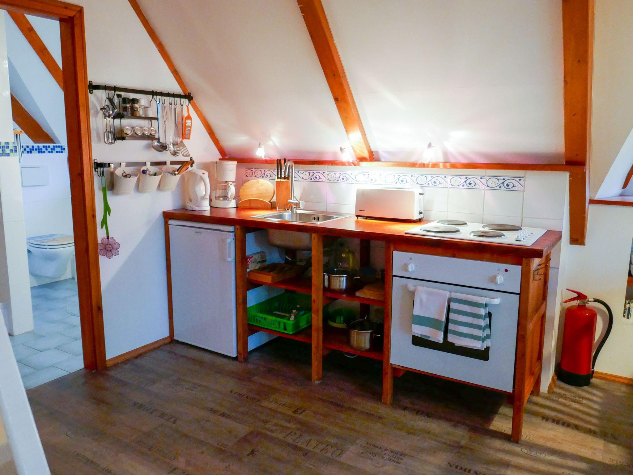 Die Ferienwohnung Albatros befindet sich im Obergeschoss des Reetdachhauses und ist ideal für 4 Personen geeignet. Sie ist als offenes Studio konzipiert und besticht mit einem großen Wohnraum mit Kamin und offenem Dachstuhl. Der maritime und luftige Flair lädt sie direkt ein ihre Seele baumeln zu lassen. Ihnen steht ein Wohnzimmer mit offener Küchenzeile und Esstisch zur Verfügung. Vom Wohnbereich abgetrennt durch Vorhang und Klapptüren finden sich die beiden Schlafkojen, einmal mit einem Doppelbett (180x200) und eine kleinere Schlafkoje (90x200). Über eine Raumspartreppe erreichen sie einen weiteren Rückzugsort mit einem Schlafboden (90x200). Das Tageslicht-Bad ist mit einer Dusche und WC ausgestattet.