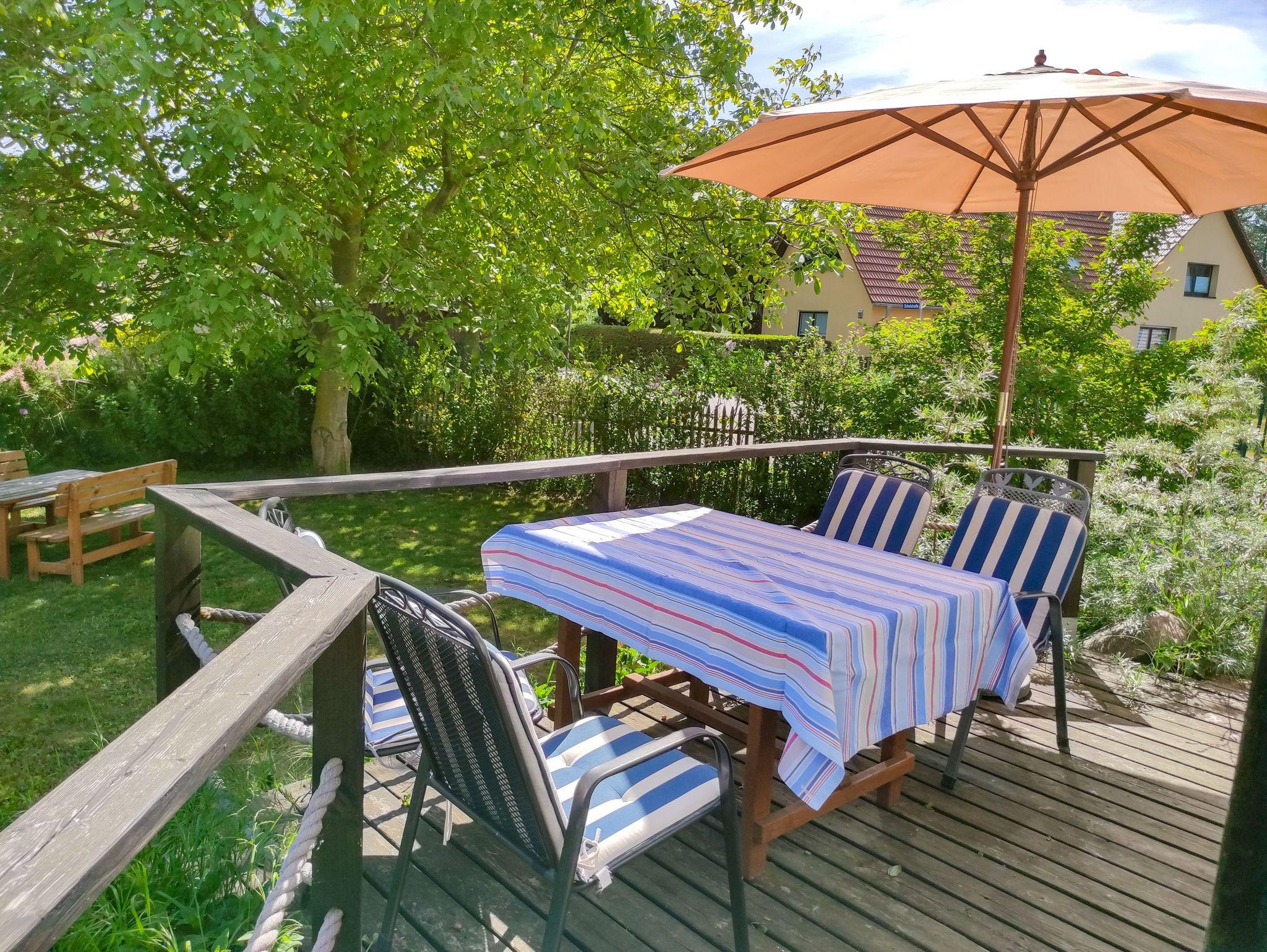 Die große Terrasse zum Garten mit Sitzgruppen und Sonnenschirm lädt zum Verweilen ein.