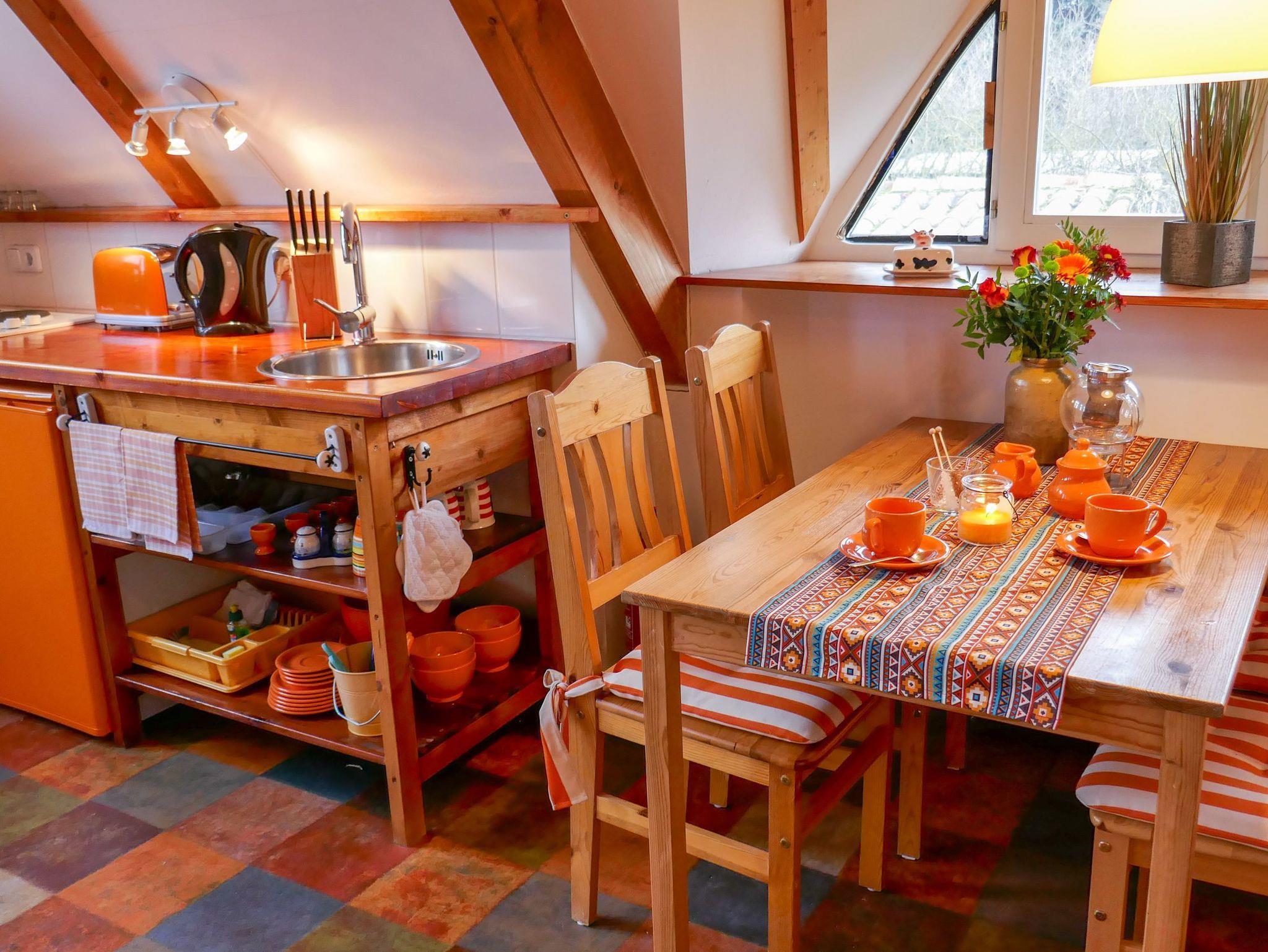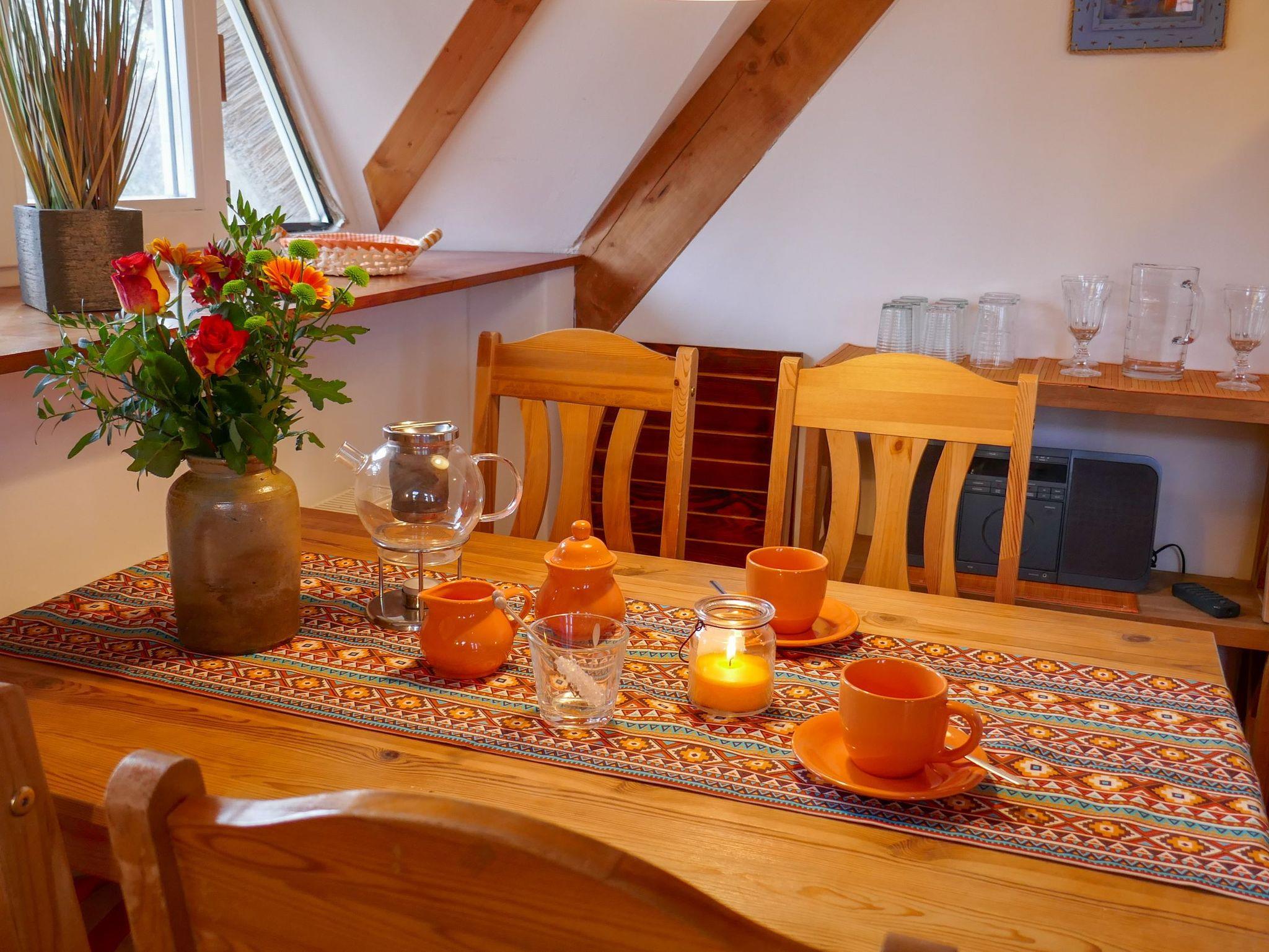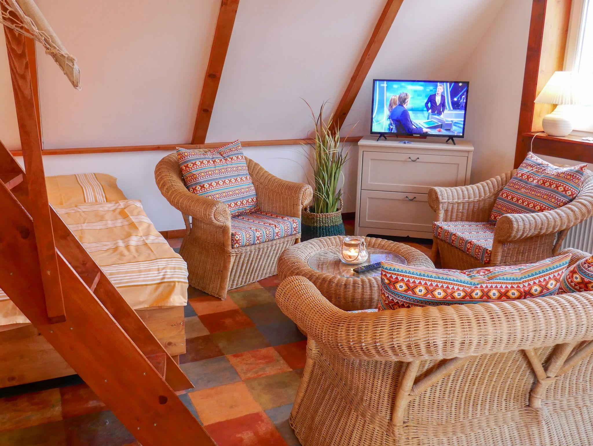 Die Ferienwohnung Paloma befindet sich im Obergeschoss des Reetdachhauses und ist ideal für 2 Personen geeignet. Ihr offener und luftiger Charakter begrüßt sie direkt mit Urlaubsfeeling. Im geräumigen Wohnzimmer finden sie eine Küchenzeile mit Kochfeld und Kühlschrank, einen Esstisch und einen gemütlichen Sitzbereich vor dem TV. Das Doppelbett (180x200) befindet sich leicht separiert neben der Raumspartreppe. Das Tageslicht-Bad ist mit einer Dusche und WC ausgestattet.