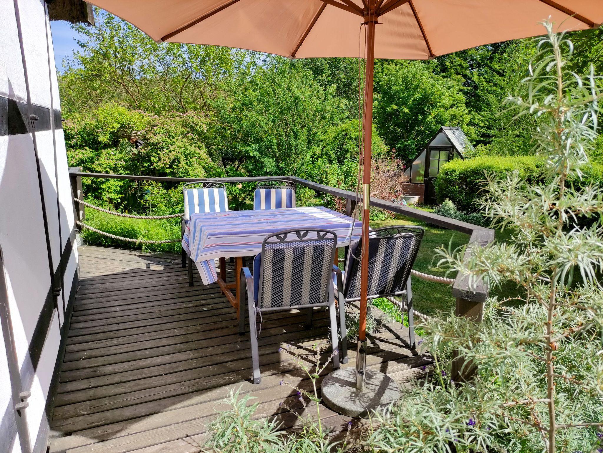 Die große Terrasse zum Garten mit Sitzgruppen und Sonnenschirm lädt zum Verweilen ein.
