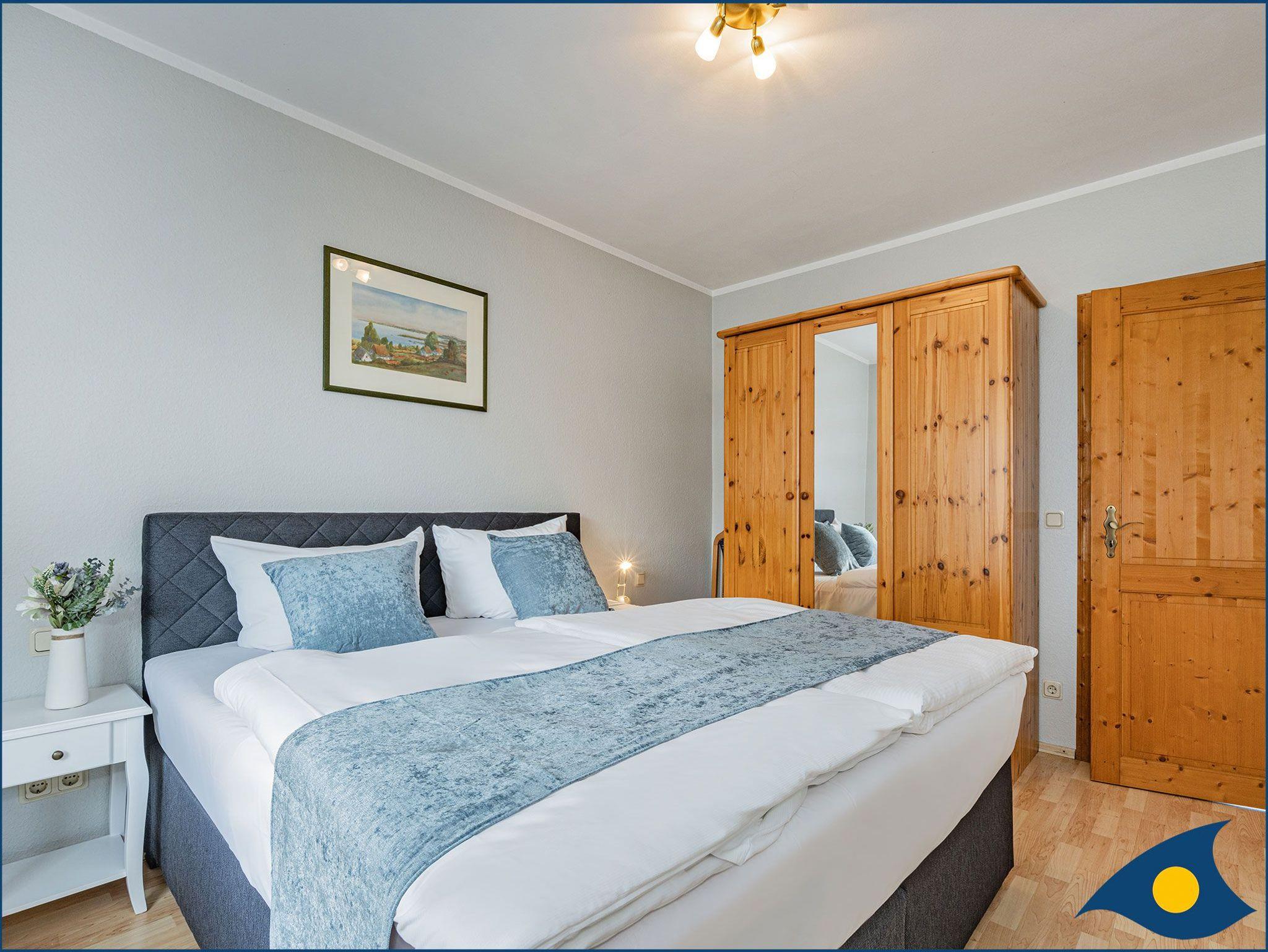 Ein Schlafzimmer verfügt über ein großes Doppelbett (200cm x 180cm), dass zweite Schlafzimmer über ein französisches Bett (200cm x 140cm). Für ein Kleinkind bis zwei Jahre besteht die Möglichkeit zur Aufbettung mittels eines Kindereisebettes (Zusatzgebühr).