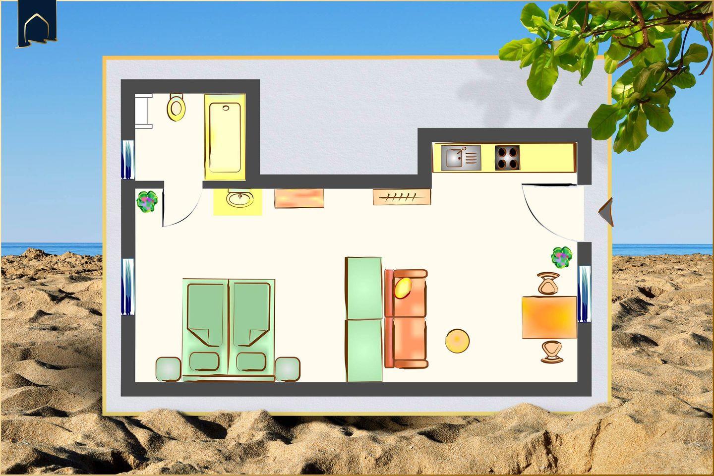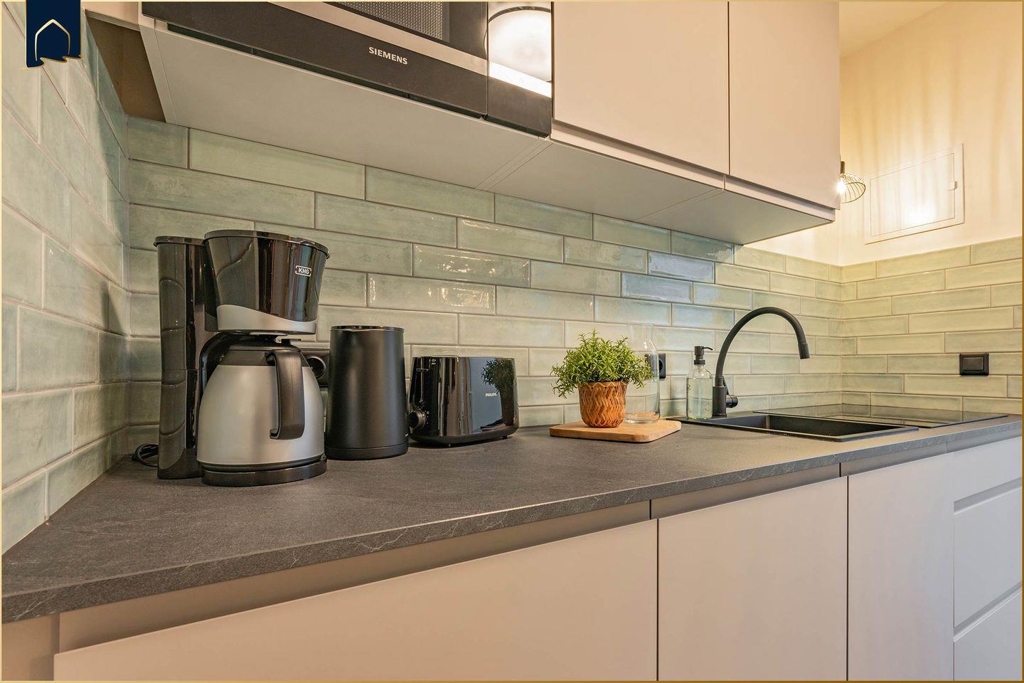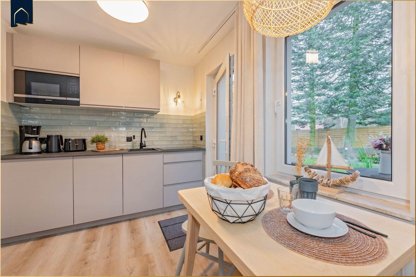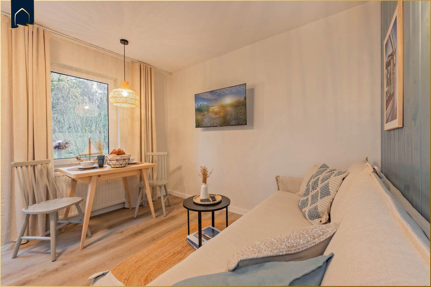 Die Wohnung verfügt über ein gemütliches Schlafzimmer, ein modernes Badezimmer mit Dusche sowie einen offenen Wohn- und Essbereich. Die voll ausgestattete Küche mit Herd, Kühlschrank, Gefrierfach, Spülmaschine, Mikrowelle, Toaster, Wasserkocher und Kaffeemaschine lässt keine Wünsche offen – ideal für Selbstversorger. Für Unterhaltung sorgen WLAN und ein Flachbild-TV, während gemütliche Sofaecke und Esstisch zum Verweilen einladen. Praktische Extras wie Haartrockner, Kosmetikspiegel und Wäscheständer runden das Angebot ab.