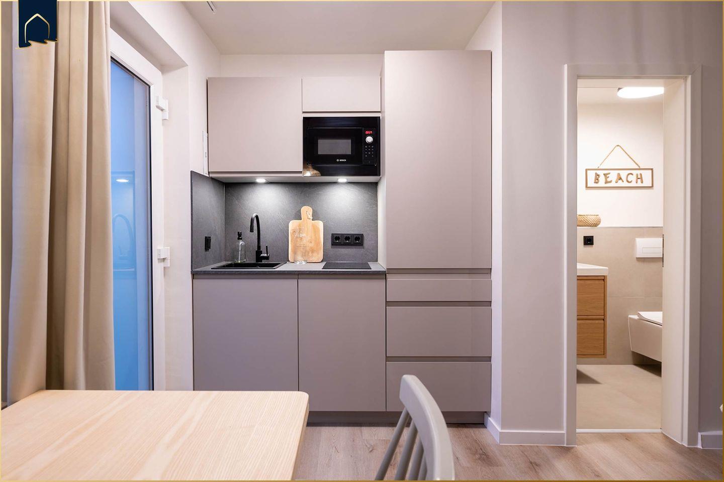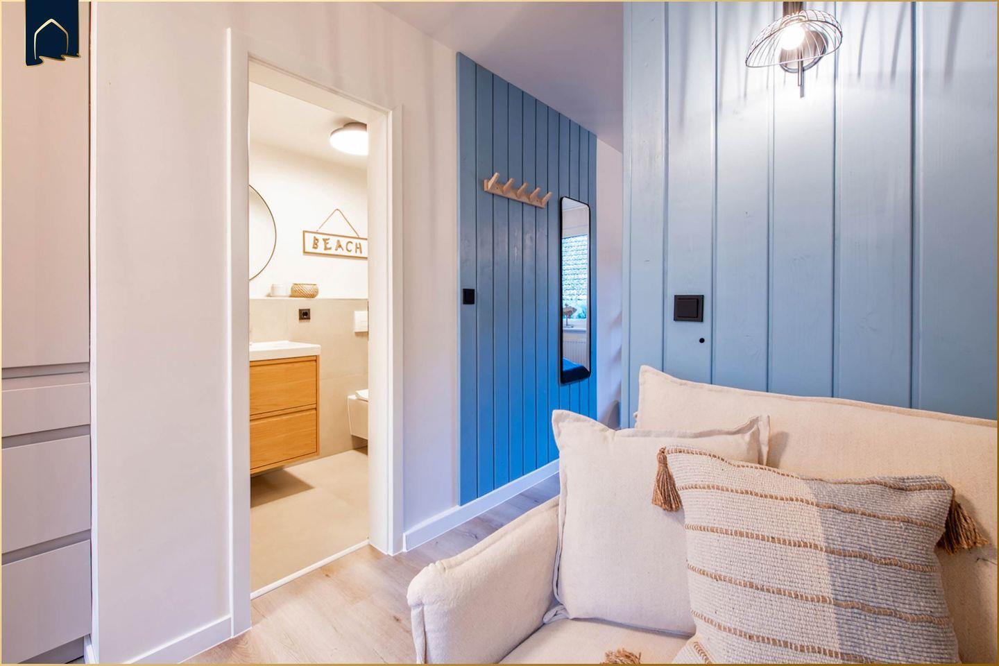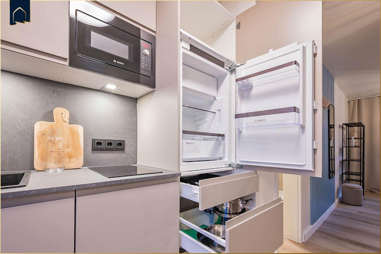 Im Inneren erwartet Sie eine liebevoll eingerichtete Wohnung mit durchdachter Ausstattung. Das separate Schlafzimmer verfügt über ein bequemes Doppelbett, während eine weitere Schlafmöglichkeit im Wohnbereich vorhanden ist – ideal für bis zu drei Gäste. Das Wohnzimmer mit Sofa, TV und Essbereich lädt zum Entspannen ein. Die moderne Küchenzeile ist mit Kühlschrank, Gefrierfach, Herd, Mikrowelle, Kaffeemaschine, Toaster, Wasserkocher sowie Geschirrspüler und sämtlichen Küchenutensilien ausgestattet – hier bleibt kein Wunsch offen.