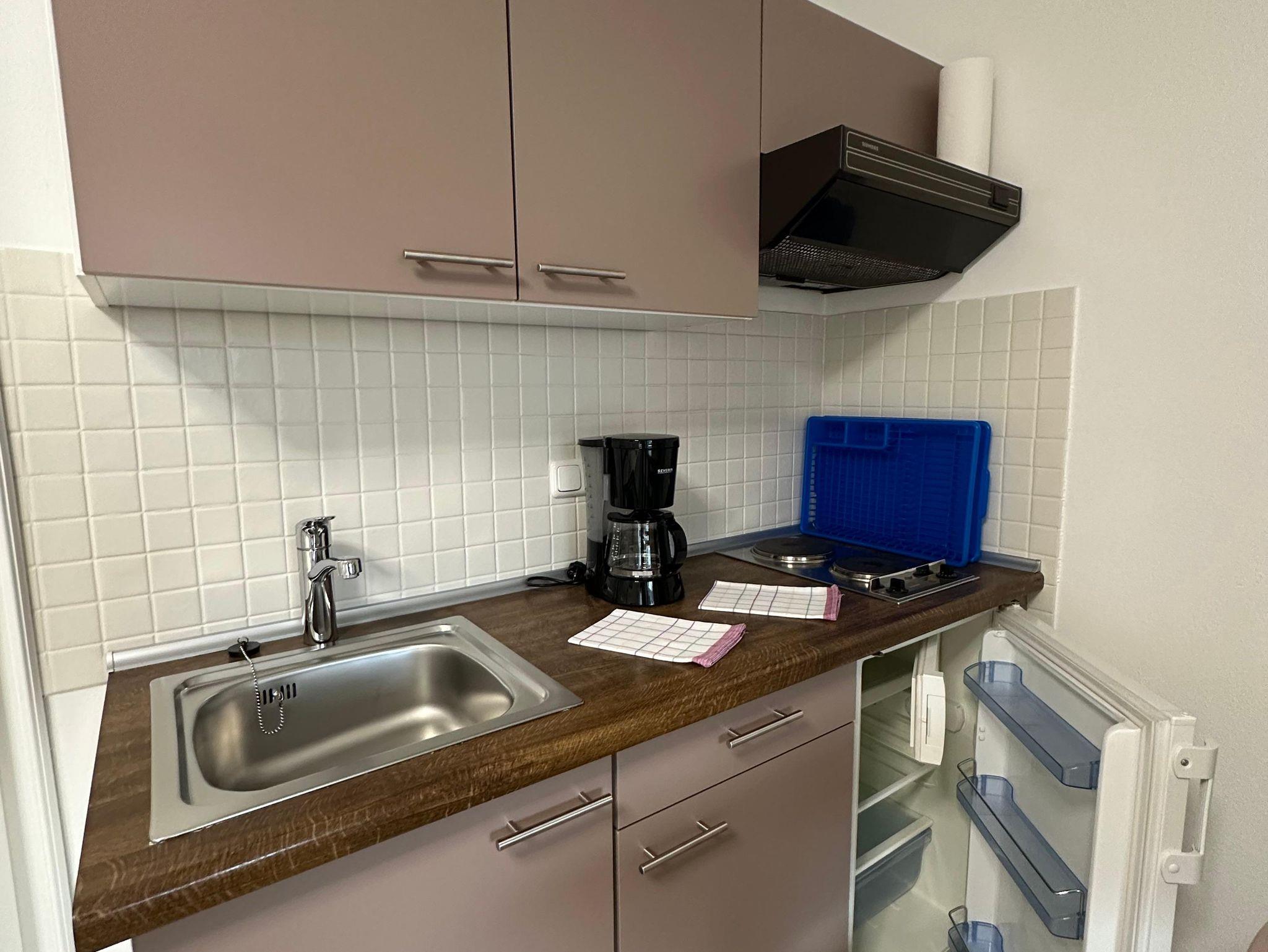 zweckmässig. Ein großer Kleiderschrank bietet Platz für Ihre persönlichen Dinge. Die Kochnische ist