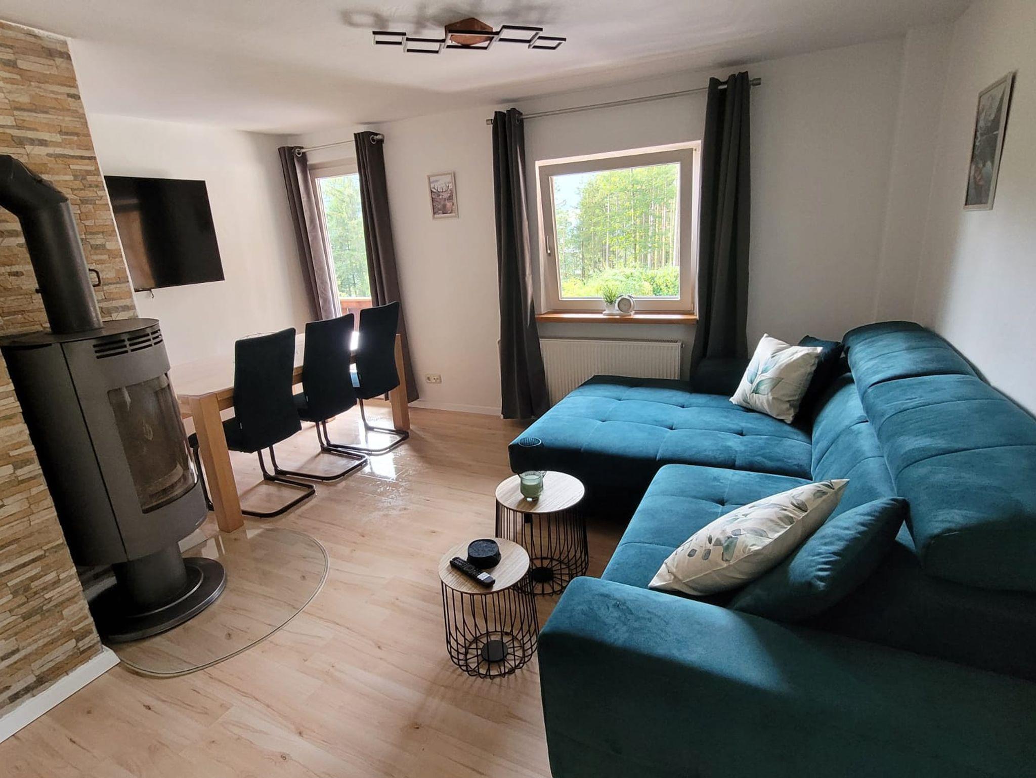 Im Wohnzimmer sorgt ein gemütlicher Holzofen für eine angenehme Atmosphäre, besonders an kühleren Tagen. Das Sofa im Wohnzimmer kann bei Bedarf als Schlafsofa ausgezogen werden und bietet somit zwei zusätzliche Schlafplätze.
