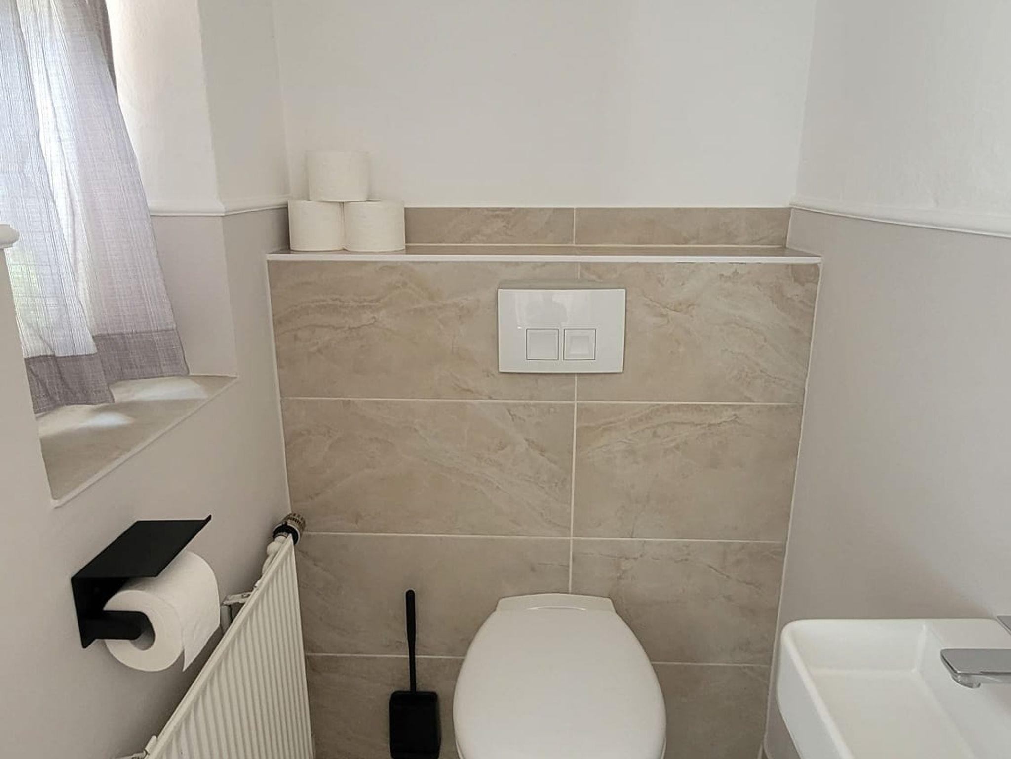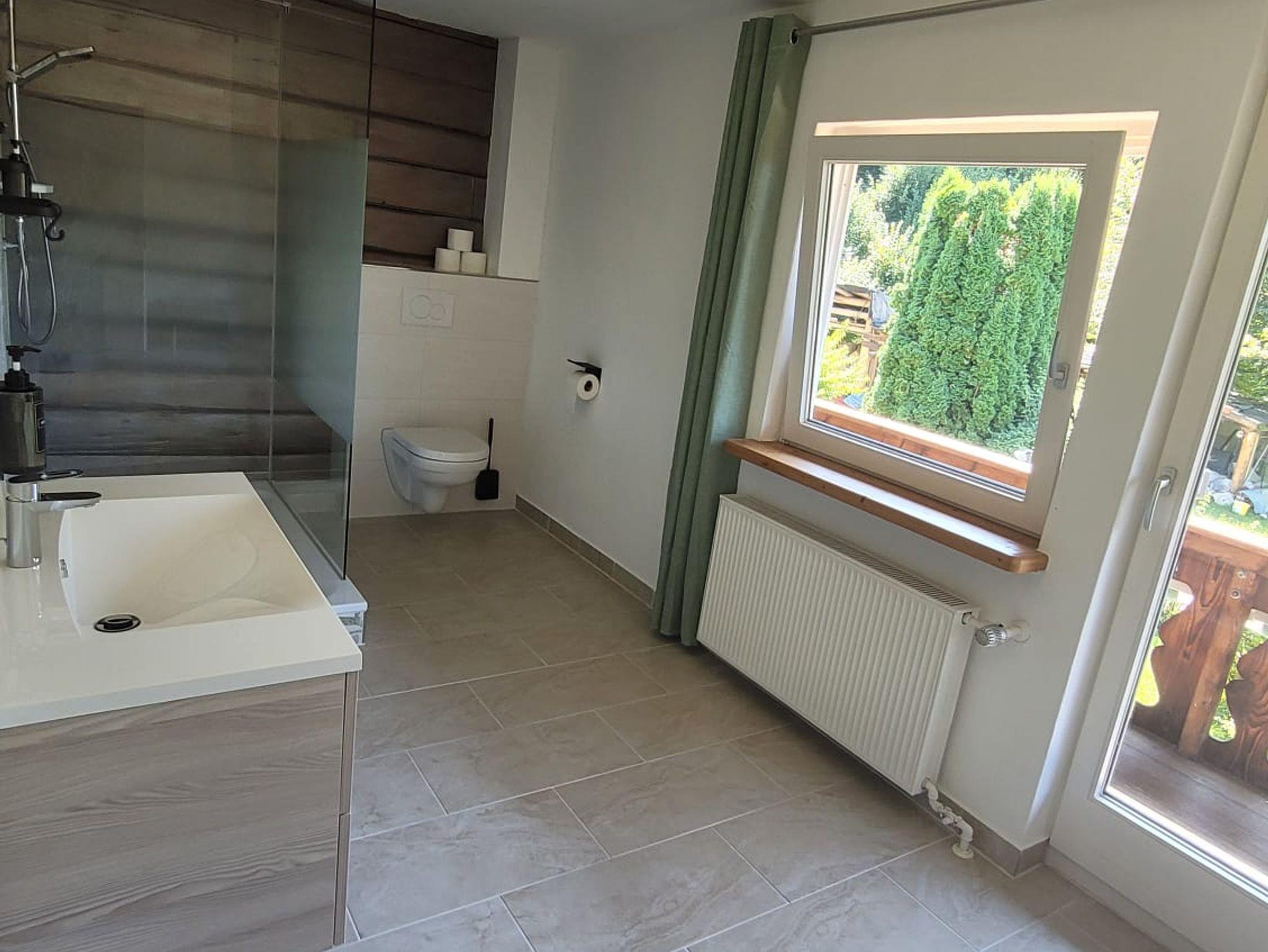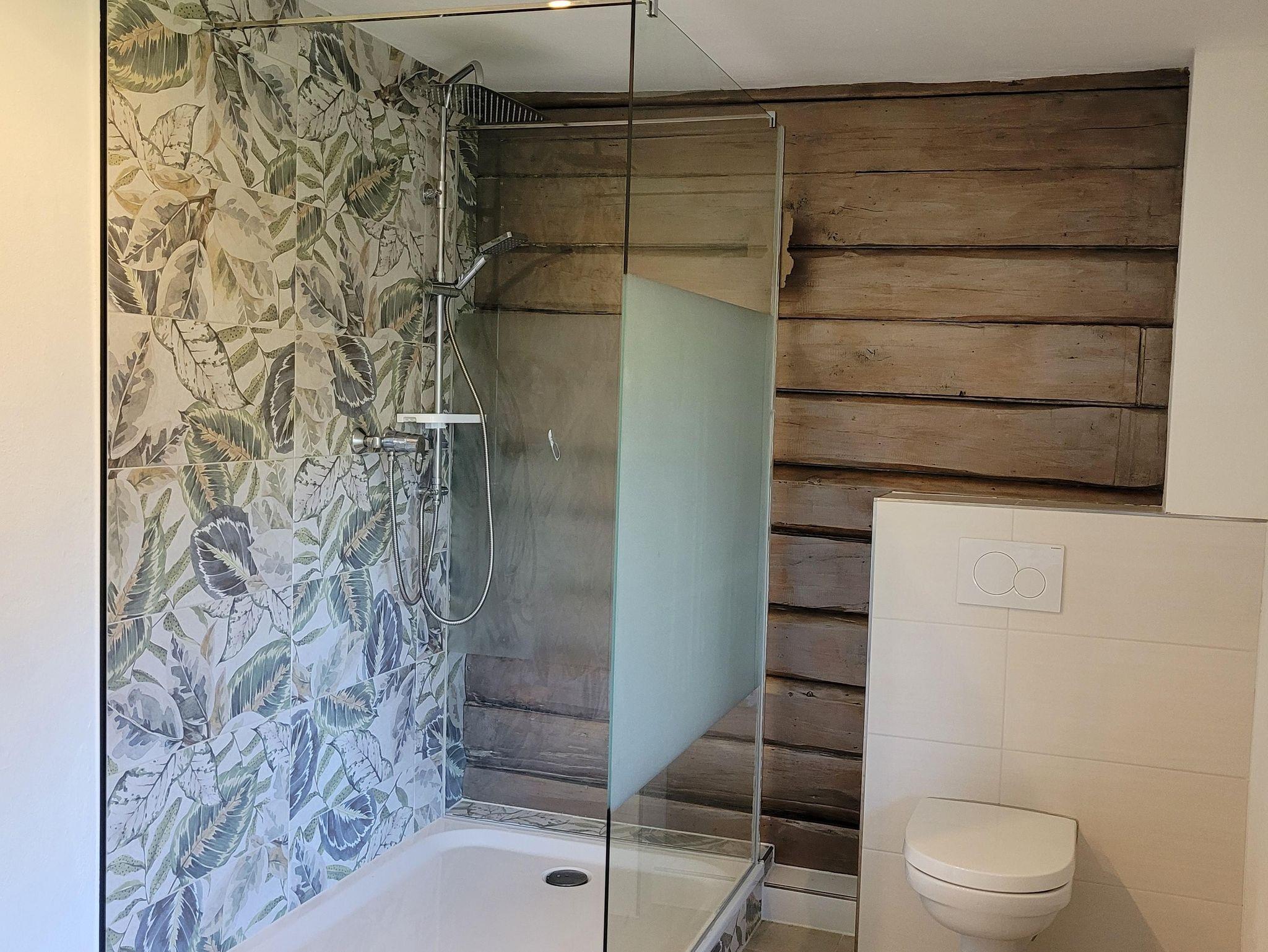 Das Badezimmer wurde modernisiert und beeindruckt durch eine große Dusche sowie die sichtbare Holzaußenwand, die dem Raum ein einzigartiges optisches Highlight verleiht. Zusätzlich gibt es ein WC im Badezimmer. Ein weiteres WC ist bequem über den Flur erreichbar, was den Komfort für alle Gäste erhöht.