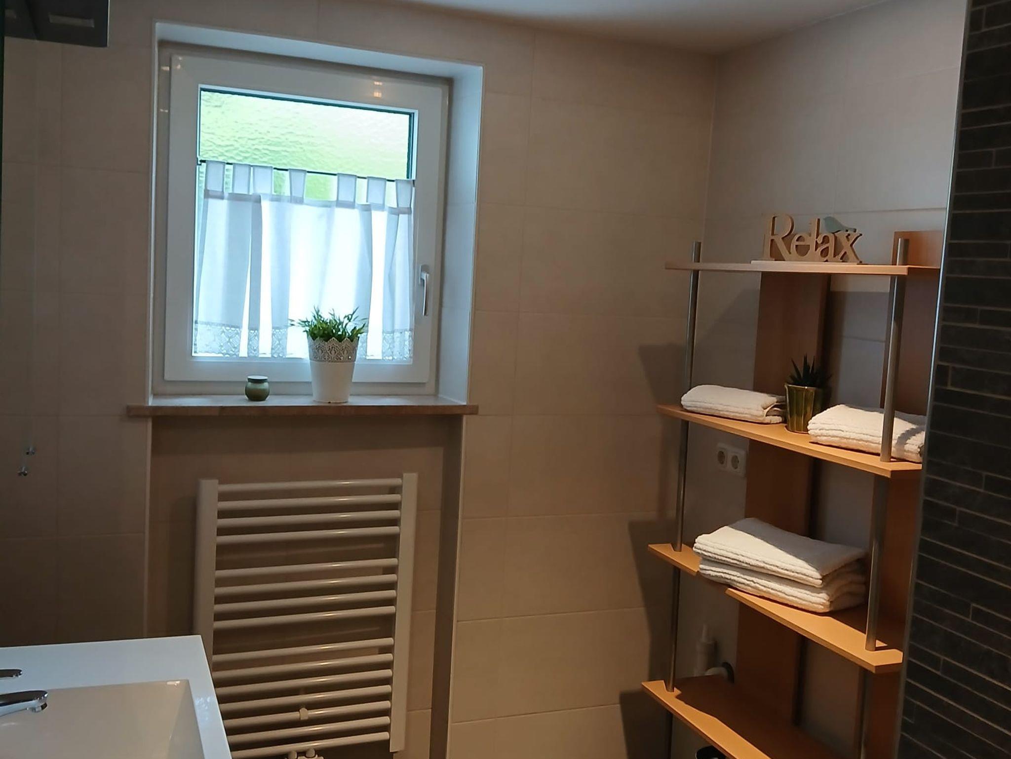 Ein Bad mit Fenster, WC und große ebenderdige Dusche und einen kleien Hausgang.