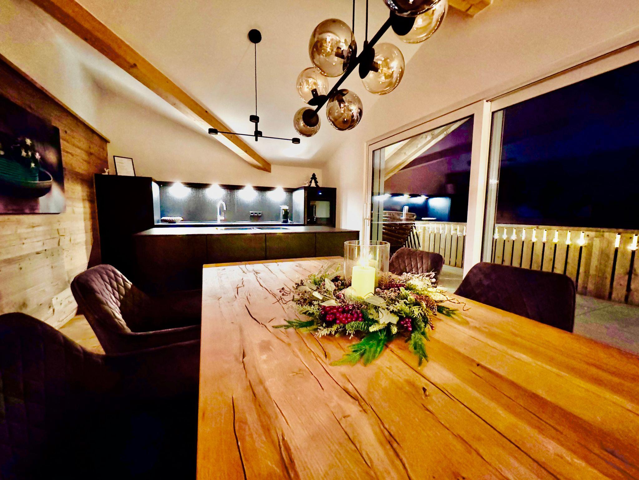Die offene, hochwertig ausgestattete Küche lässt das Herz aller Hobby-Köche höherschlagen. Ein moderner freistehender Küchenblock mit Induktionskochfeld lädt zum gemeinsamen Kochen ein, während ein Backofen und eine Coffee-B-Kaffeemaschine den Komfort perfekt abrunden. Ob schneller Espresso am Morgen oder ein festliches Menü am Abend – hier bleiben keine Wünsche offen. Am großzügigen Massivholz-Esstisch finden alle Gäste Platz – ein zentraler Ort für genussvolle Mahlzeiten und gesellige Momente.