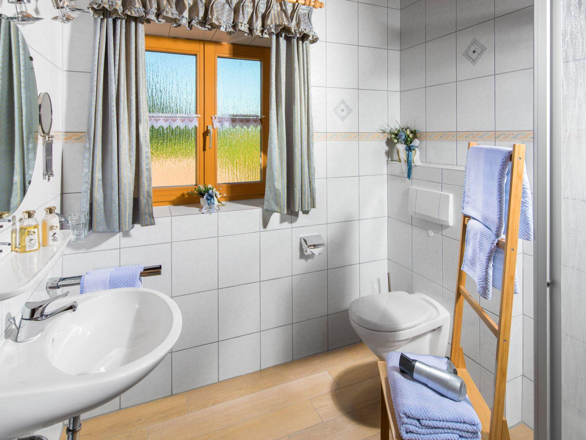 Das Tageslichtbad ist mit WC und Dusche, Waschbecken, Fön und ein Kosmetikspiegel ausgestattet.