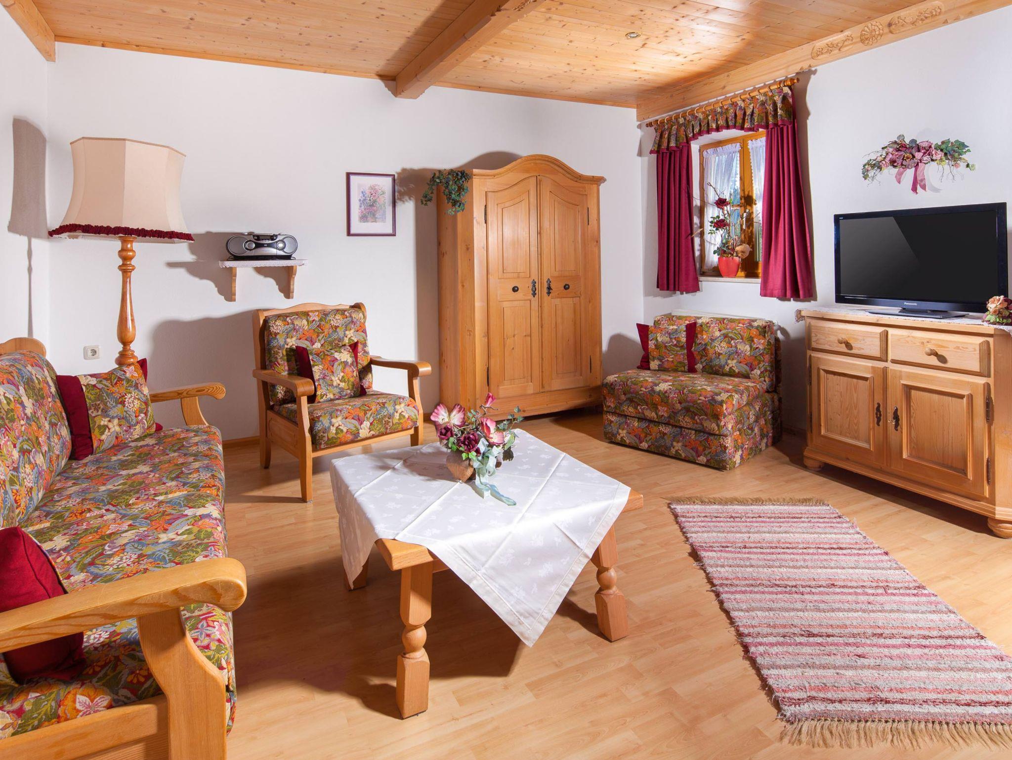 Das bayerische Wohnzimmer mit bequemer ausziehbarer Couch und ausziehbarem Sessel, SAT-Flachbildfernseher und Radio mit CD Player lädt zum Entspannen ein.