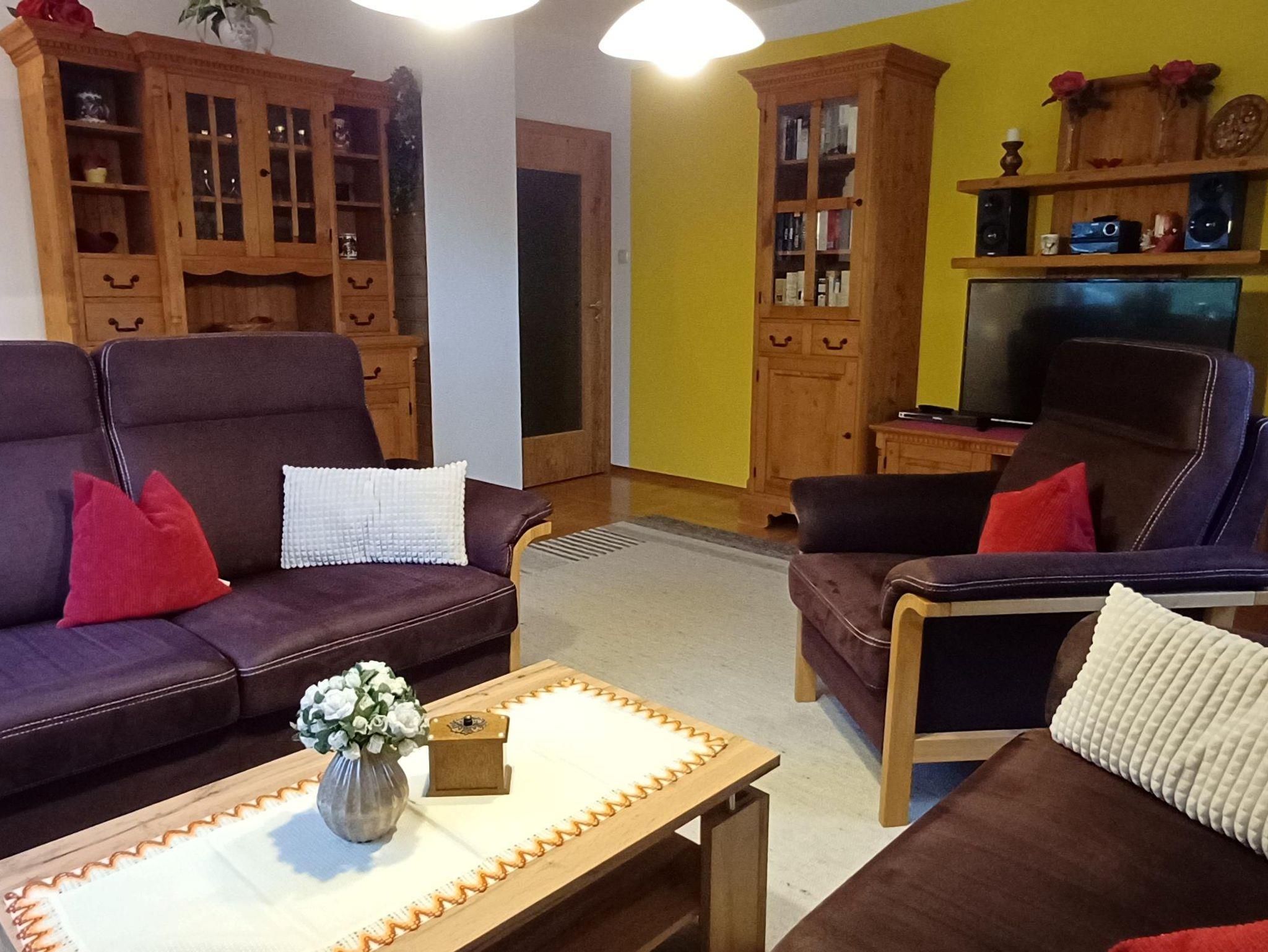 Großzügig ausgestattete Ferienwohnung im Erdgeschoß mit komplett eingerichteter Küche (E-Herd + Ceranfeld, Backrohr, Kaffeemaschine, Eierkocher, Wasserkocher, Toaster, Mikrowelle, Aufschnittmaschine, Geschirrtücher und Reinigungsmaterial). Badezimmer mit Dusche sowie Hand- und Duschtücher. Wohnzimmer mit LED-Farb-TV, DVD-Player, Stereoanlage, Bücherschrank, Brettspiele. Zwei separate Schlafzimmer mit Doppelbett sowie je einem ausziehbaren Schlafsessel. Bettwäsche wird gestellt.