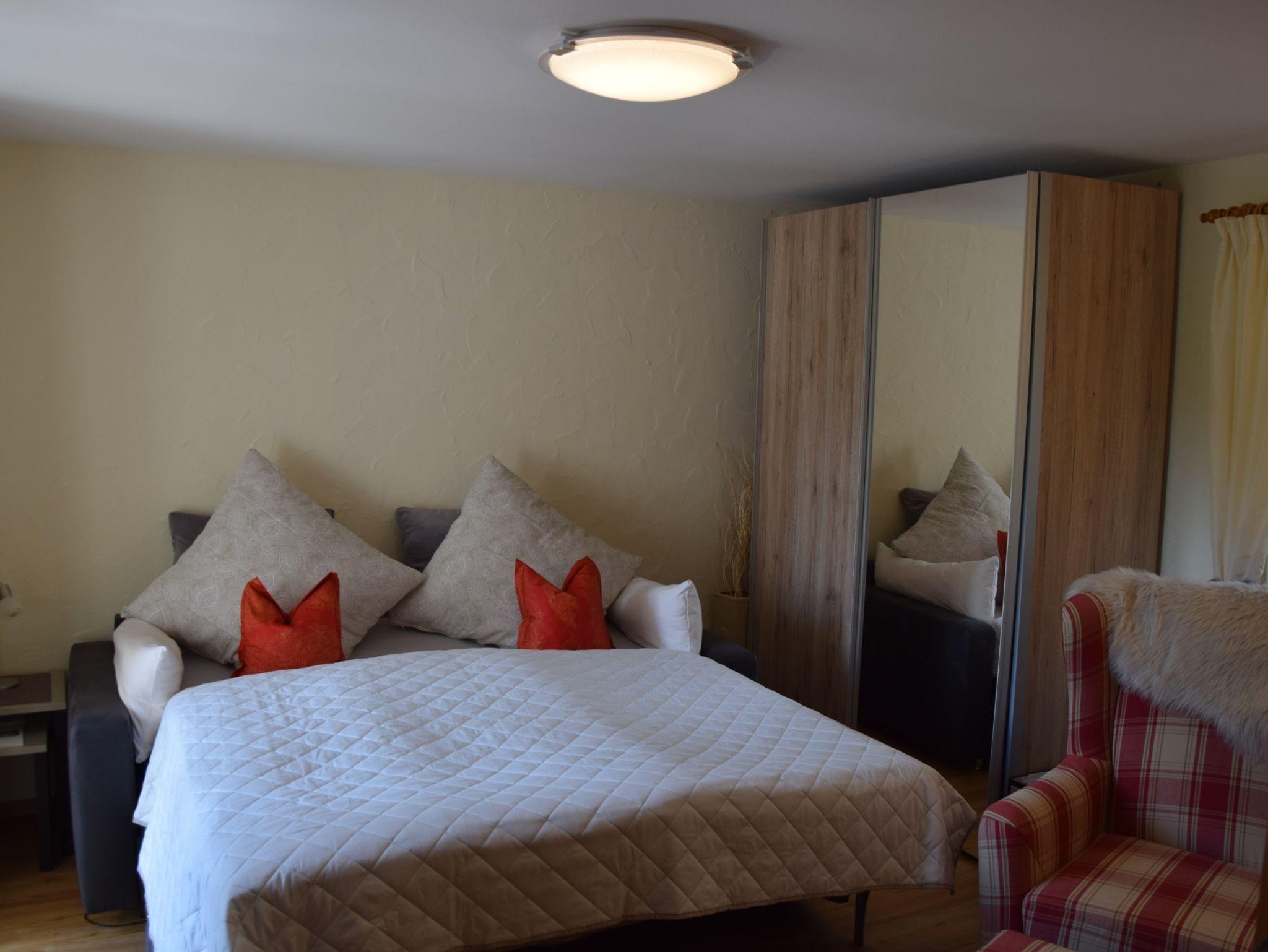 Die Ferienwohnung ist modern-gemütlich eingerichtet. Sie besteht aus einer voll ausgestatteten Küche mit Sitzecke, einem Wohnschlafzimmer, einem Sat-TV mit Teufel Soundanlage und WLAN, einem Badezimmer mit Dusche und WC, einem Balkon, einem eigenem Parkplatz. Eine gemütliche Sitzecke im Freien mit Sonnenschirm und Grillmöglichkeit (Holzkohle oder Gas).