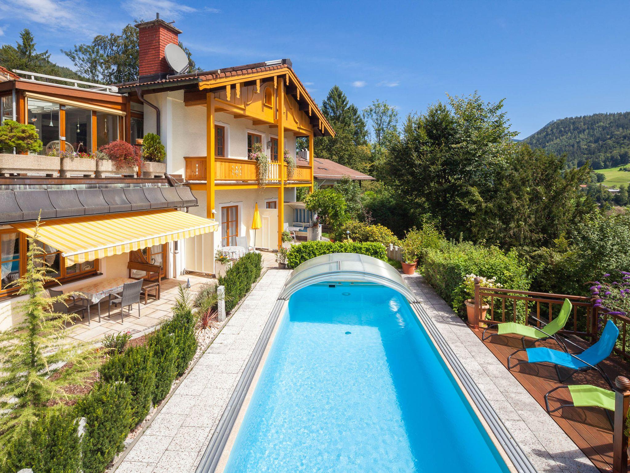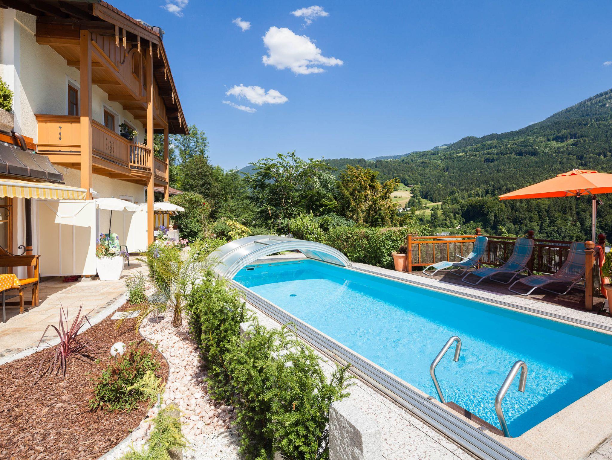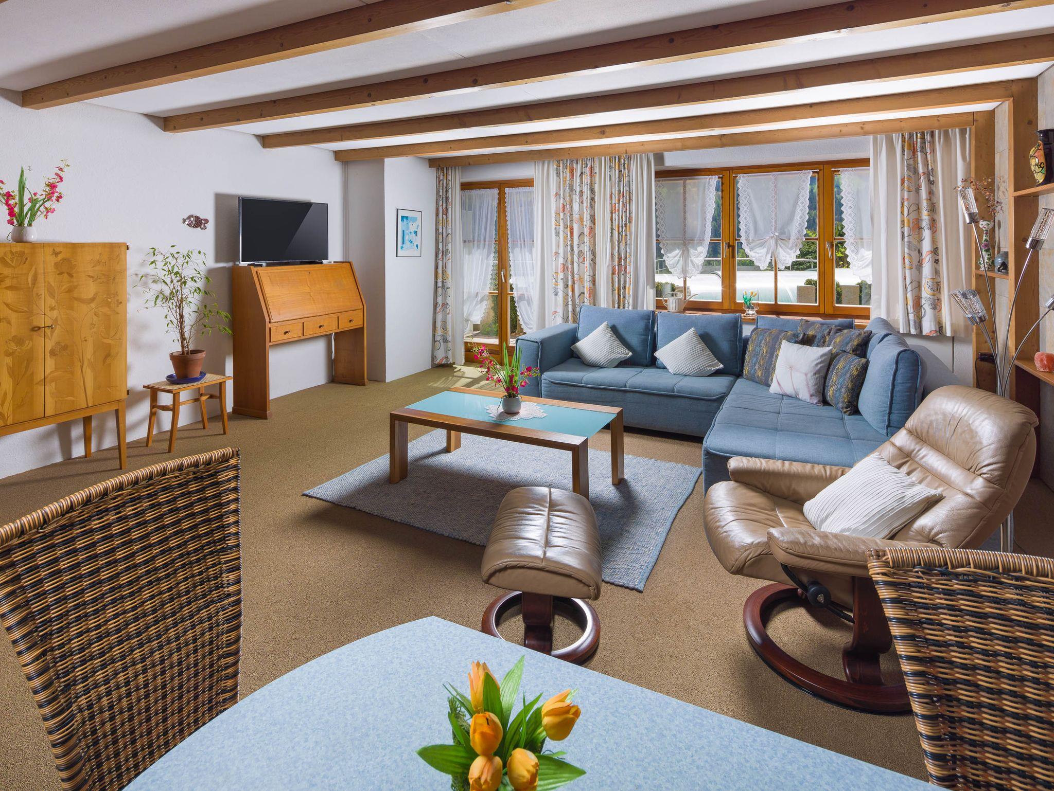 Genießen Sie gemeinsame Stunden im großzügigen Wohnzimmer – ideal, um Ihre Ausflüge zum Königssee, Kehlsteinhaus & Co. zu planen. Nach einem erlebnisreichen Tag lädt unser Garten mit Pool und teilüberdachter Terrasse zum Entspannen ein. Natürlich steht Ihnen auch schnelles WLAN zur Verfügung.