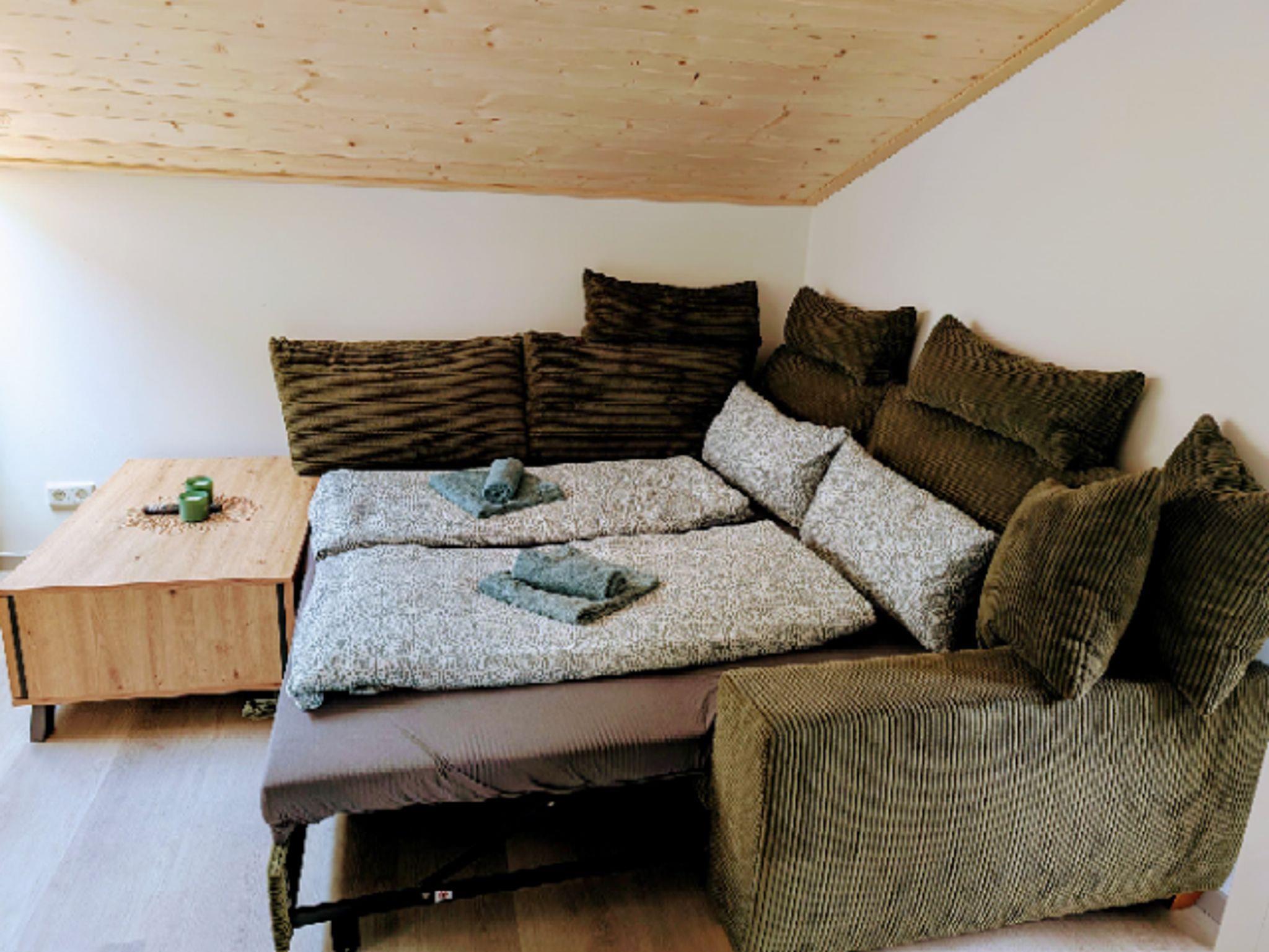 Im Wohnzimmer sorgt ein gemütlicher Holzofen für eine angenehme Atmosphäre, besonders an kühleren Tagen. Das Sofa im Wohnzimmer kann bei Bedarf als Schlafsofa ausgezogen werden und bietet somit zwei zusätzliche Schlafplätze.