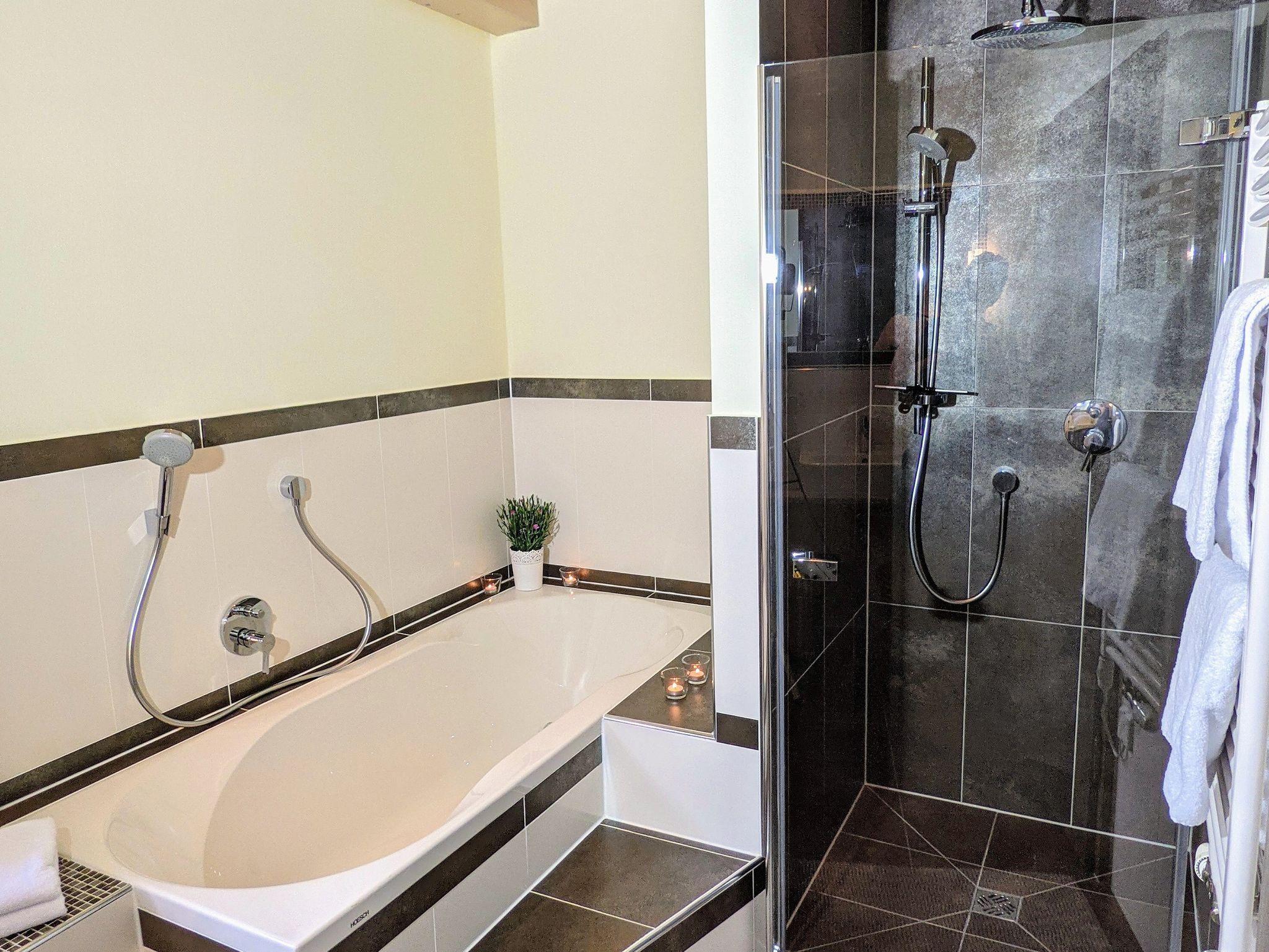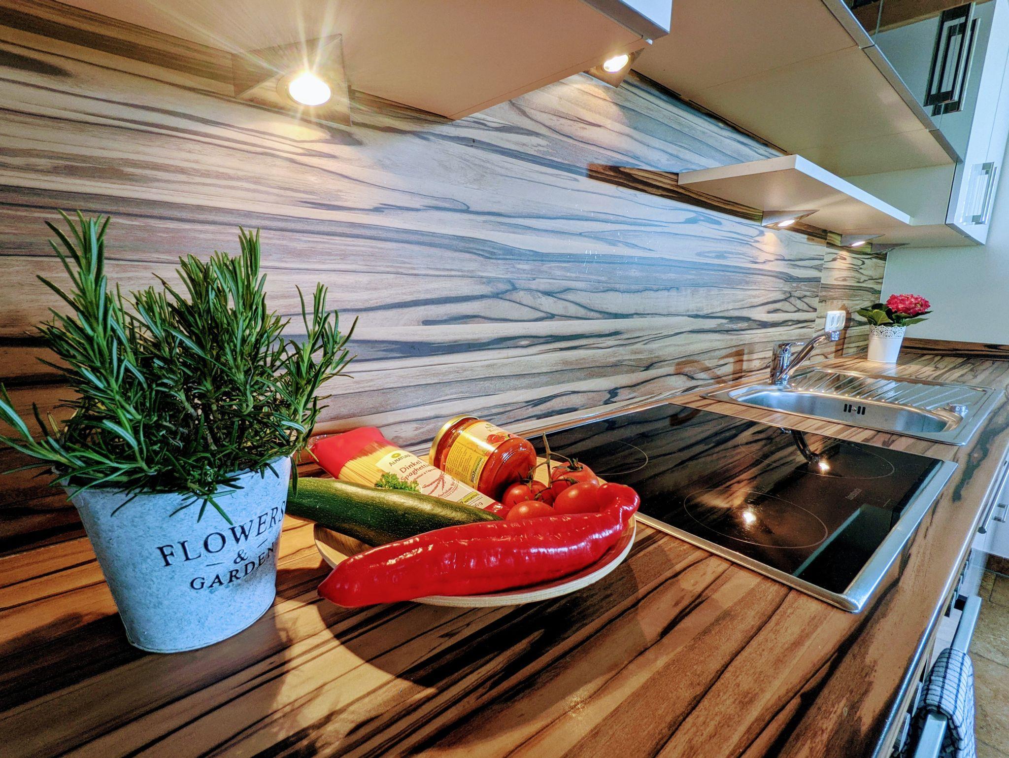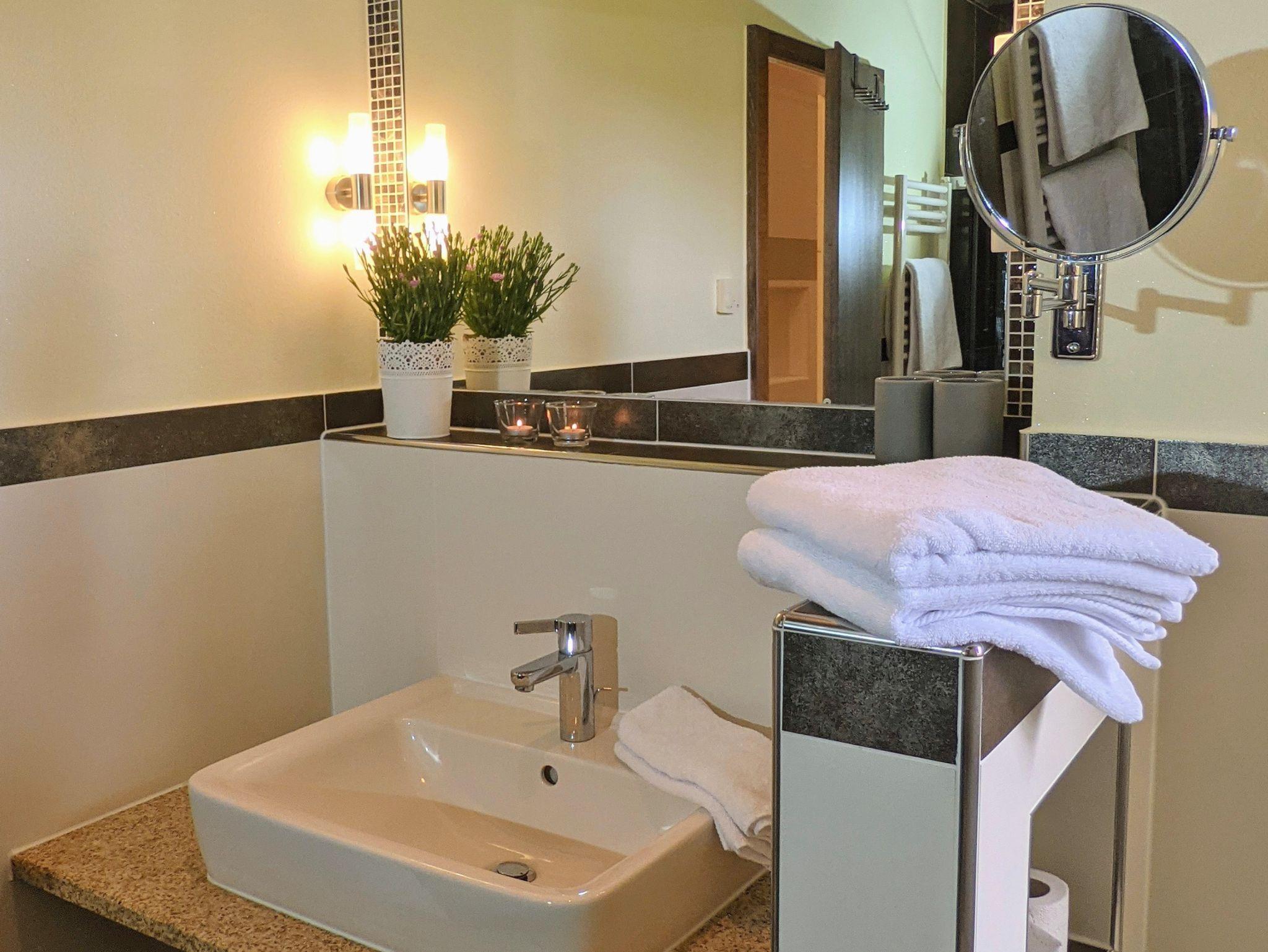 Die Wohnung ist mit 2 Schlafzimmern, einmal mit einem Doppelbett 180×200 und großen Kleiderschrank ausgestattet .Das kleinere ist mit zwei 90×200 Einzelbetten ausgestattet. Wir bieten kostenloses WLAN an. Ein Fernseher und ein Radio/CD-Player/Kassettenrecorder steht in der Küche für Sie bereit. Das Bad ist mit Dusche, WC und einer großen Badewanne ausgestattet. Handtücher, Fön und ein Kosmetikspiegel sind vorhanden. Unser Wohnzimmer verfügt über eine gemütliche Couch, einem Kachelofen, sowie einigen Büchern und Brettspielen. Die Küche ist voll ausgestattet mit Kaffeemaschine, Toaster, kleine Spülmaschine, Kühlschrank inkl. Gefrierfach. Auf dem Balkon finden Sie eine Sitzgelegenheit für 4-5 Personen, ein Babyhochstuhl ist vorhanden.