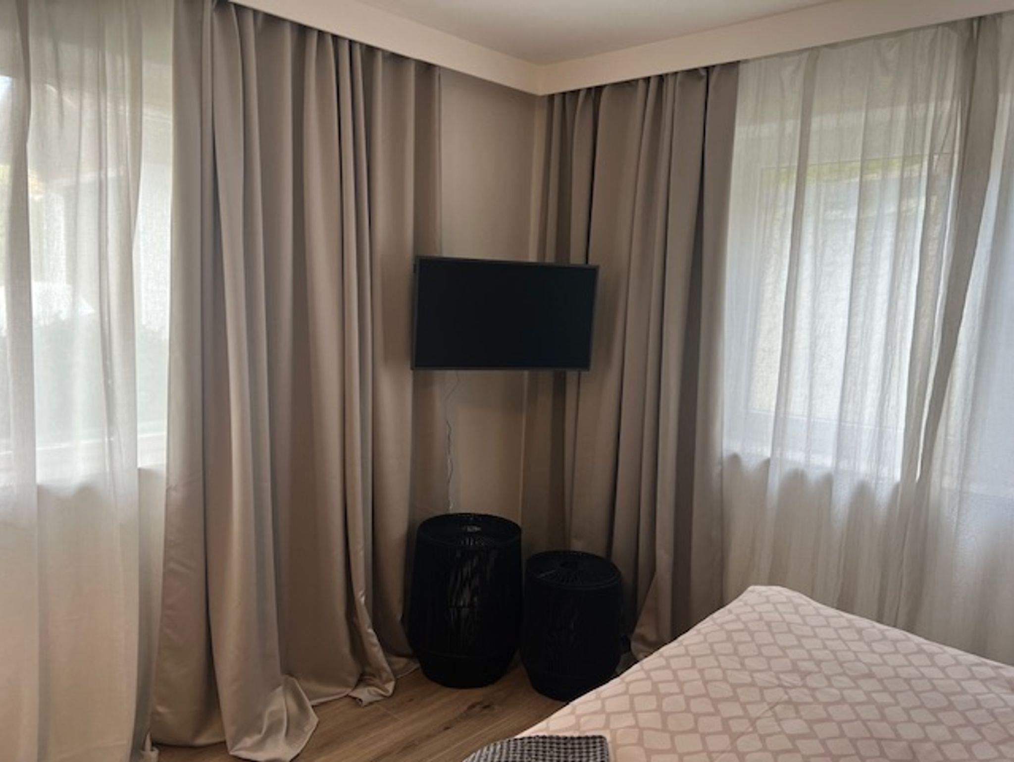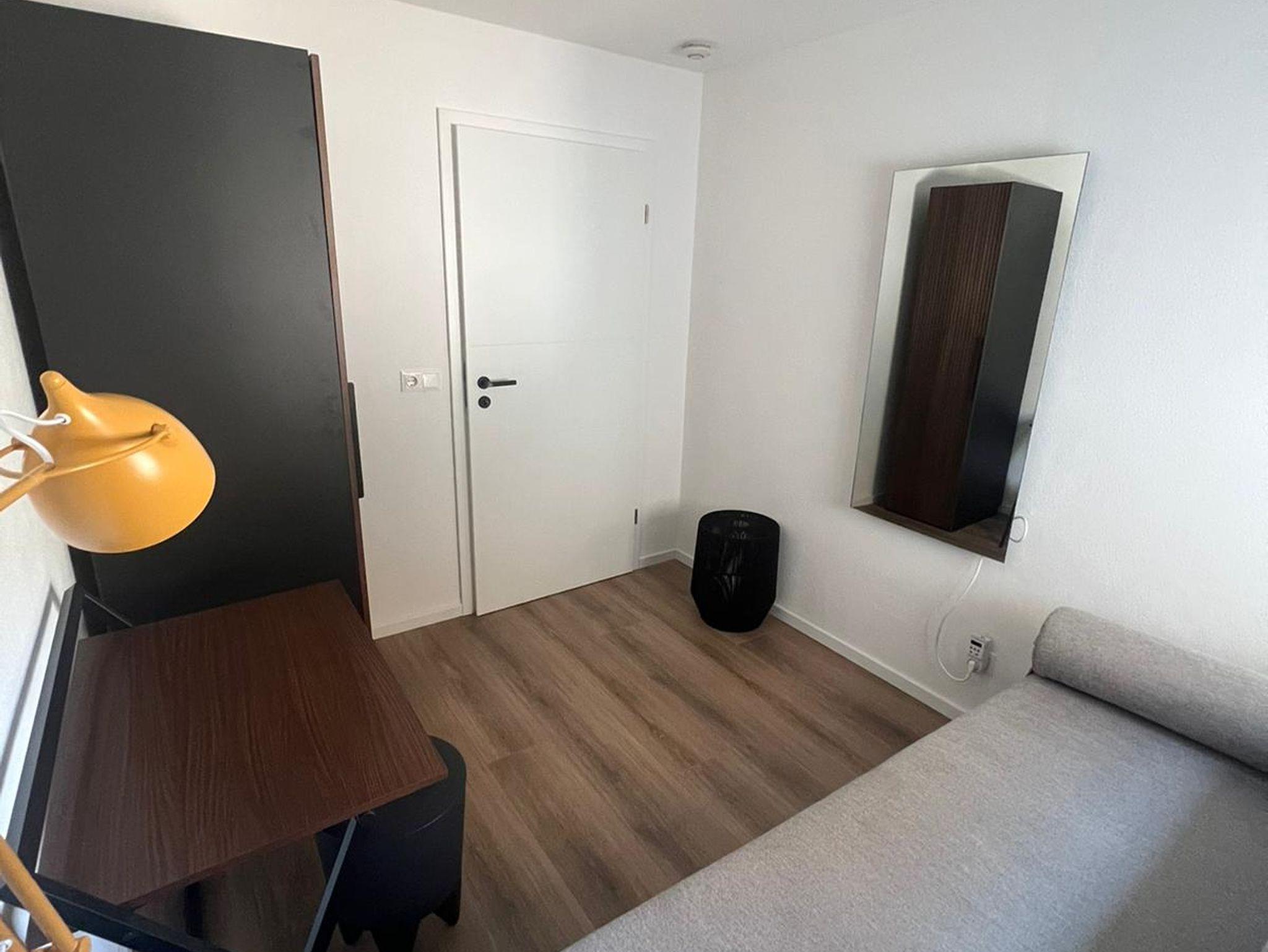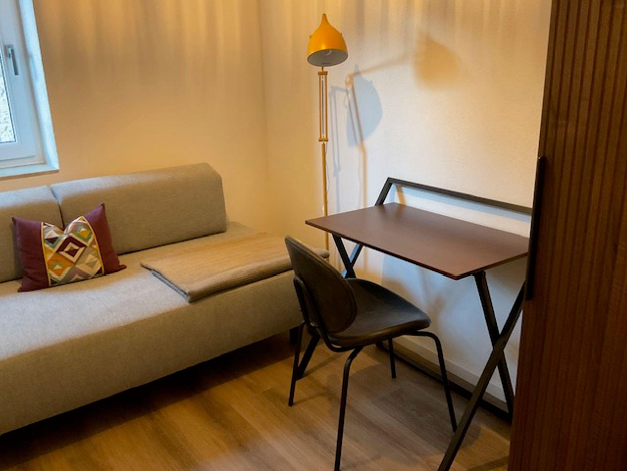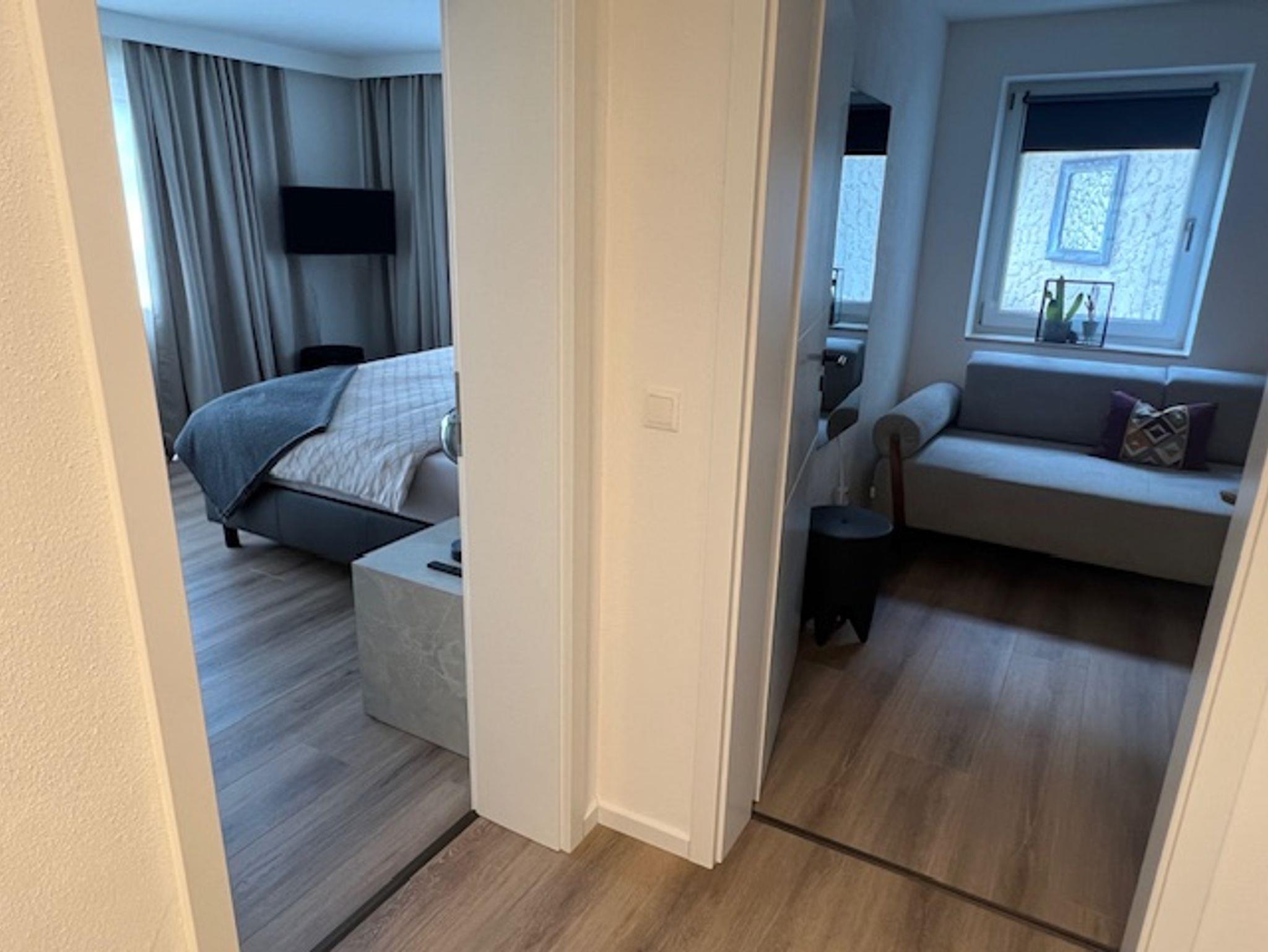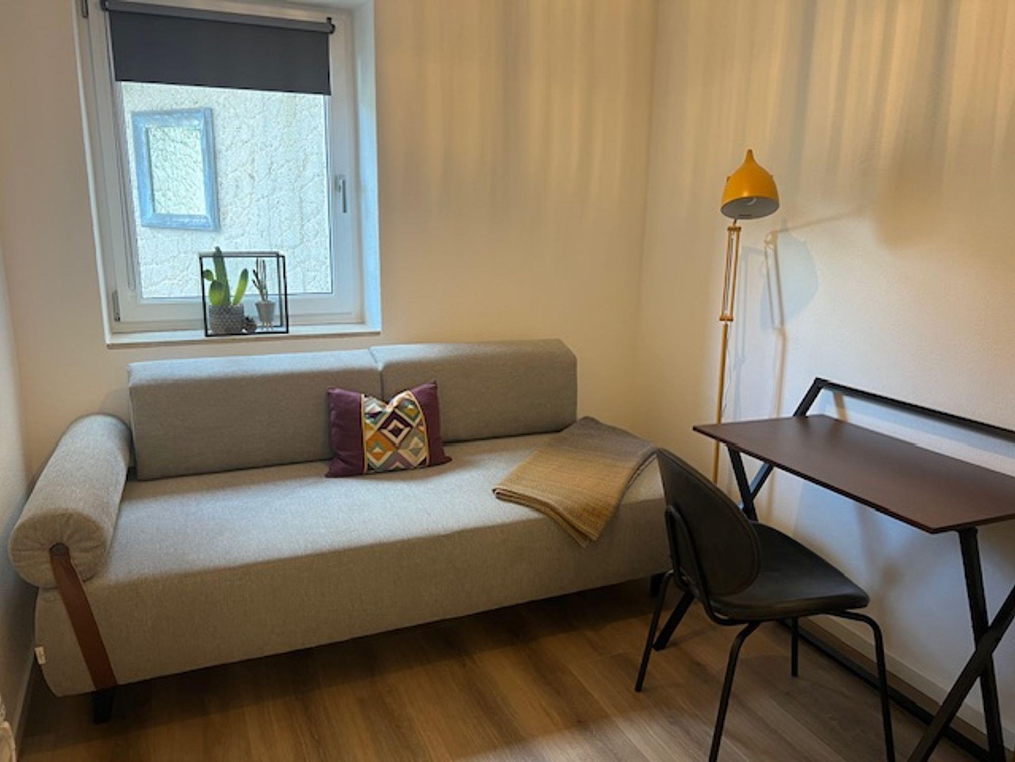 Es steht ihnen ein Bad mit ebenerdiger Dusche, ein geräumiges Schlafzimmer inkl. TV, kleines Zimmer mit Tagesbett und Schrank sowie ein Schreibtisch für Homeoffice/Büro zur Verfügung.