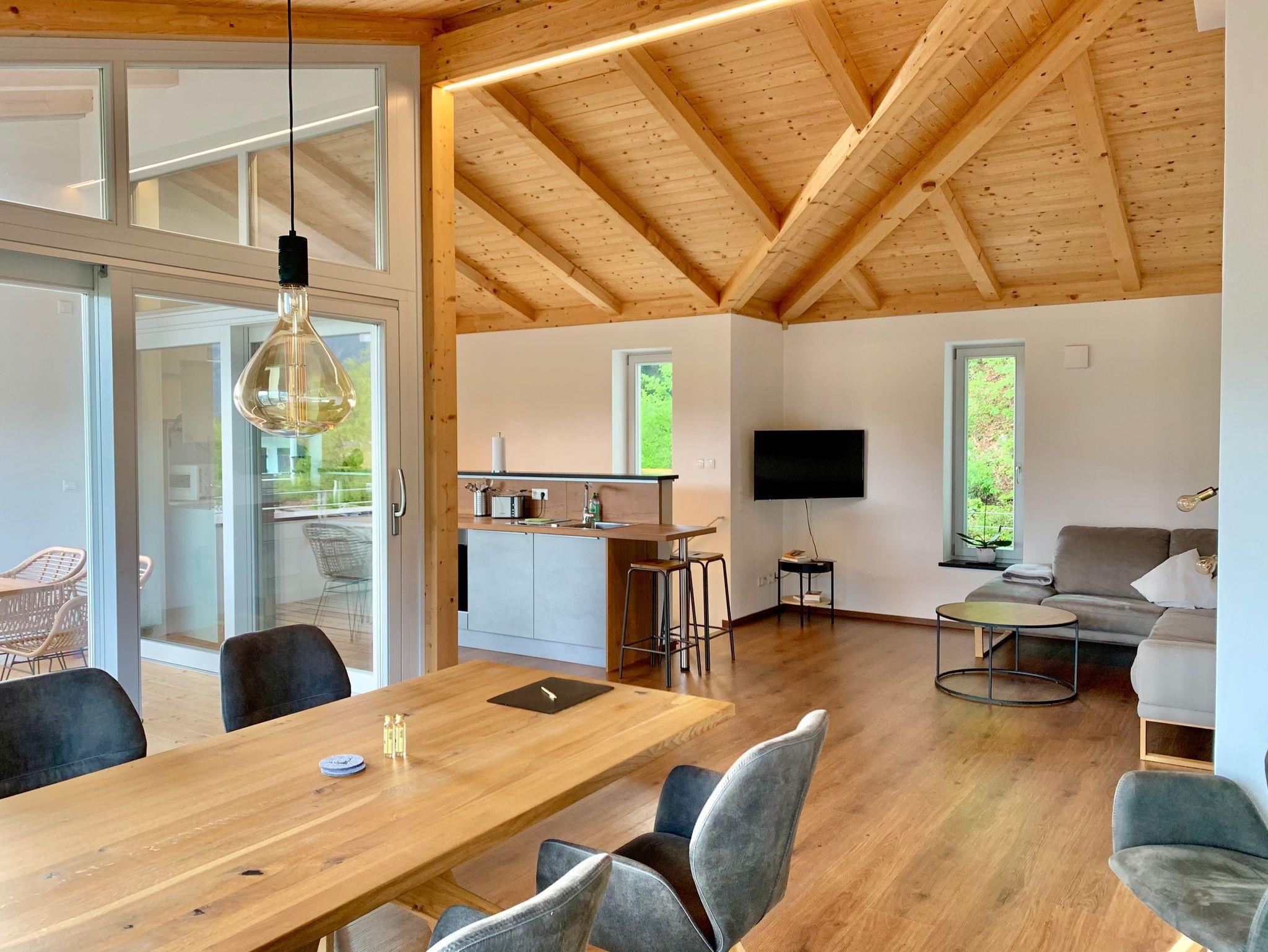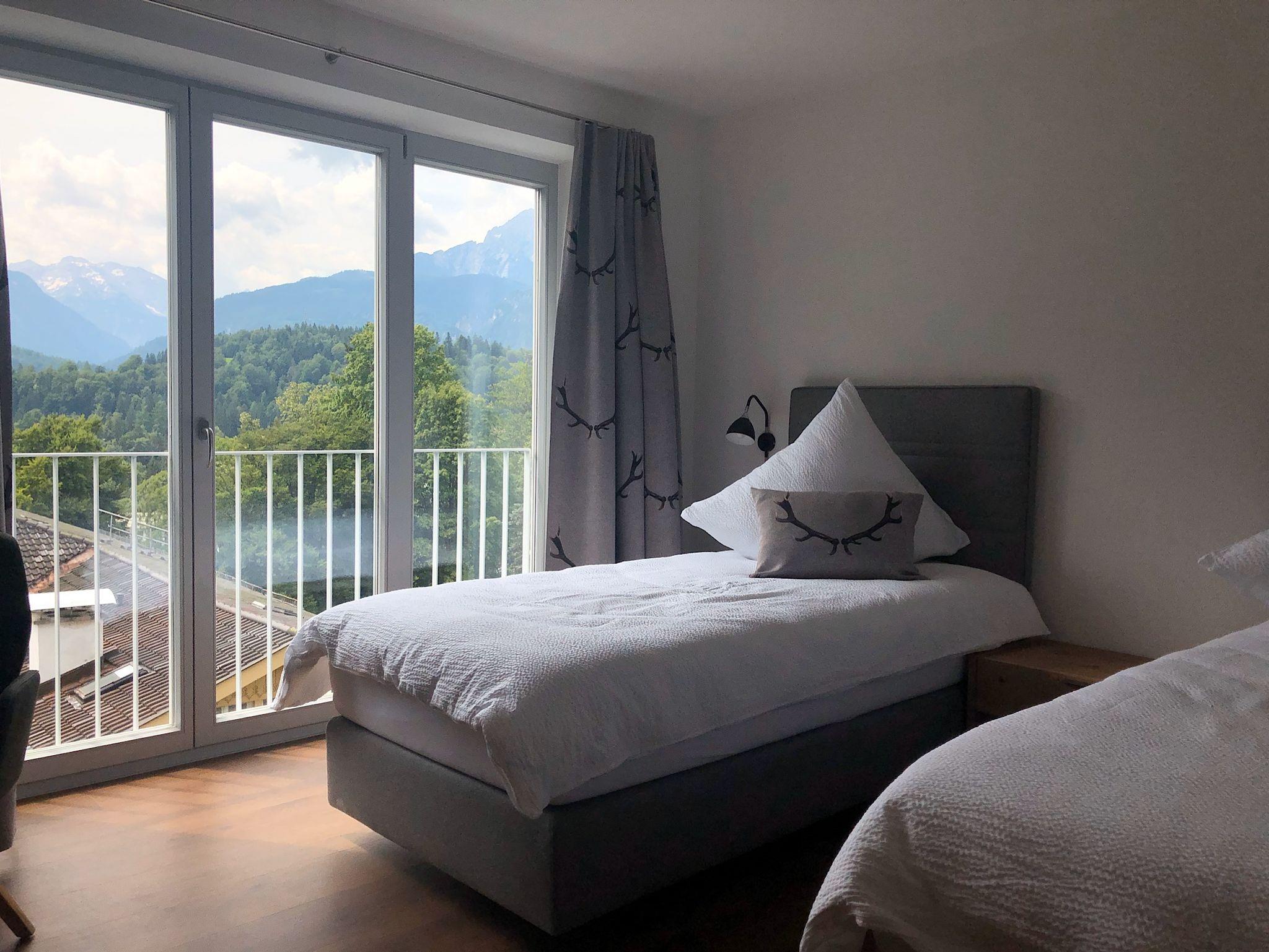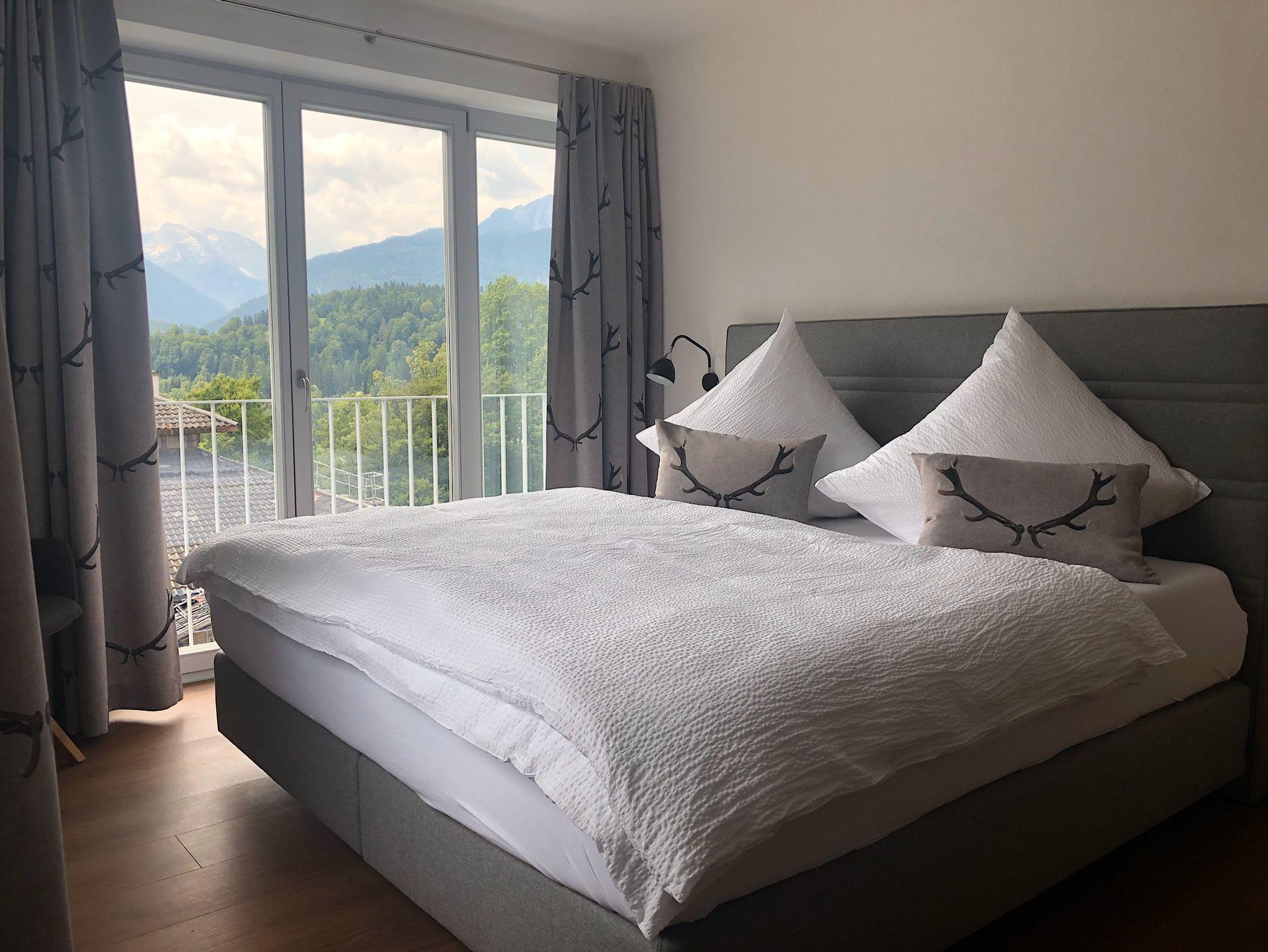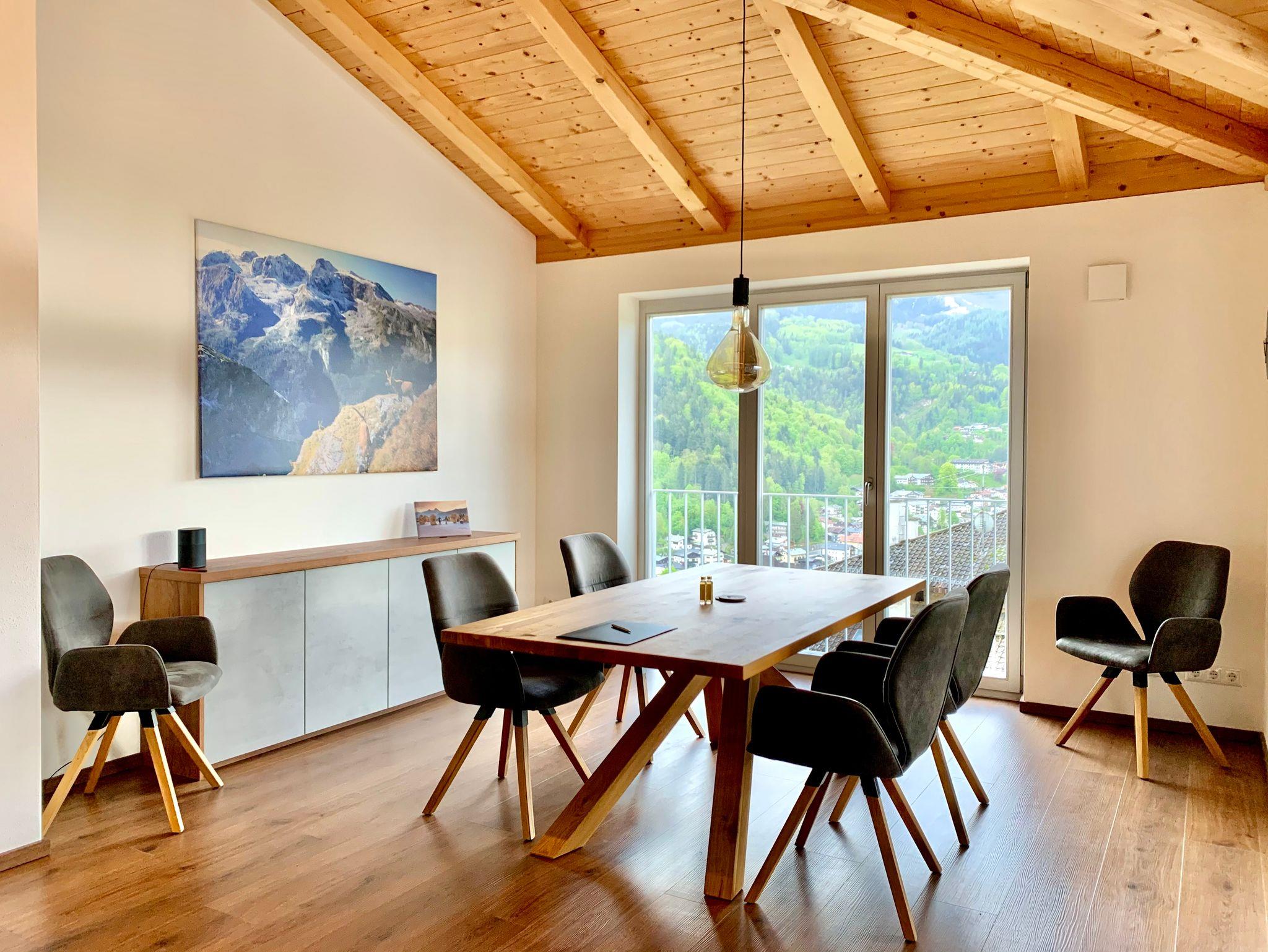 Die Wohnungen sind ca. 100qm groß und für bis zu 4 Personen ausgelegt. Erdgeschoss: Ein Schlafzimmer hat ein großes Boxspring-Doppelbett (2x2m). Im zweiten Schlafzimmer gleicher Größe stehen zwei Boxspring-Einzelbetten und ein Schreibtisch. Im oberen Stockwerk ist der sehr geräumige Wohn- und Essbereich, die offene Küche und die Süd-Loggia. Obwohl das Haus an einem steilen Hang steht ist die Zuwegung vom Parkplatz zur Wohnungshaustüre stufenlos und ohne Steigung. Innerhalb der Wohnung verbindet eine Treppe die beiden Stockwerke. Von allen Zimmern haben Sie einen traumhaften Bergblick. Im ersten Stock naturgemäß noch etwas erhabener als im Erdgeschoss. Das Haus (Erstbezug August 2019) liegt ruhig am Ende einer Sackgasse, aber dennoch zentral in Berchtesgaden. Der Soleleitungsweg, einen ebener Fußweg/Wanderweg über den früher die Sole vom Salzbergwerk zur Saline nach Bad Reichenhall geleitet wurde, führt direkt am Haus vorbei durch den Wald und über Holzstege am Fels. Bergab sind es ins Zentrum zu Fuß nur 5-10 Minuten. Hier finden Sie mehrere Bäcker, Restaurants und alle Einkaufsmöglichkeiten. Es gibt ein abschließbares Radl- und Skihaus, falls Sie Ihre Sportgeräte mitbringen möchten. Unsere beiden Ferienwohnungen haben jeweils einen eigenen Eingang. Man teilt sich keine Gemeinschaftsräume.