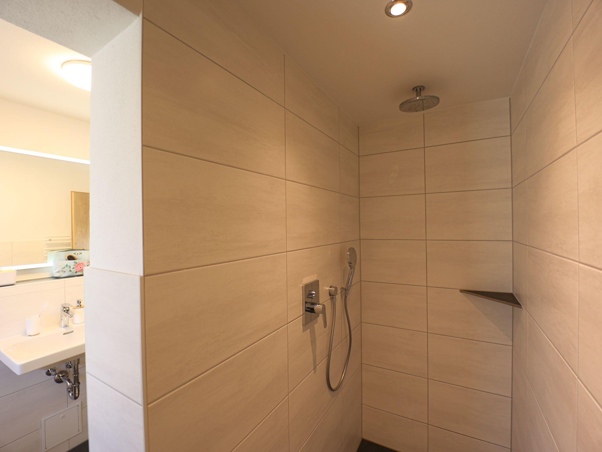 begehbare Regendusche. Haartrockner und Vergrößerungsspiegel vorhanden.