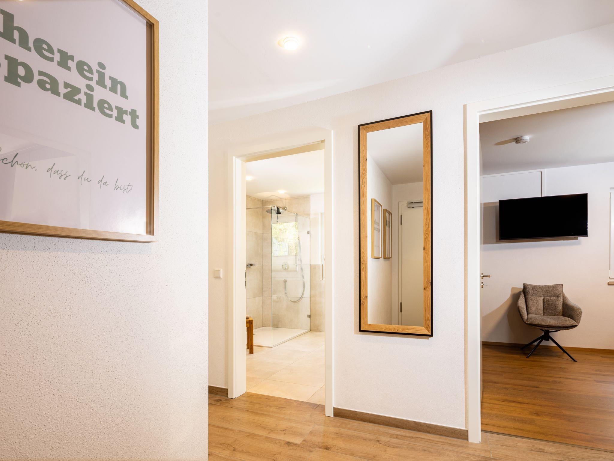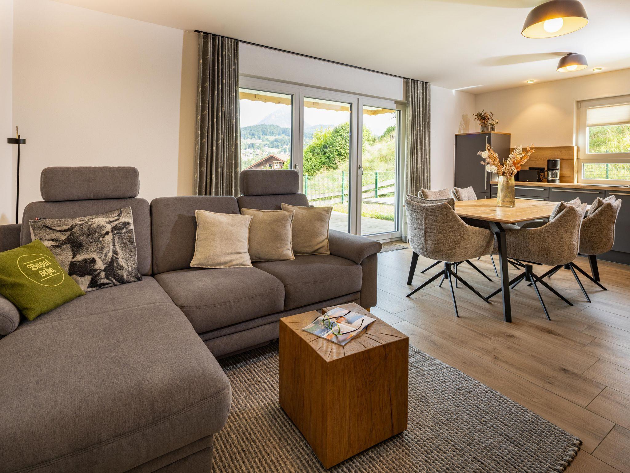Als Neubau ist die **Ferienwohnung Alpenview** modern ausgestattet. Dazu gehören hochwertige Materialien, Fußbodenheizung und eine zeitgemäße technische Ausstattung. Ein Stellplatz in der Tiefgarage ist ebenfalls vorhanden, und der Zugang zur Wohnung erfolgt barrierefrei über den Haupteingang.