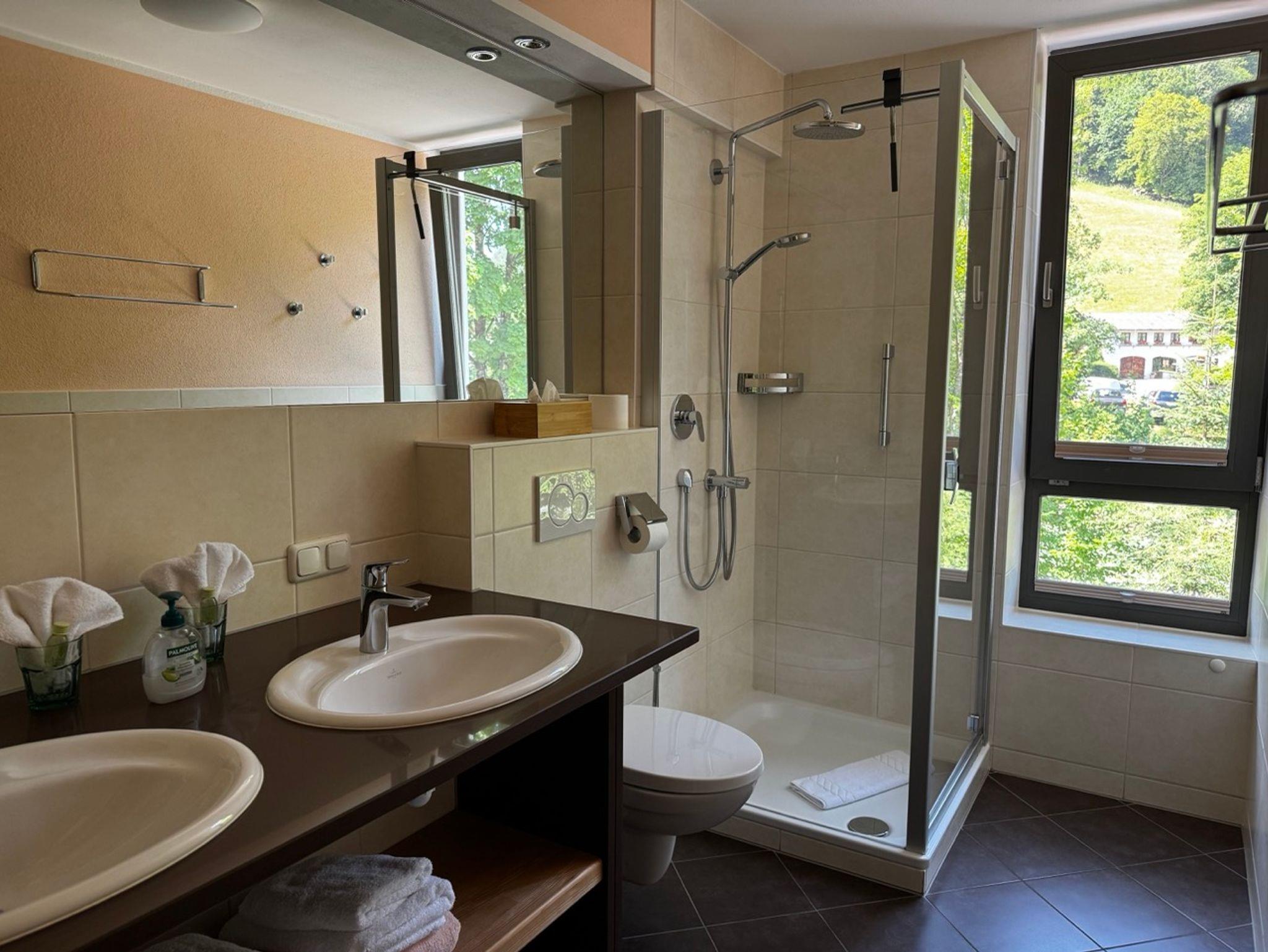Die Badezimmer haben alle eine Dusche. Das New Eagle Doppelzimmer und unser Hochthron hat zusätzlich je eine Badewanne.