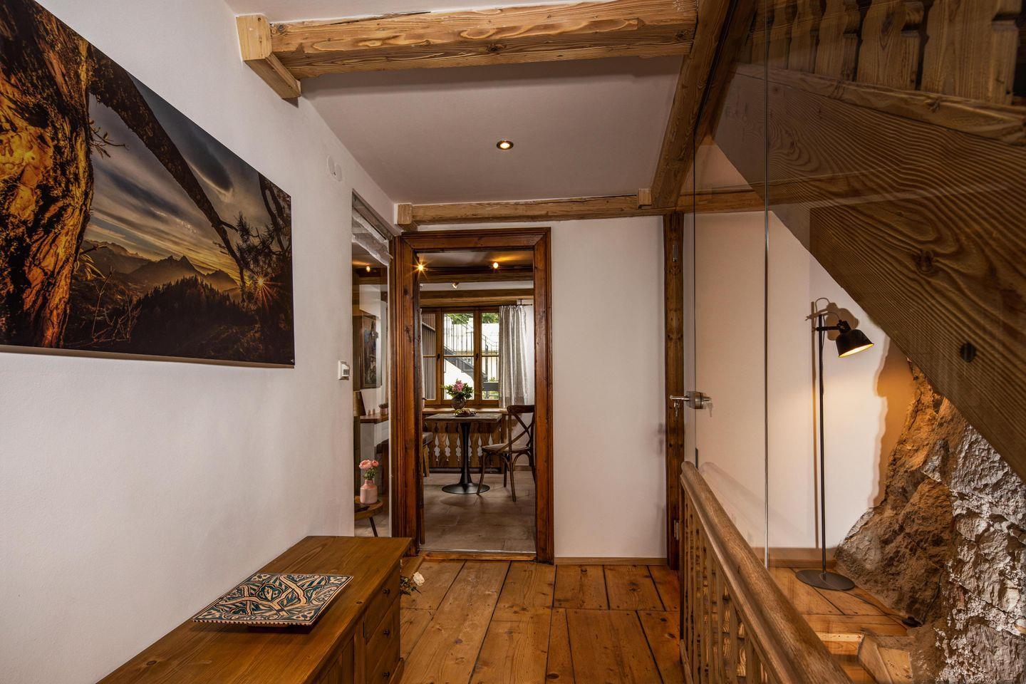 Im großen Wohnzimmer mit Flachbild-TV lädt die Lodencouch und eine Relaxliege zum gemütlichen Fernsehen oder Lesen nach einem erlebnisreichen Tag in Berchtesgaden ein. Das Zusammenspiel aus historischen Bauteilen wie der Holztramdecke aus dem Jahr 1631 und dem modernem Einrichtungsstil schafft eine ganz besondere Atmosphäre und ein einmaliges Wohngefühl.